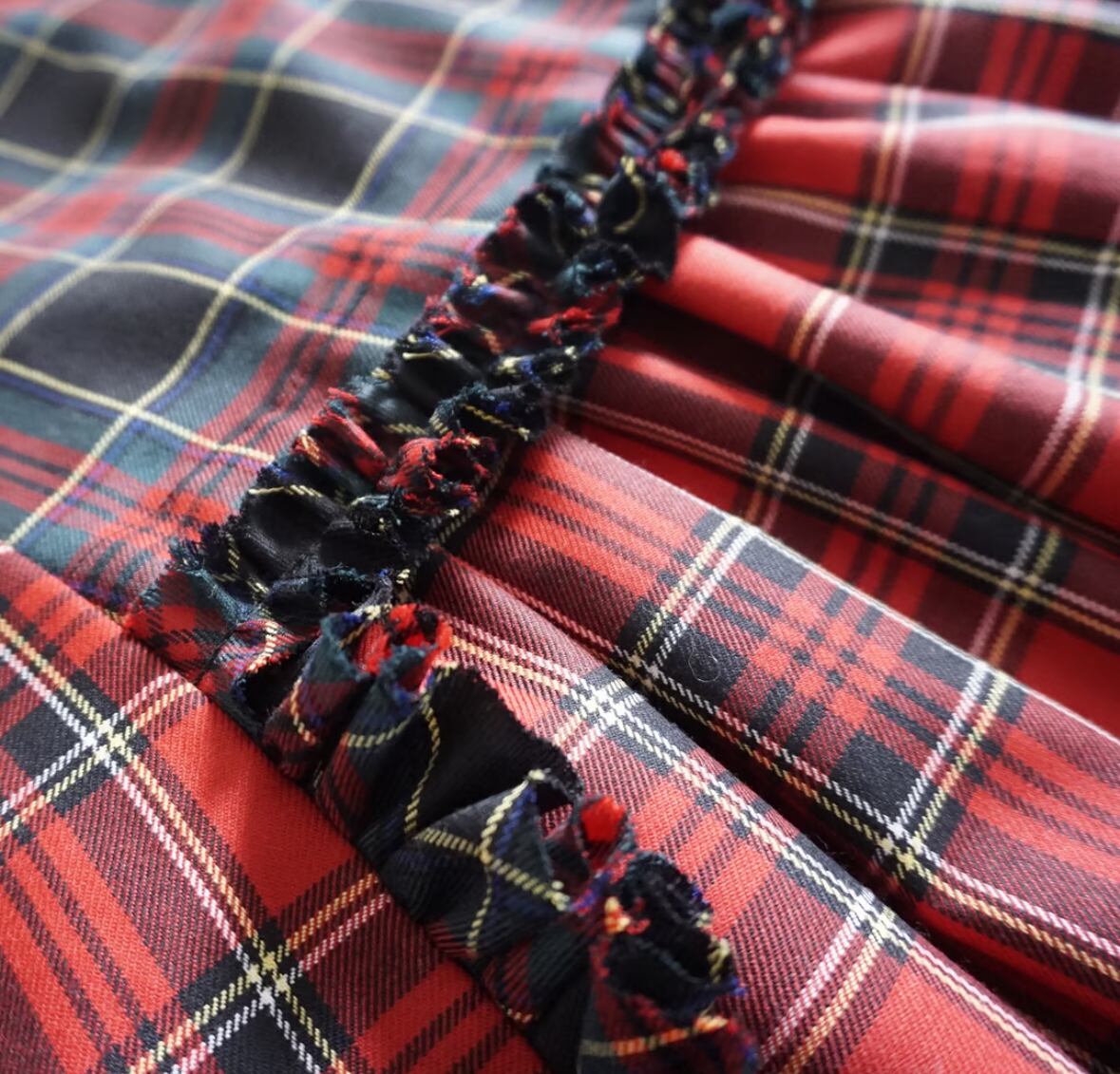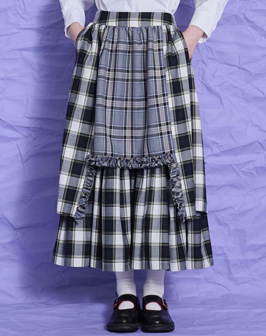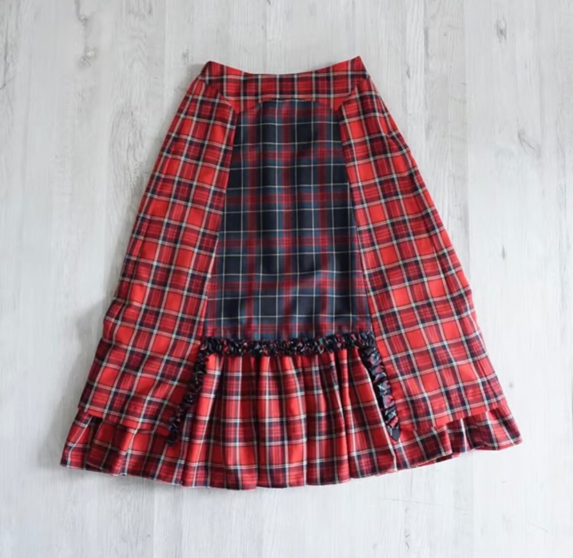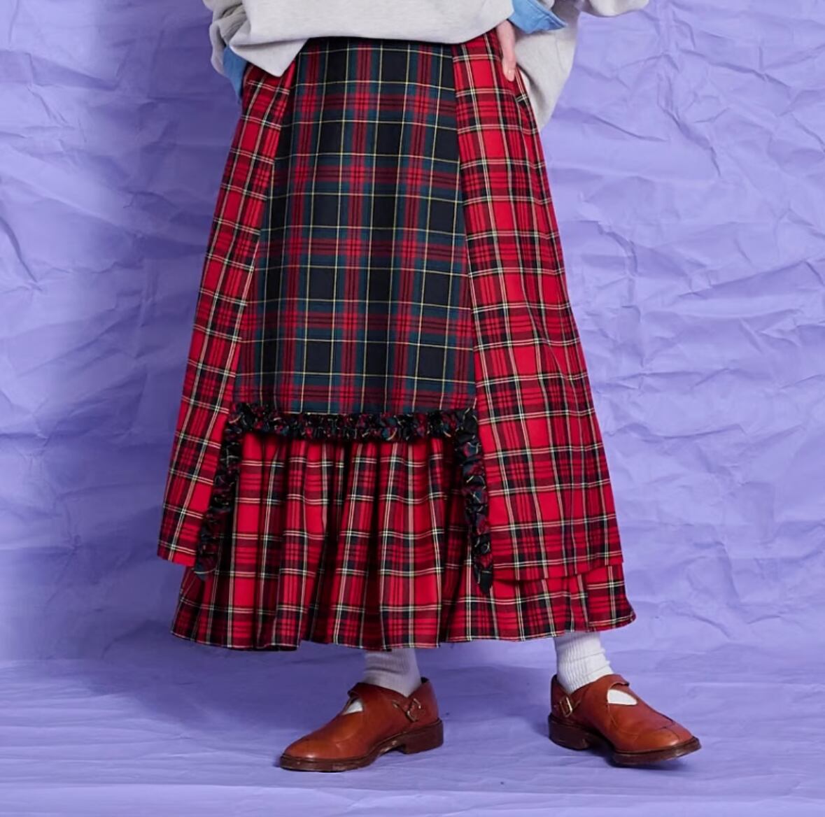 少し技巧的なデザインのスカートです。スカートのデザインバリエーションはとても難しくていつも唸りながら絞り出して、なんとなくヒット、と自分では思っていますが、今回はとても気に入りました。オリジナル感が非常に高い2枚重ね、2つのタータンチェックを重ね合わせて作りました。