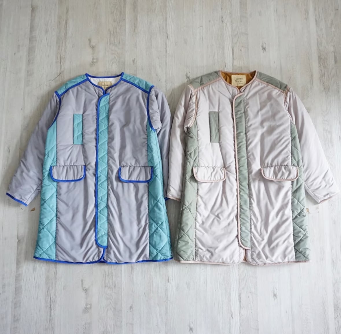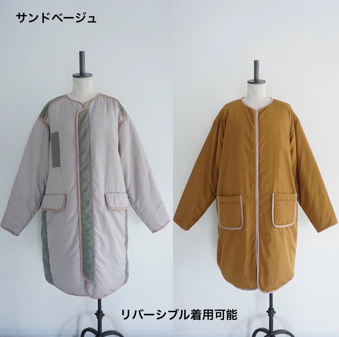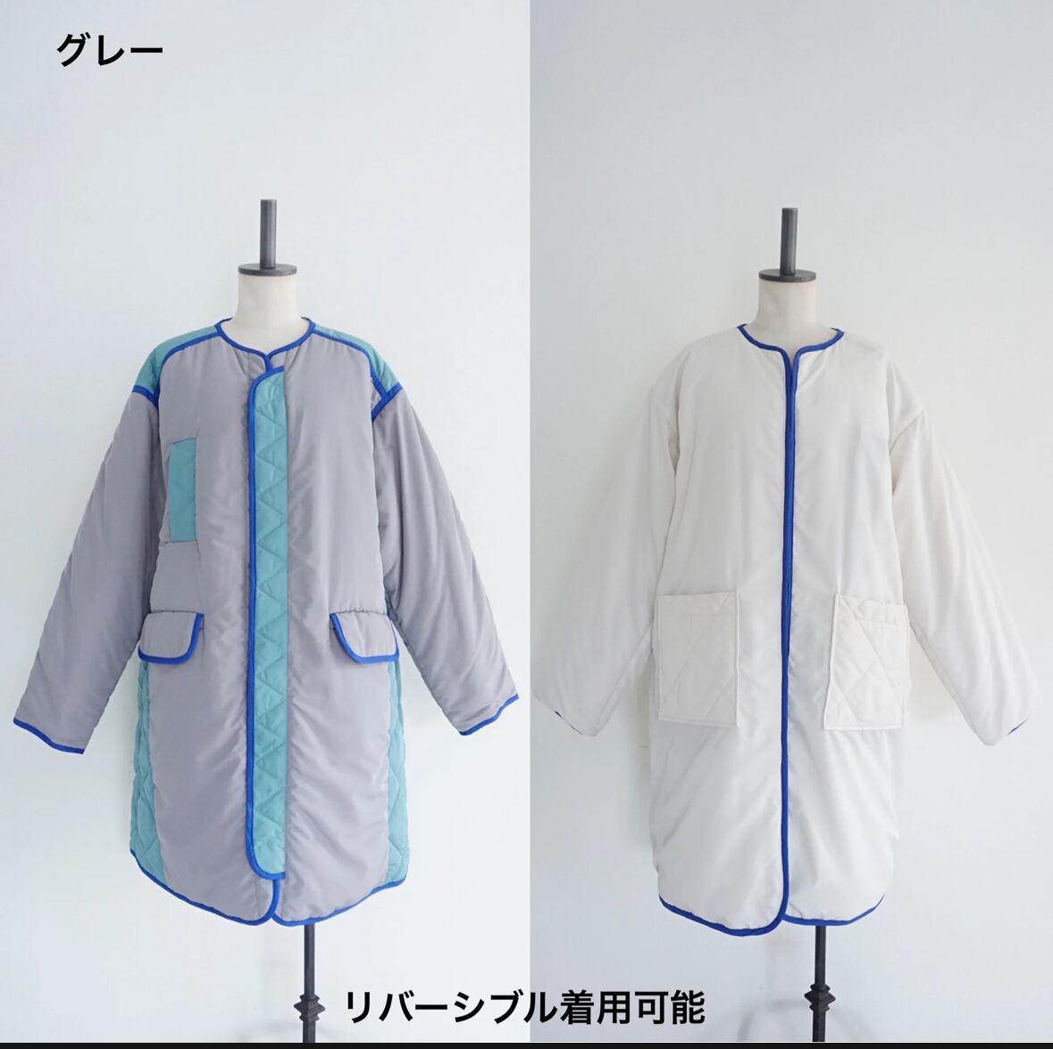 蓄熱の中綿入りのキルティングコートは毎年好評で、今回はパワーアップしたグラフィック入りのコートを作りました。着丈が長めでオーバーサイズです。サンプルはグレー(ブルー)が正しいサイズサンプルで、サンドベージュはカラー見本になります。細かい部分に変更が入っていますので、ベージュはカラーの参考にしてみていただけると良いかと思います。