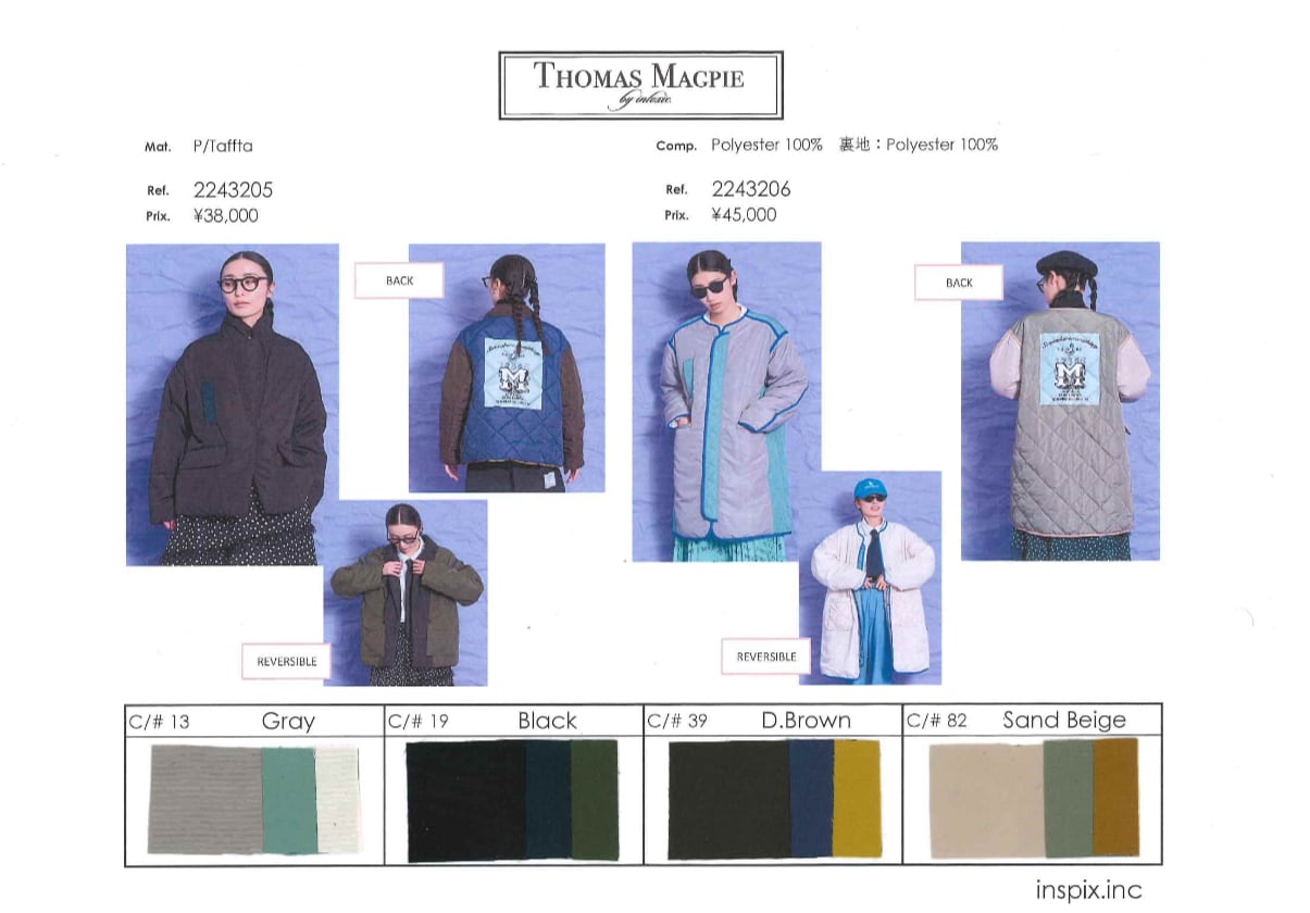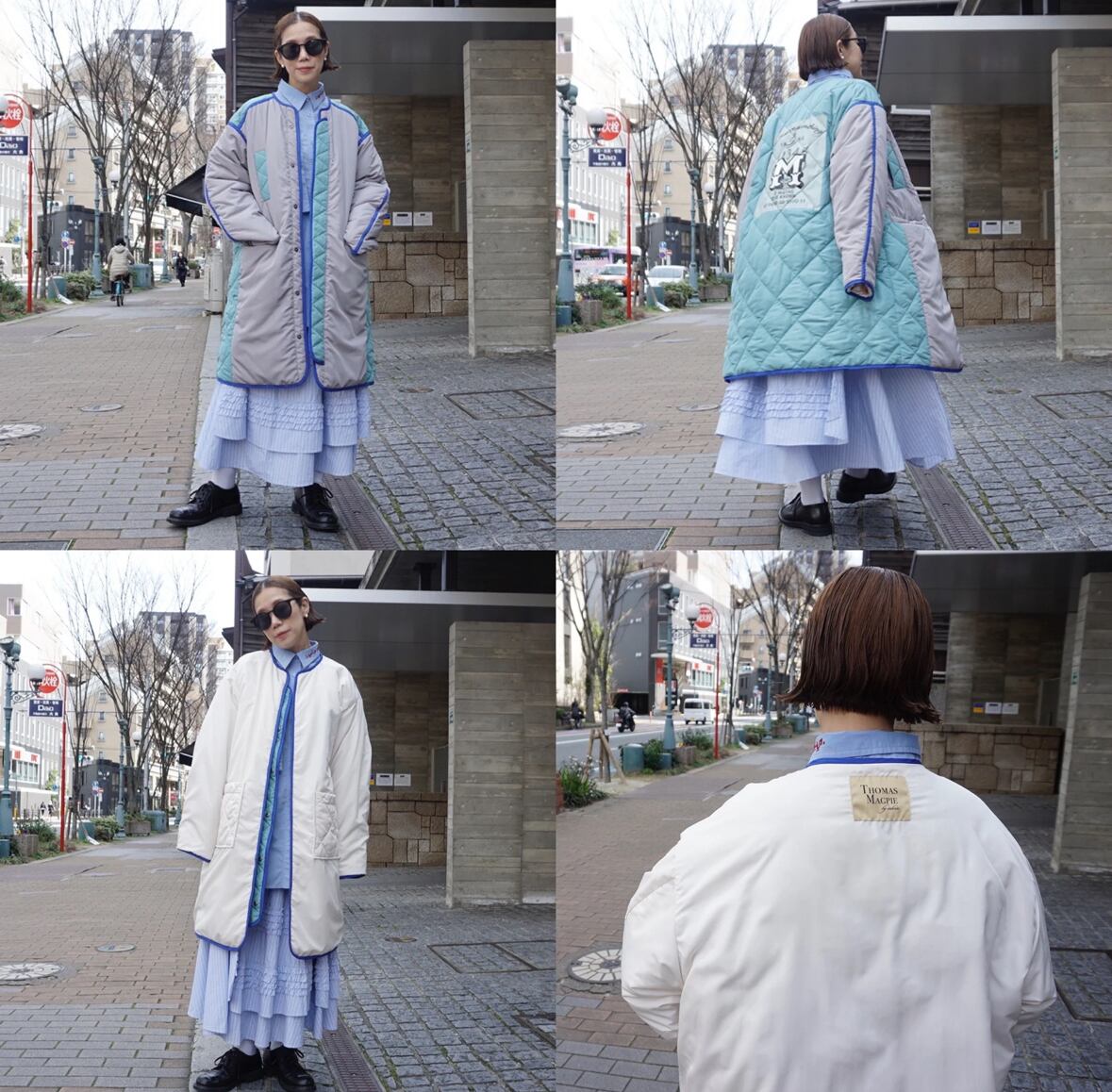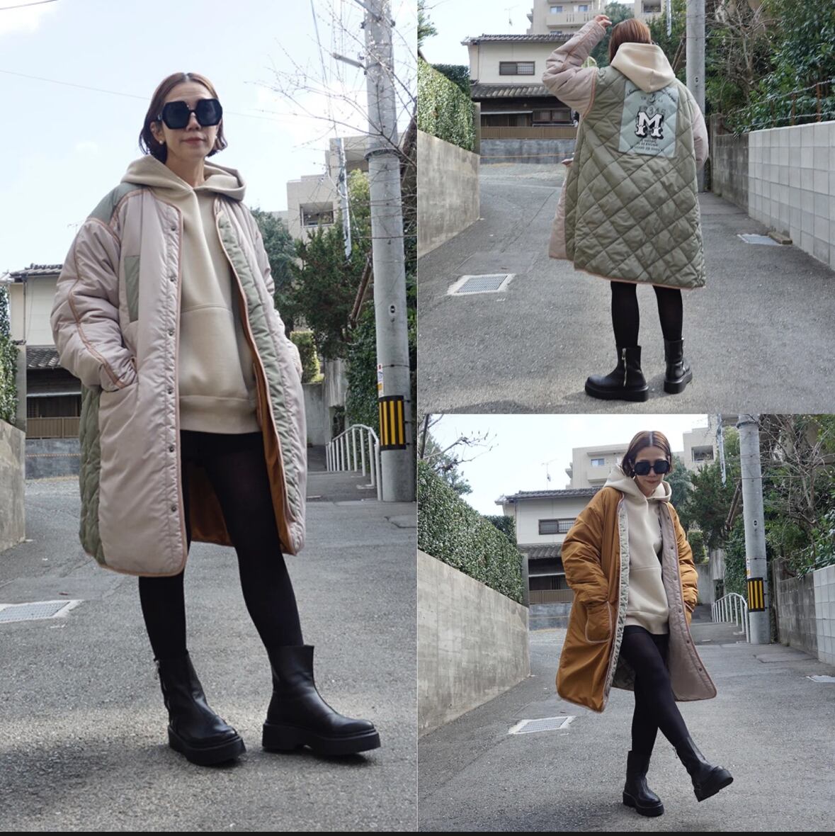 蓄熱の中綿入りのキルティングコートは毎年好評で、今回はパワーアップしたグラフィック入りのコートを作りました。着丈が長めでオーバーサイズです。サンプルはグレー(ブルー)が正しいサイズサンプルで、サンドベージュはカラー見本になります。細かい部分に変更が入っていますので、ベージュはカラーの参考にしてみていただけると良いかと思います。