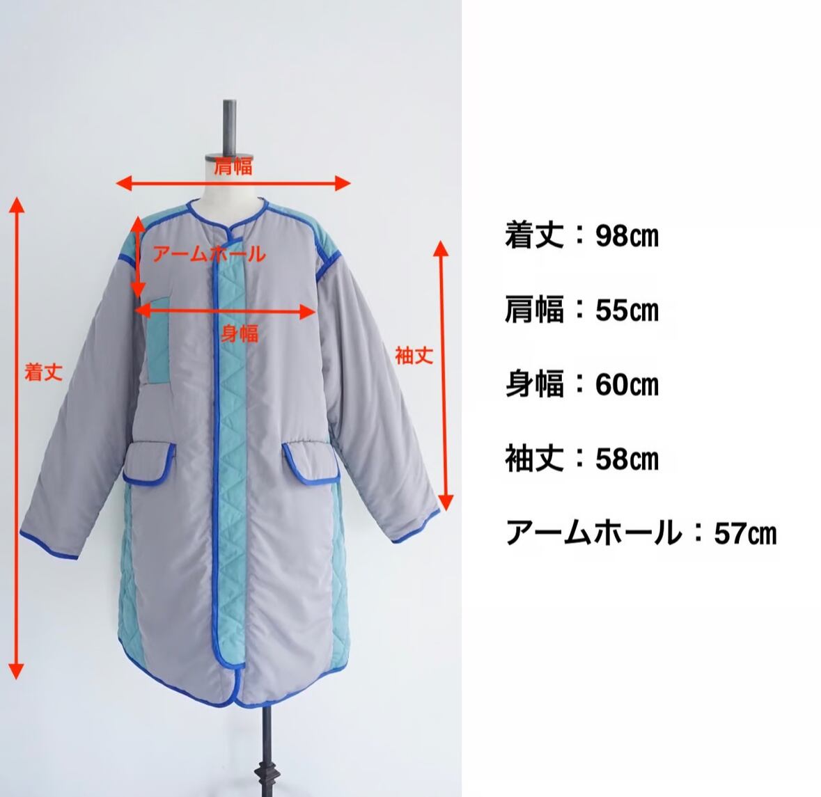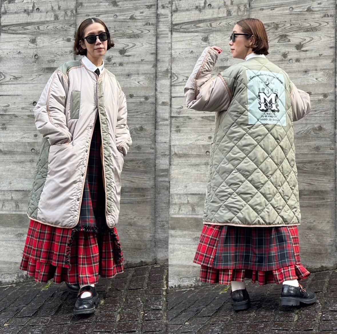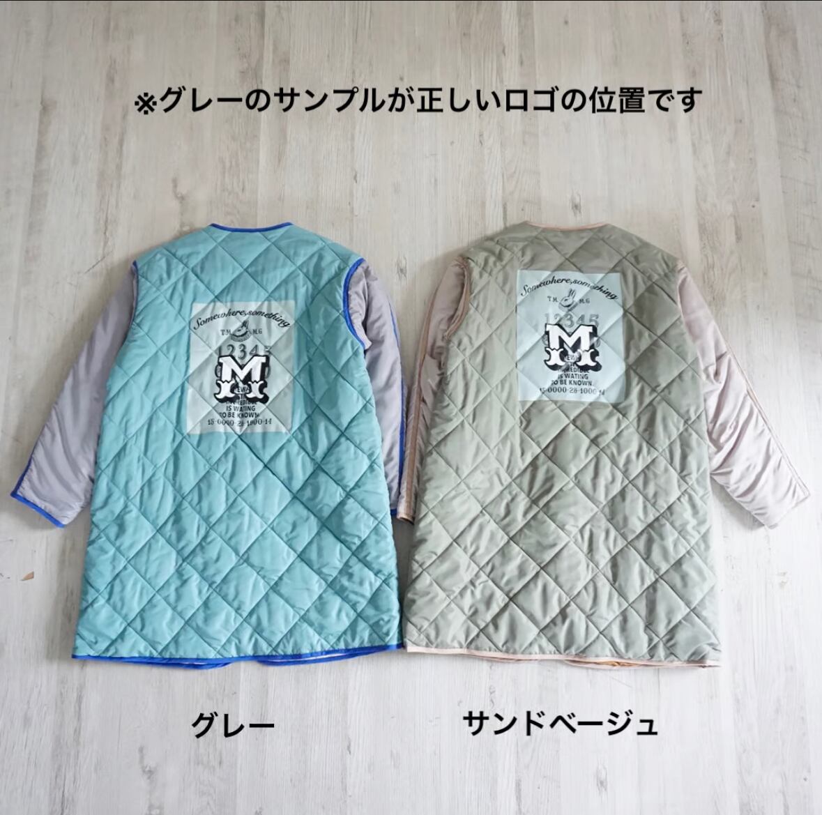 プリントなどを入れてしまった為に、作業工程が増えてしまい、少しお値段が上がってしまいましたが、キルティングにプリントが入っているこのようなコートはあまり見かけないため、とても気に入っています。このコートを着て、どこか素敵な所へ行けますように。