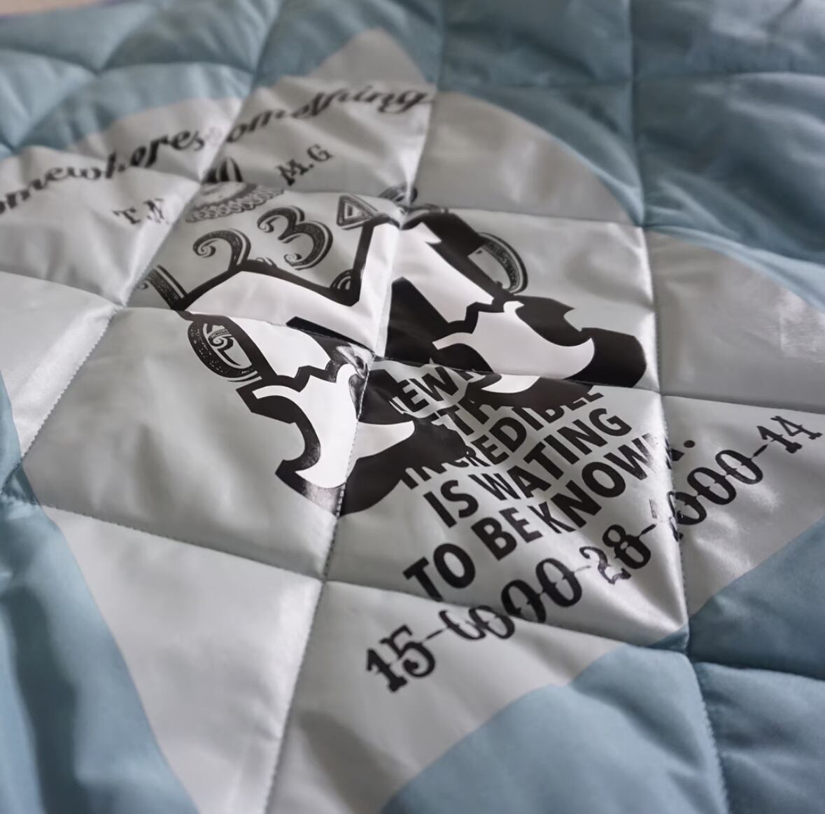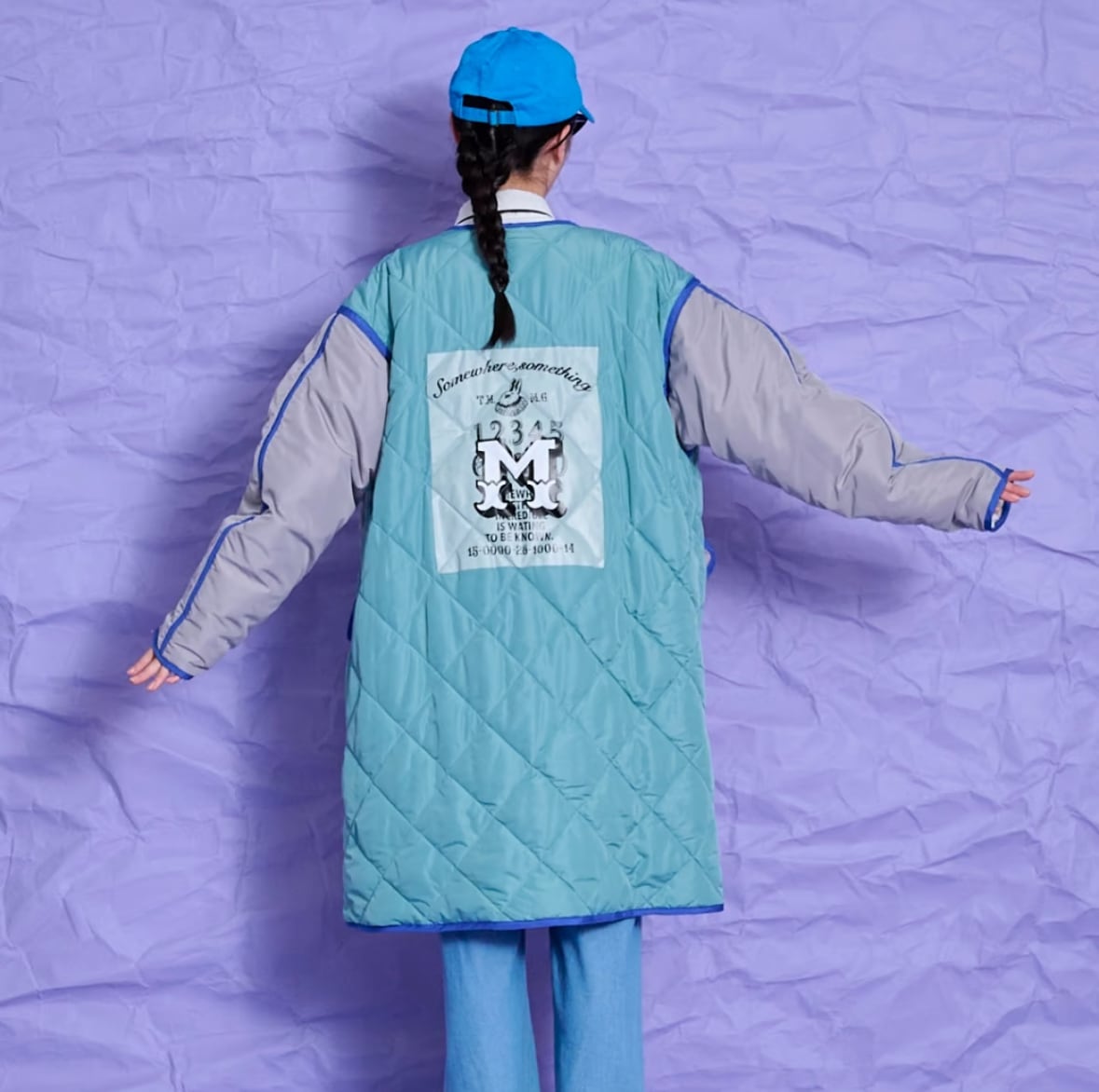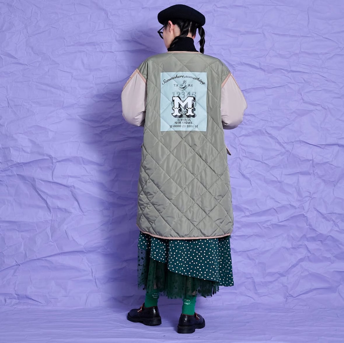 プリントなどを入れてしまった為に、作業工程が増えてしまい、少しお値段が上がってしまいましたが、キルティングにプリントが入っているこのようなコートはあまり見かけないため、とても気に入っています。このコートを着て、どこか素敵な所へ行けますように。