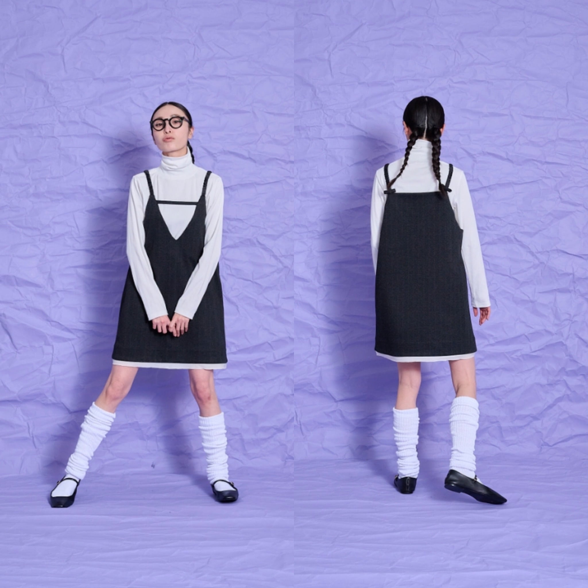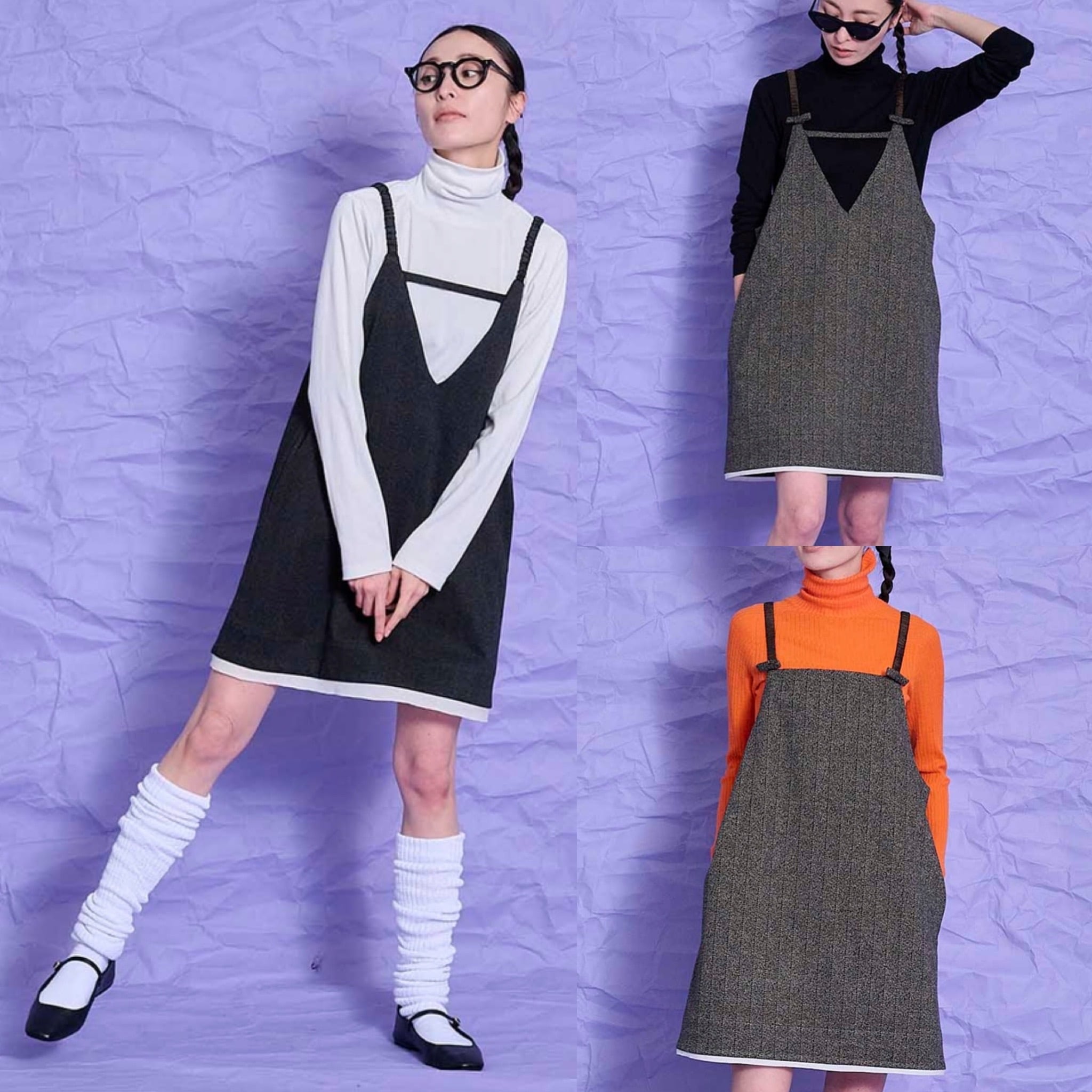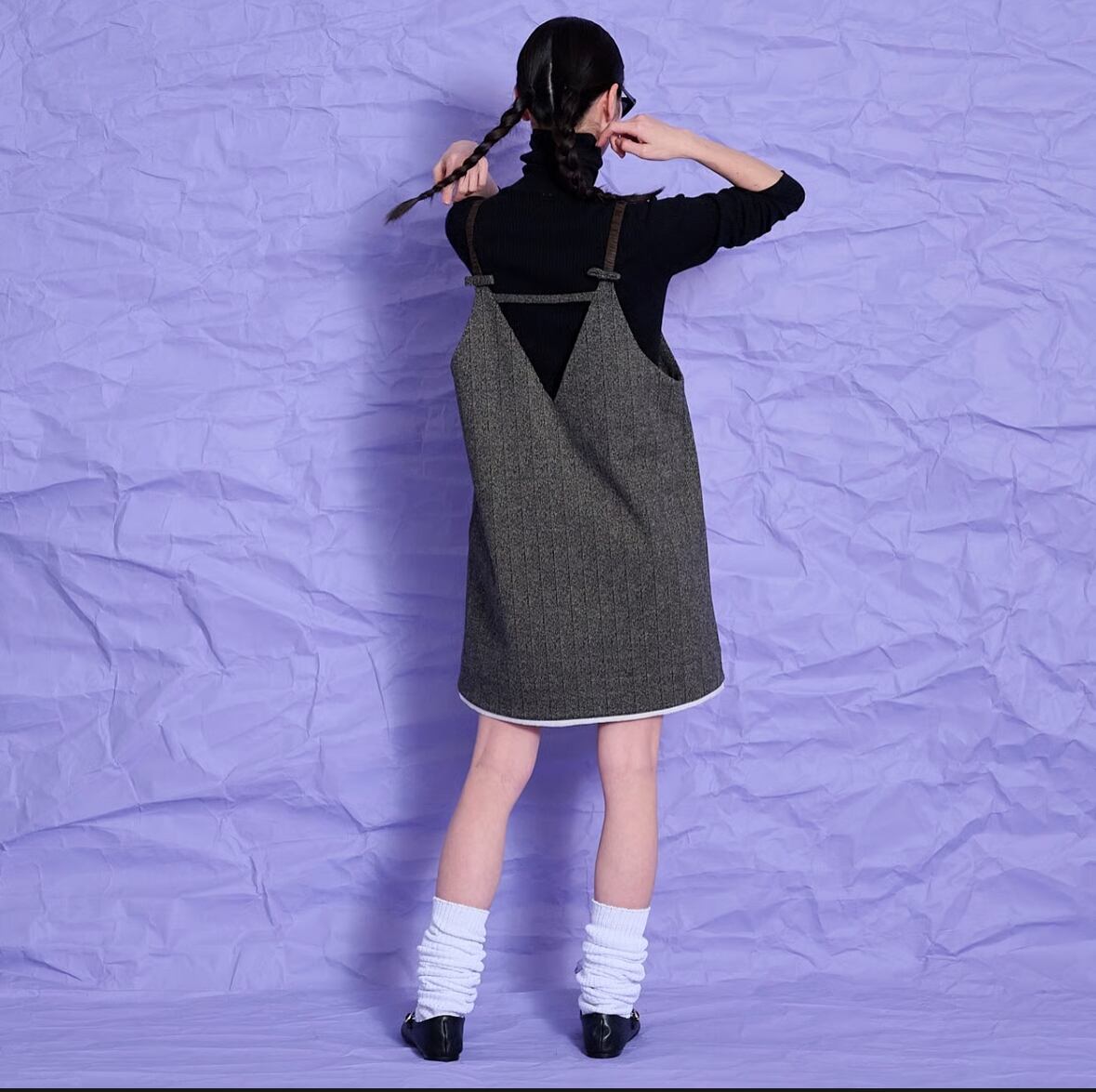 2WAYのストレッチヘリンボーンのミニドレスを作りました。ミニドレスとしても、チュニック風にパンツなどを合わせても着丈のバランスが取れる長さにしてみました。膝上丈にしています。変化を楽しめる様に前後ろ逆にも着用可能です。ストラップは調節はできませんがシャーリングしたゴム仕様で肩からズレにくい作りにしました。ウールではないためさらりと着やすい素材感。身頃が大きめの為、インナーに薄い素材だけでなく、ニットなどを合わせても着ることができます。フロントに小さめのリボンを付けました。このリボンはは小さなゴムでセッティングしていて動くようにしています。前後逆にした時にもリボンを後ろに付けることが可能です。いつもデザインする際にこのお洋服を購入した方が、楽しめる仕様は何かなと考えながらデザインを考えています。またチュニック丈なので、ボトムを入れても着用可能。パンツとも相性が良いので、甘い雰囲気がお好みではない日はパンツを合わせても楽しめます。お勧めは、同時に予約を受付している、ドットのチュールスカート。今シーズンはボトムシアーが流行しているので、裏地なしの重ね着でシアーを楽しめるスカートを作っています。