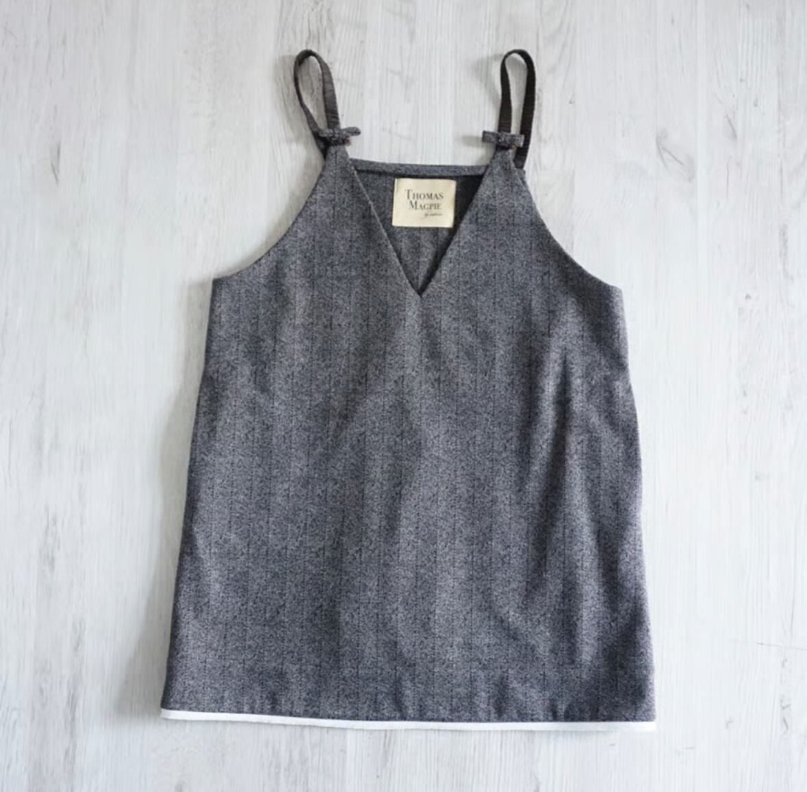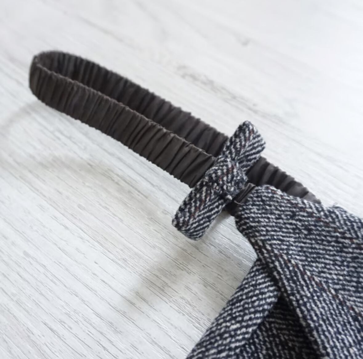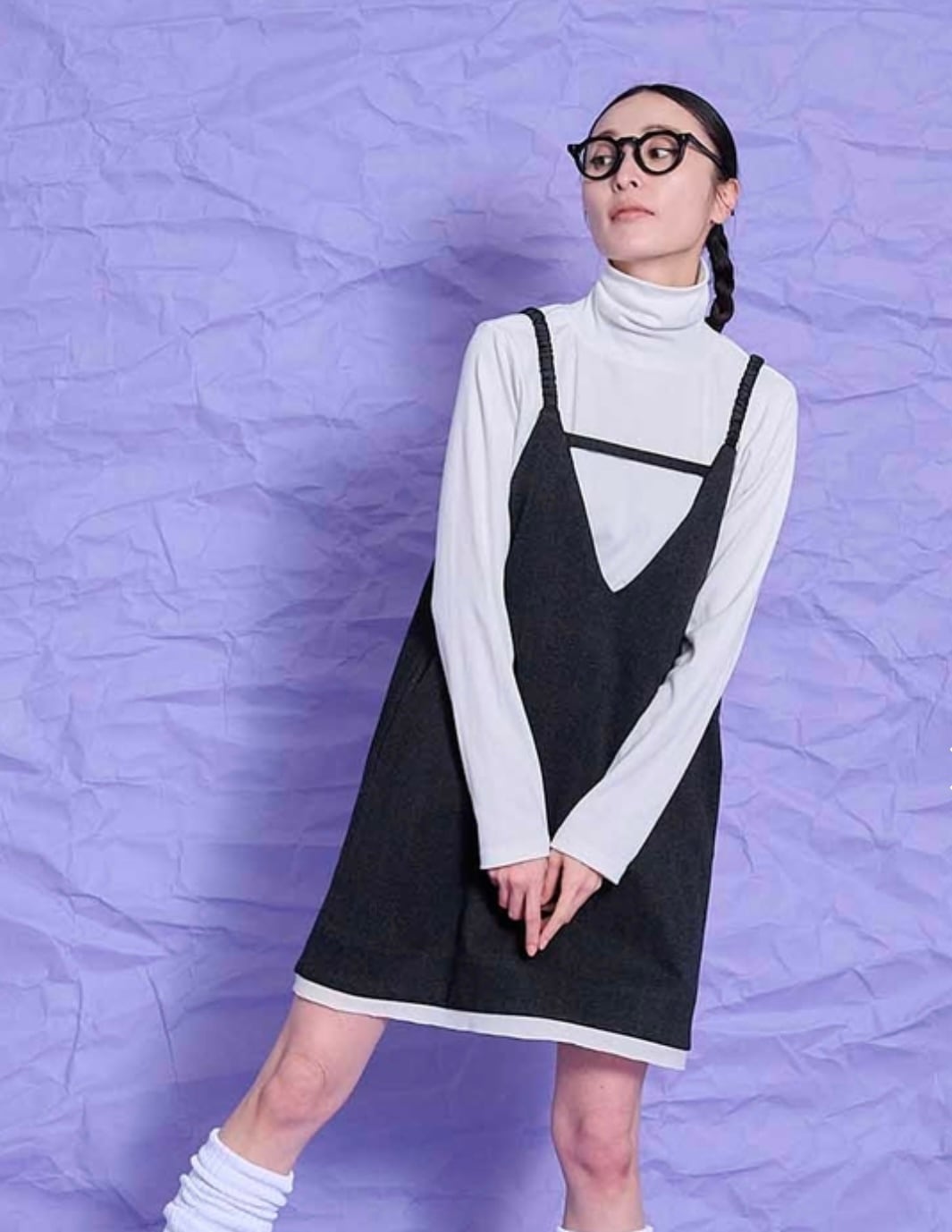 2WAYのストレッチヘリンボーンのミニドレスを作りました。ミニドレスとしても、チュニック風にパンツなどを合わせても着丈のバランスが取れる長さにしてみました。膝上丈にしています。変化を楽しめる様に前後ろ逆にも着用可能です。ストラップは調節はできませんがシャーリングしたゴム仕様で肩からズレにくい作りにしました。ウールではないためさらりと着やすい素材感。身頃が大きめの為、インナーに薄い素材だけでなく、ニットなどを合わせても着ることができます。フロントに小さめのリボンを付けました。このリボンはは小さなゴムでセッティングしていて動くようにしています。前後逆にした時にもリボンを後ろに付けることが可能です。いつもデザインする際にこのお洋服を購入した方が、楽しめる仕様は何かなと考えながらデザインを考えています。またチュニック丈なので、ボトムを入れても着用可能。パンツとも相性が良いので、甘い雰囲気がお好みではない日はパンツを合わせても楽しめます。お勧めは、同時に予約を受付している、ドットのチュールスカート。今シーズンはボトムシアーが流行しているので、裏地なしの重ね着でシアーを楽しめるスカートを作っています。
