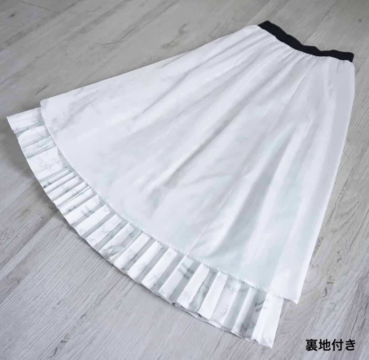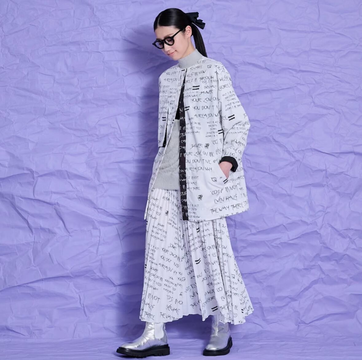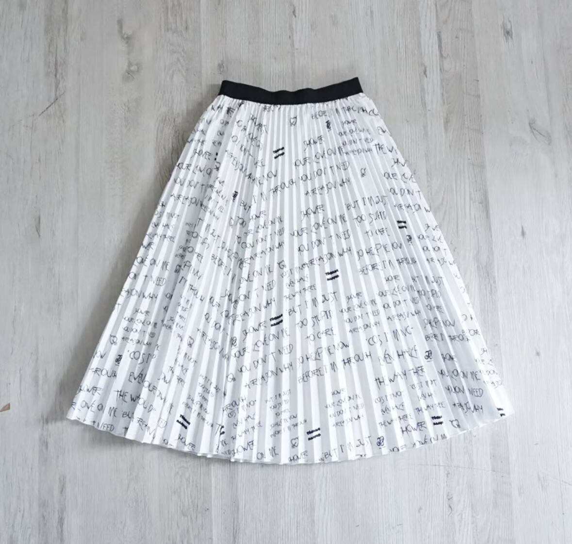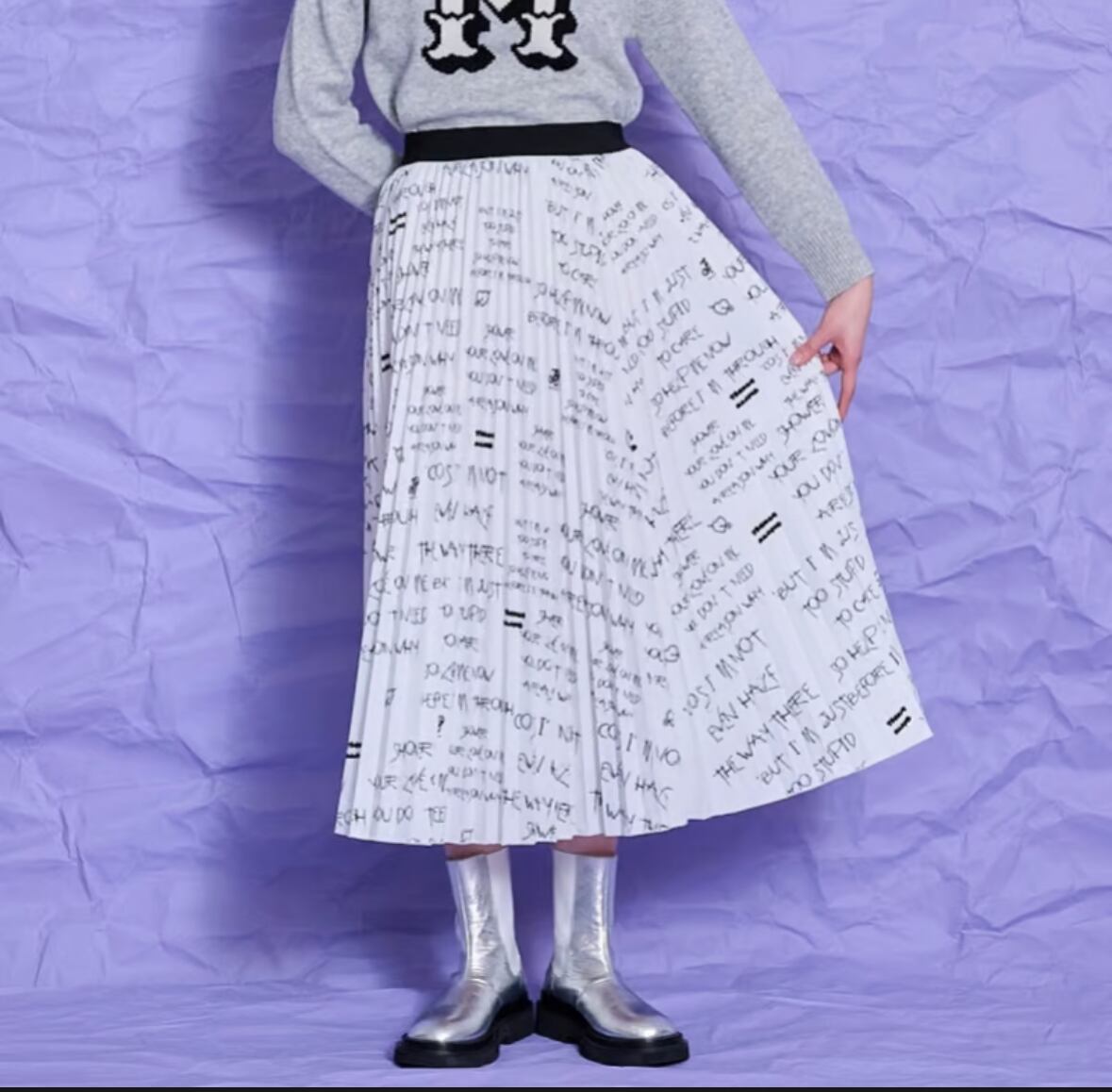 いつものプリーツスカート。今回は少し短めの丈にしています。38サイズで85cm(着用サンプルサイズ)36サイズは5cm短くなり、80cmになります。ウエストはゴムベルトですので、着丈の好みで選んでいただいても良いかと思います。プリーツの広がりは、38サイズの方が広く、エレガントな印象になります。素材はハリのあるポリエステルで少し厚めの素材にしました。ハリのある素材にする事で、歩いた時に広がりがあり、たゆみが少なく直線的なシルエットが出来るところが気に入っています。安定的に人気のプリーツですが、今回は使いやすいホワイトにブラックのロゴの合わせやすいカラーを紹介します。何にでも合わせやすく使いやすくて、ほっそり見えるシルエットが人気の秘密です。