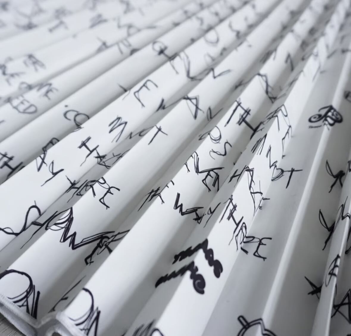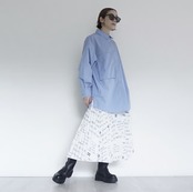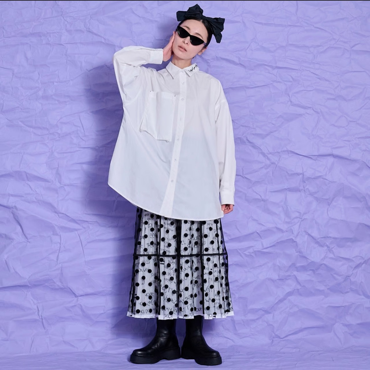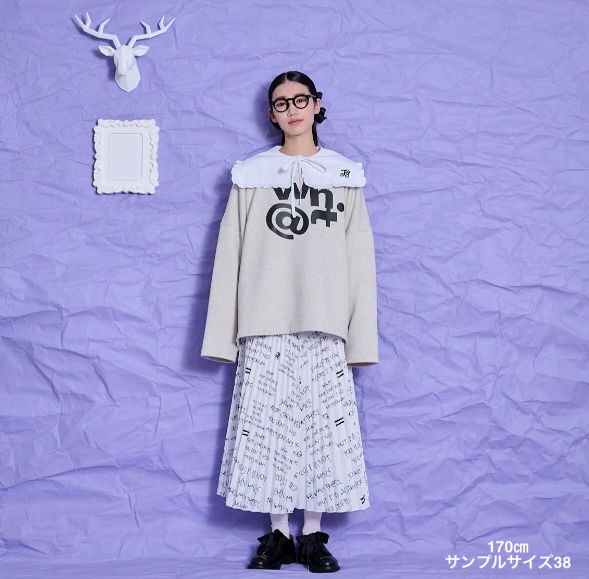 いつものプリーツスカート。今回は少し短めの丈にしています。38サイズで85cm(着用サンプルサイズ)36サイズは5cm短くなり、80cmになります。ウエストはゴムベルトですので、着丈の好みで選んでいただいても良いかと思います。プリーツの広がりは、38サイズの方が広く、エレガントな印象になります。素材はハリのあるポリエステルで少し厚めの素材にしました。ハリのある素材にする事で、歩いた時に広がりがあり、たゆみが少なく直線的なシルエットが出来るところが気に入っています。安定的に人気のプリーツですが、今回は使いやすいホワイトにブラックのロゴの合わせやすいカラーを紹介します。何にでも合わせやすく使いやすくて、ほっそり見えるシルエットが人気の秘密です。