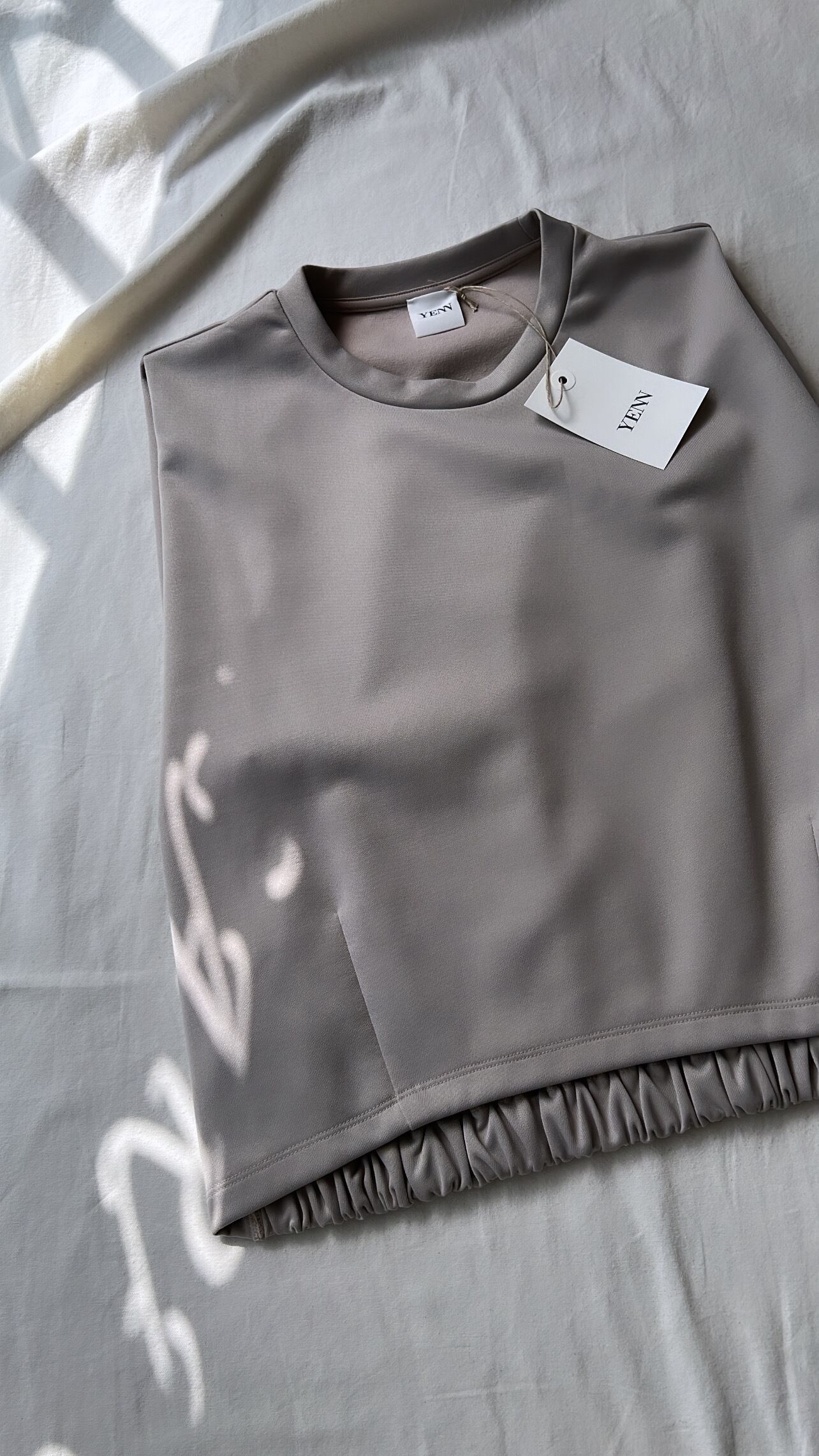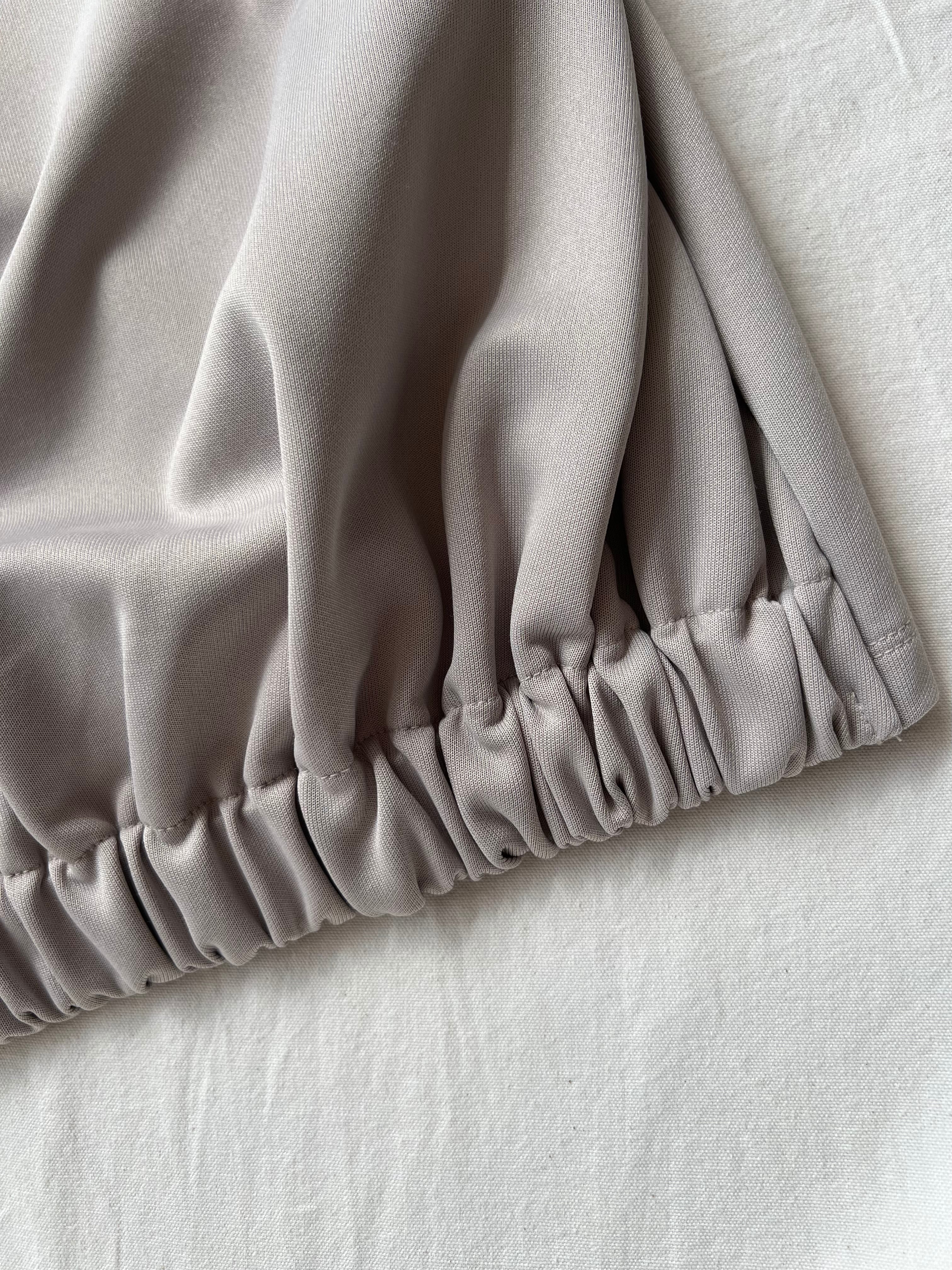 素材のハリ感を活かした、裾でブラウジングさせて作るバルーンシルエットの膨らみがポイントの