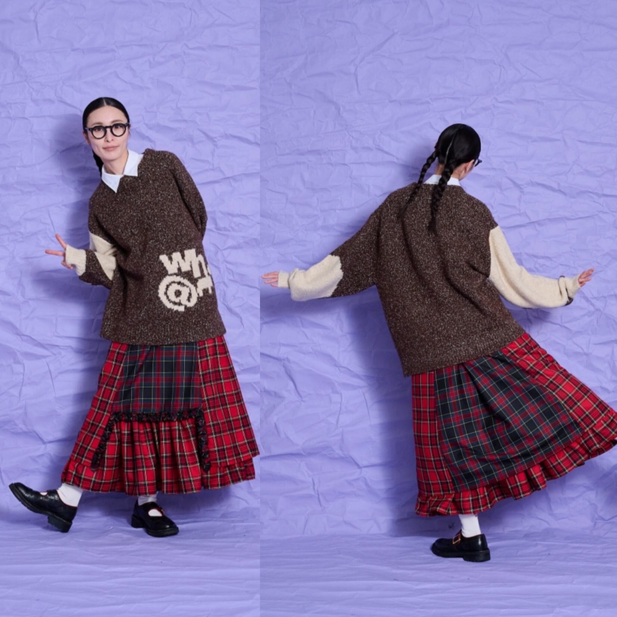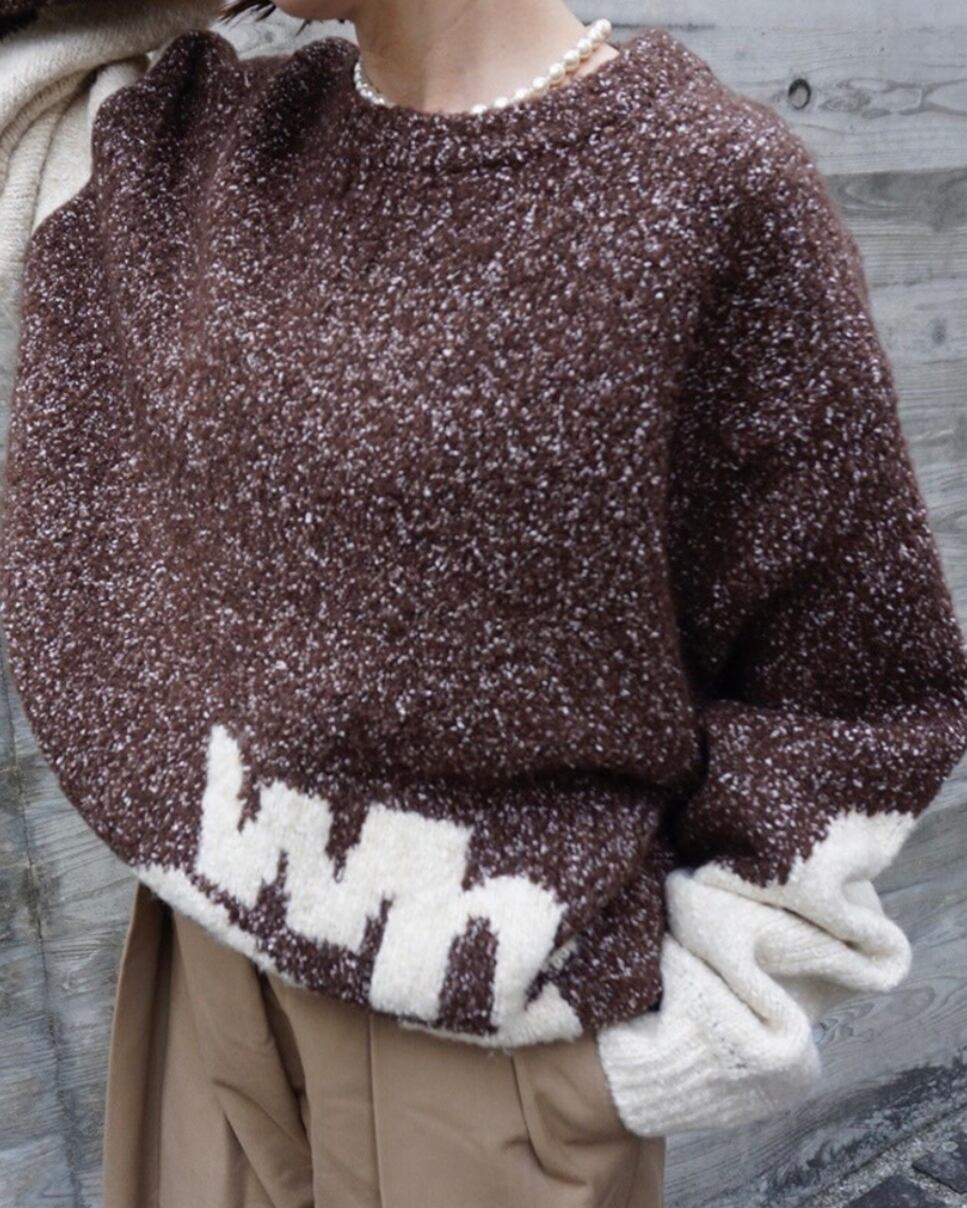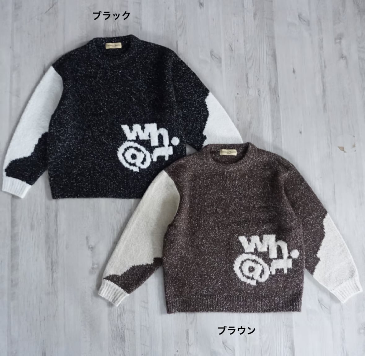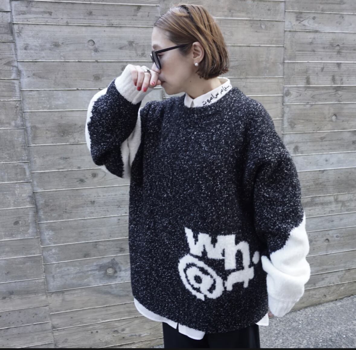 オーバーサイズのニットです。このニットはアクリル、ポリエステル、レーヨン、ウールなどのミックス素材でウールのガシガシした感触はありません。割とソフトタッチでとても着やすいと思います。また糸自体が少し重みがあるので下に下がって見えてほっそり効果が見られると思います。糸自体はふわふわもちもちしていて暖かなタッチです。ぎちぎちの編み地ではないので風が少し通ります。タッチは暖かですが、オールウールのように暖かいというほどではない気がします。真冬はヒート素材のインナーを入れて着用してください。長く着ることができます。秋口から着る事ができるので長い期間着用できます。毛足が長い毛と短い毛のミックス感があり糸が可愛いのではないかと思います。このニットはスタッフに大好評で可愛いと人気だったので予約商品になりました。オーバーサイズのサイズ感が好評でした。首回りのリブはダブルにしていて、ふっくら、しっかりとしています。私の手描きしたランダムな配色がとても気に入っています。カラーはブラックとブラウン。ブラックはホワイトのコンビネーション。ブラウンはベージュとのコンビです。前身頃のサイド下にWH@Tと入っています。今回はロゴに、5W1Hの言葉を多用しています。どこでも、なんでも、など、疑問詞を入れていてテーマに沿ってロゴを作ってみました。スタッフにはロゴの入り方が気に入っている、というコメントがありました。身頃の斜め下、中途半端な場所に入れていて、いつもとはちょっと違った雰囲気が良かったのかな?と思います。