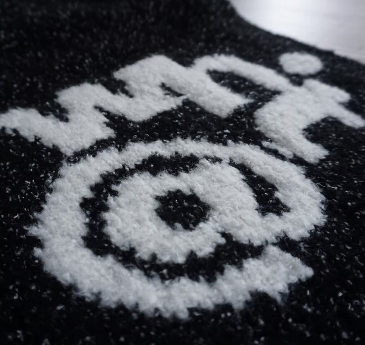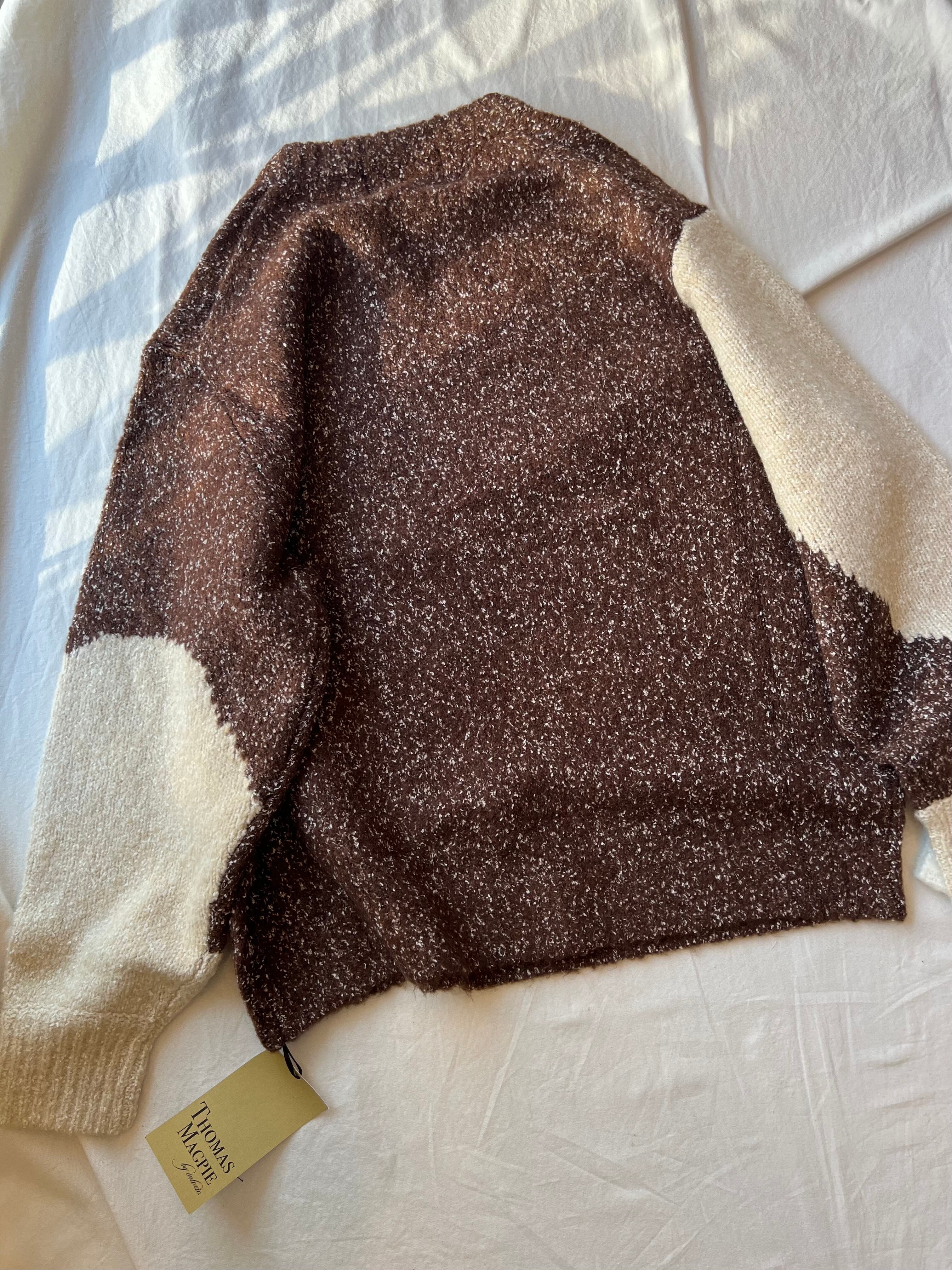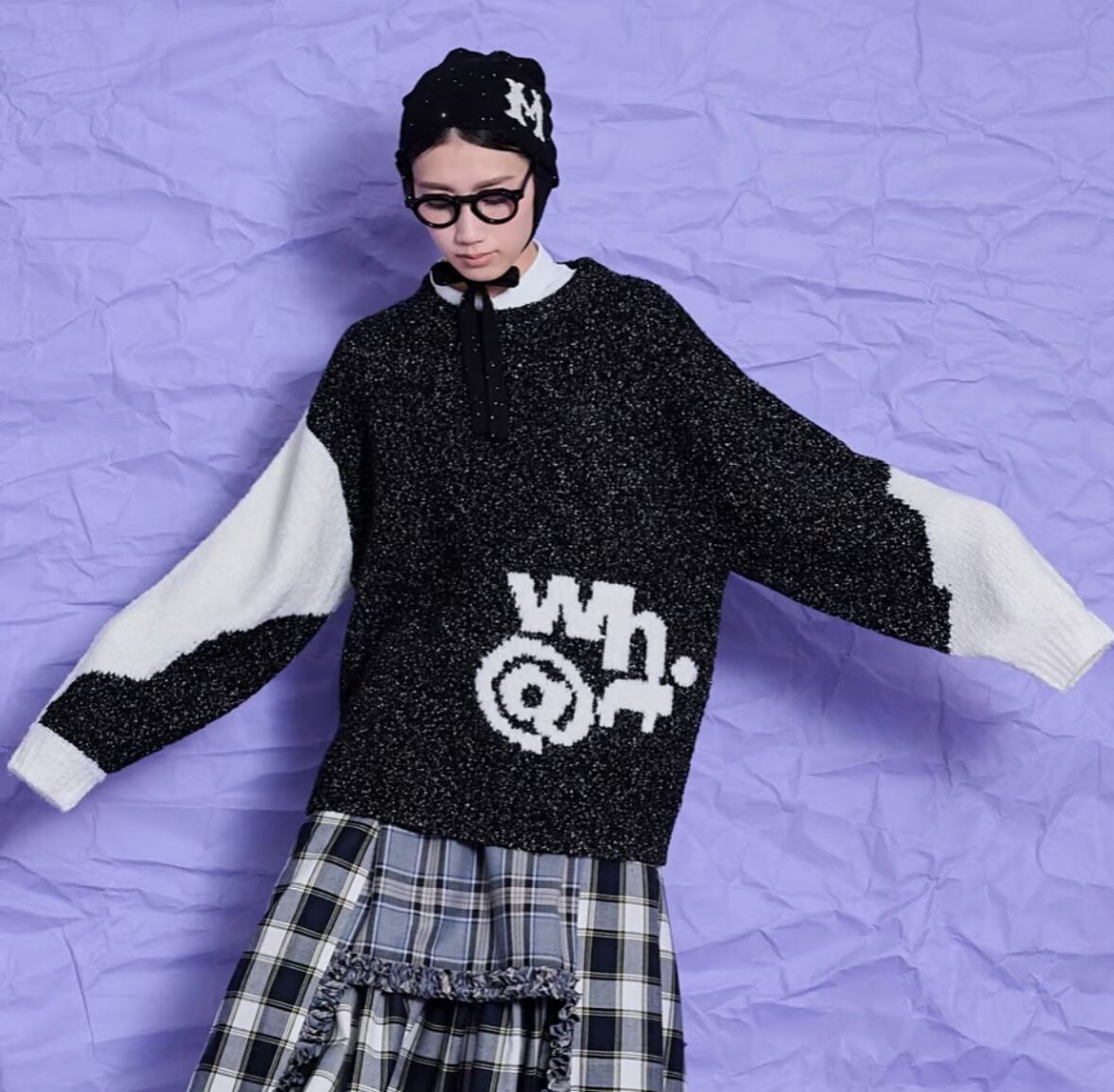 オーバーサイズのニットです。このニットはアクリル、ポリエステル、レーヨン、ウールなどのミックス素材でウールのガシガシした感触はありません。割とソフトタッチでとても着やすいと思います。また糸自体が少し重みがあるので下に下がって見えてほっそり効果が見られると思います。糸自体はふわふわもちもちしていて暖かなタッチです。ぎちぎちの編み地ではないので風が少し通ります。タッチは暖かですが、オールウールのように暖かいというほどではない気がします。真冬はヒート素材のインナーを入れて着用してください。長く着ることができます。秋口から着る事ができるので長い期間着用できます。毛足が長い毛と短い毛のミックス感があり糸が可愛いのではないかと思います。このニットはスタッフに大好評で可愛いと人気だったので予約商品になりました。オーバーサイズのサイズ感が好評でした。首回りのリブはダブルにしていて、ふっくら、しっかりとしています。私の手描きしたランダムな配色がとても気に入っています。カラーはブラックとブラウン。ブラックはホワイトのコンビネーション。ブラウンはベージュとのコンビです。前身頃のサイド下にWH@Tと入っています。今回はロゴに、5W1Hの言葉を多用しています。どこでも、なんでも、など、疑問詞を入れていてテーマに沿ってロゴを作ってみました。スタッフにはロゴの入り方が気に入っている、というコメントがありました。身頃の斜め下、中途半端な場所に入れていて、いつもとはちょっと違った雰囲気が良かったのかな?と思います。
