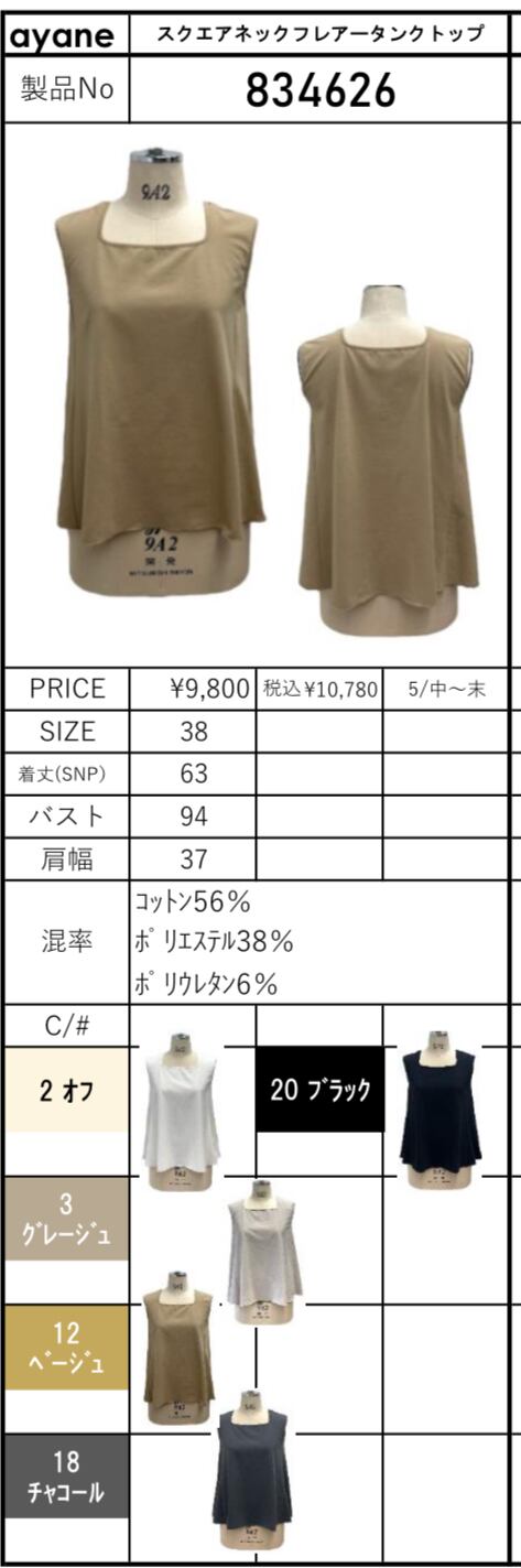 【 ayane 】スクエアネックフレアータンクトップ(834626)