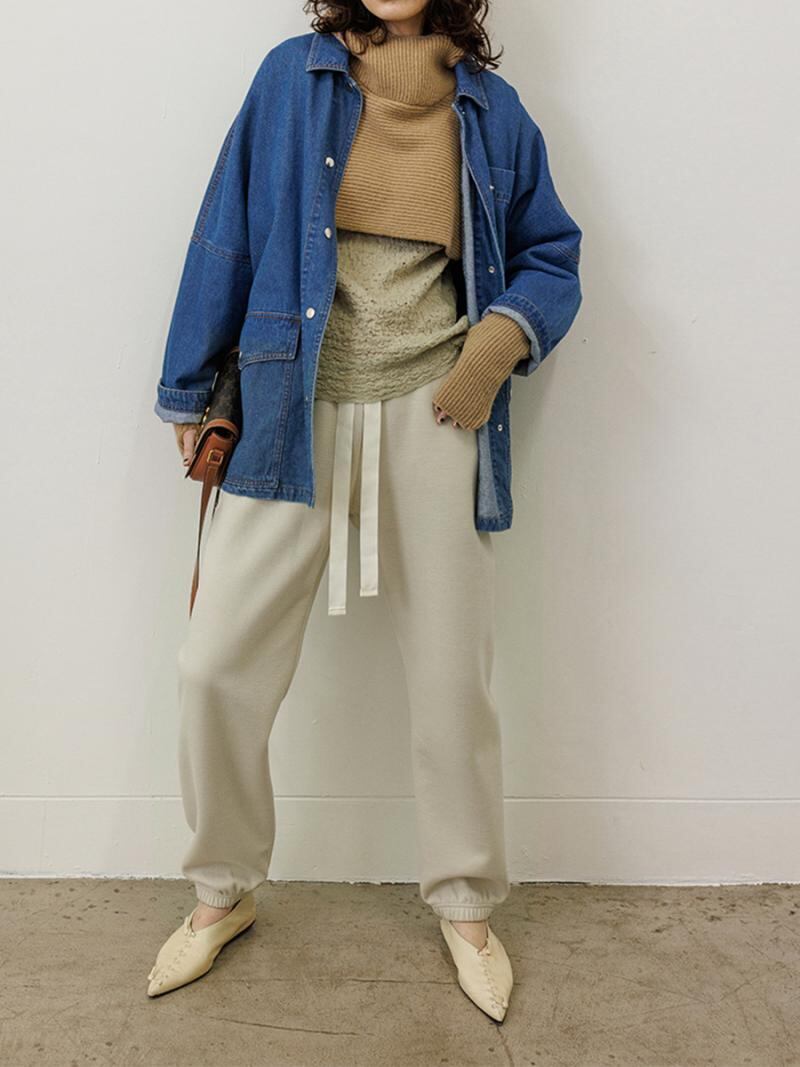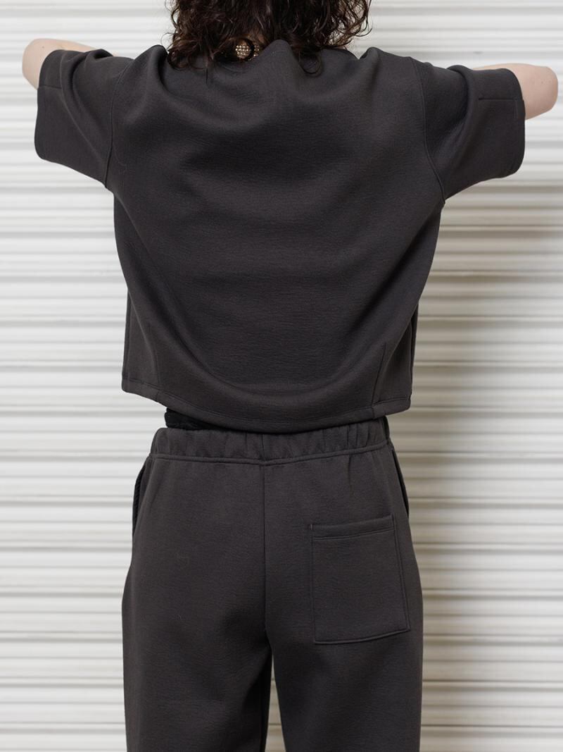 トレンドのジョグパンツを、大人の女性が着こなしやすい野暮ったくならないサイズ感を追求して完成した1枚です。 スウェットのようなカジュアルな表面感とダンボールのような弾力のあるハリ感のある生地は高級感があり、カジュアルすぎない大人のカットソーアイテムに仕上がっています。