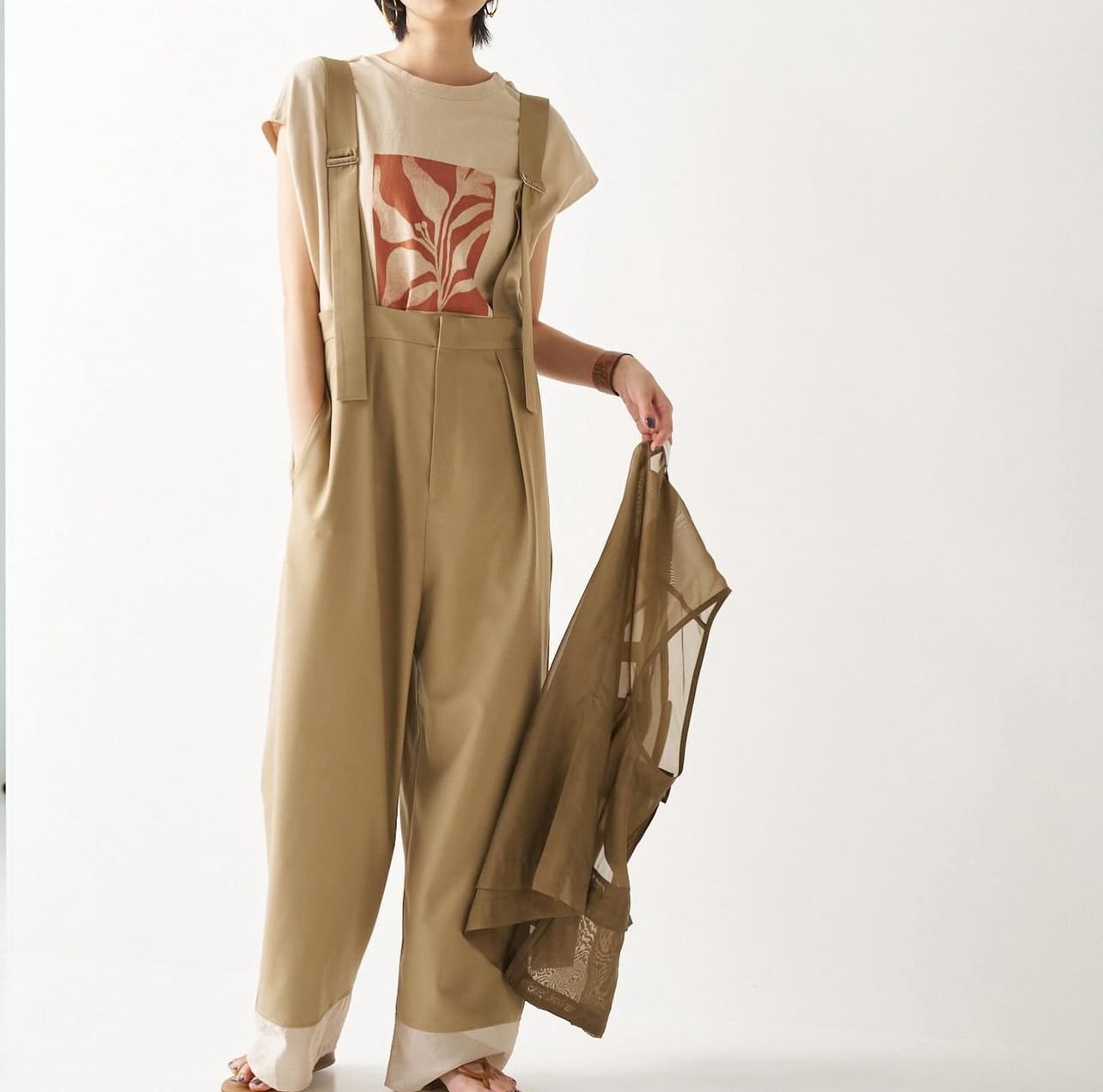 シアーで透け感があるので思い印象にならず、カジュアルな遊びのあるアイテムの為、シーズンレスで秋冬のニットや長袖アイテムなどともスタイリング可能になります。