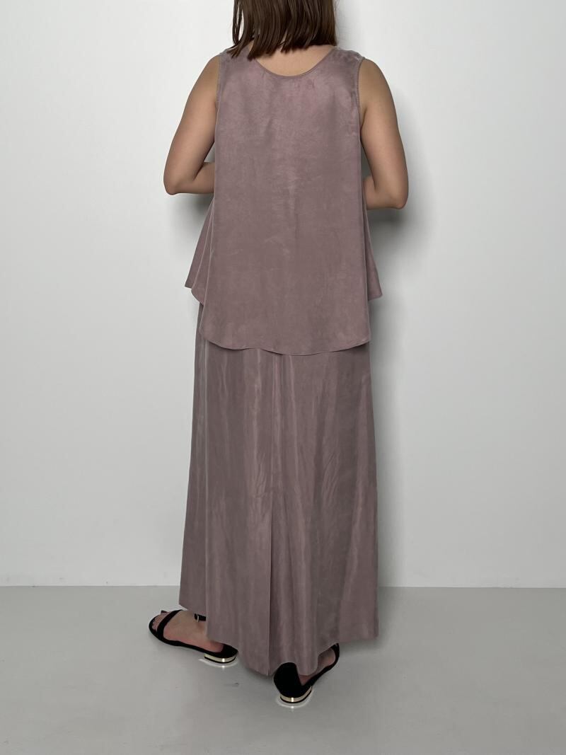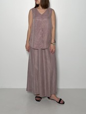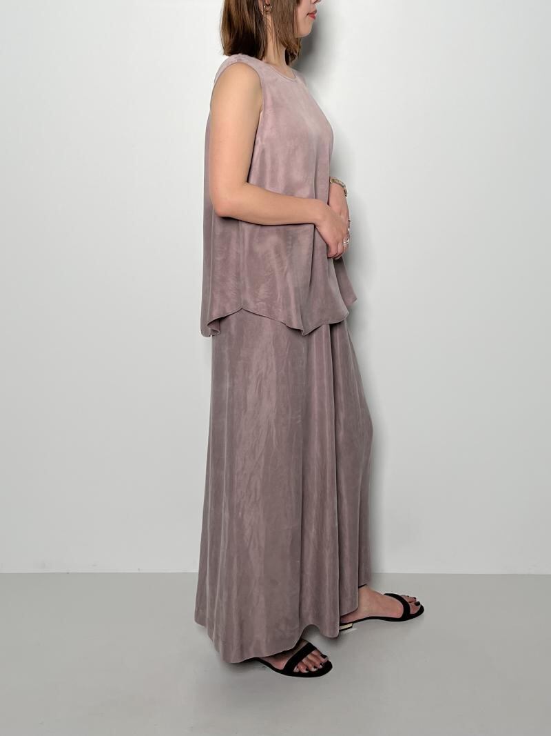 同素材のタンクトップとセットアップでワンピースのようなスタイリングもおすすめになります。