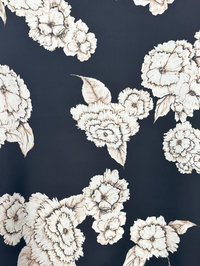 甘くなりすぎない花柄をセレクトし、上品な光沢とトロミのある素材感で、大人が着用できるプリント素材です。