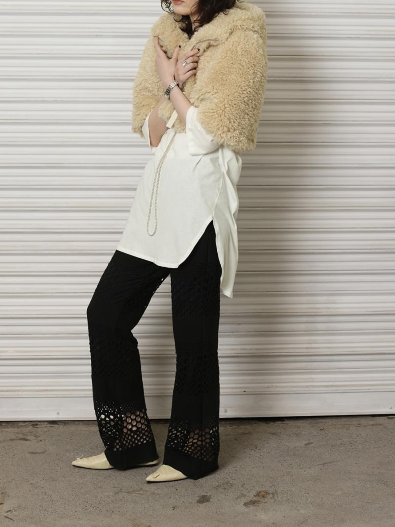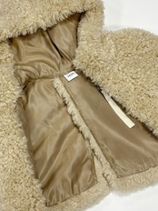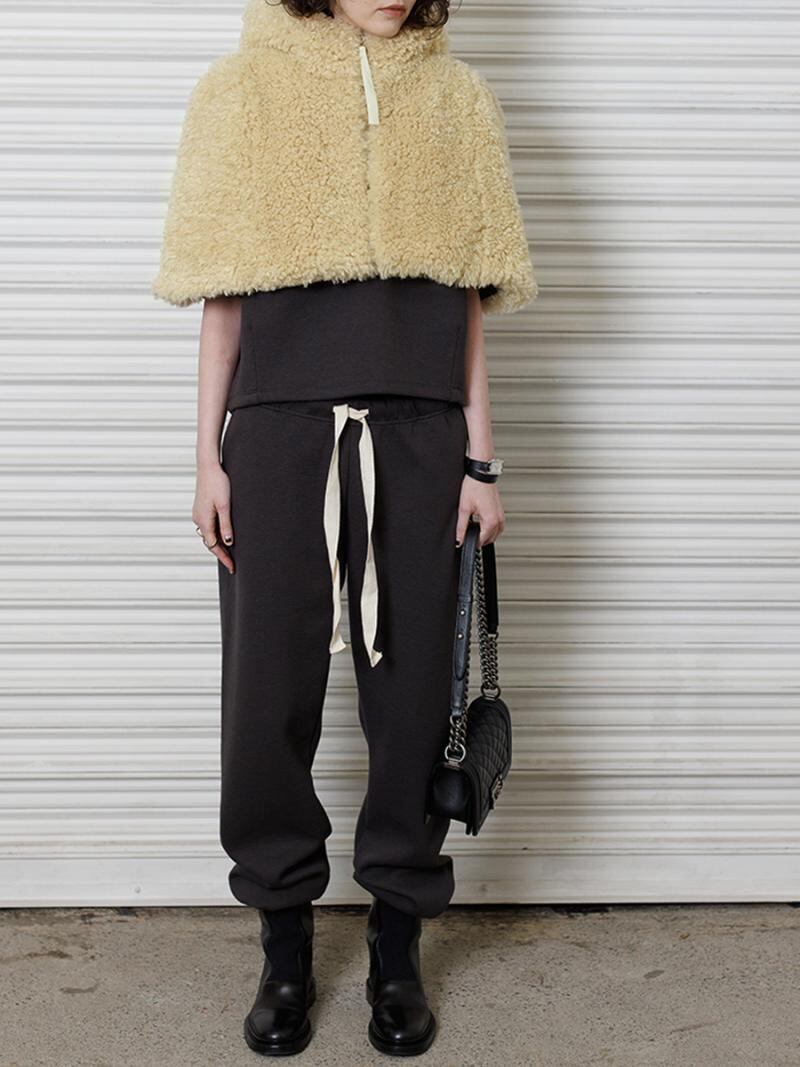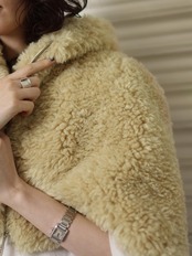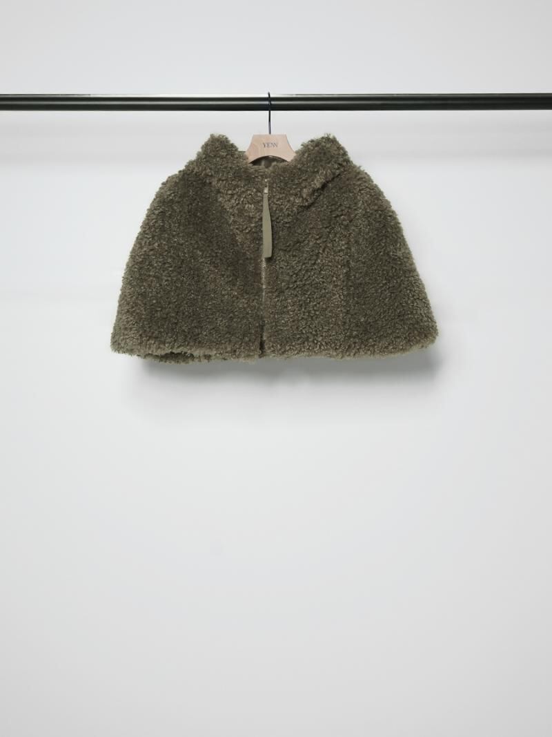 シープファーのようなカールした毛足がキャッチーな、フーディーケープです。