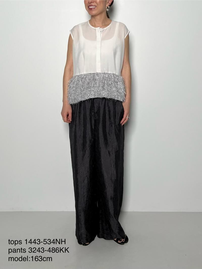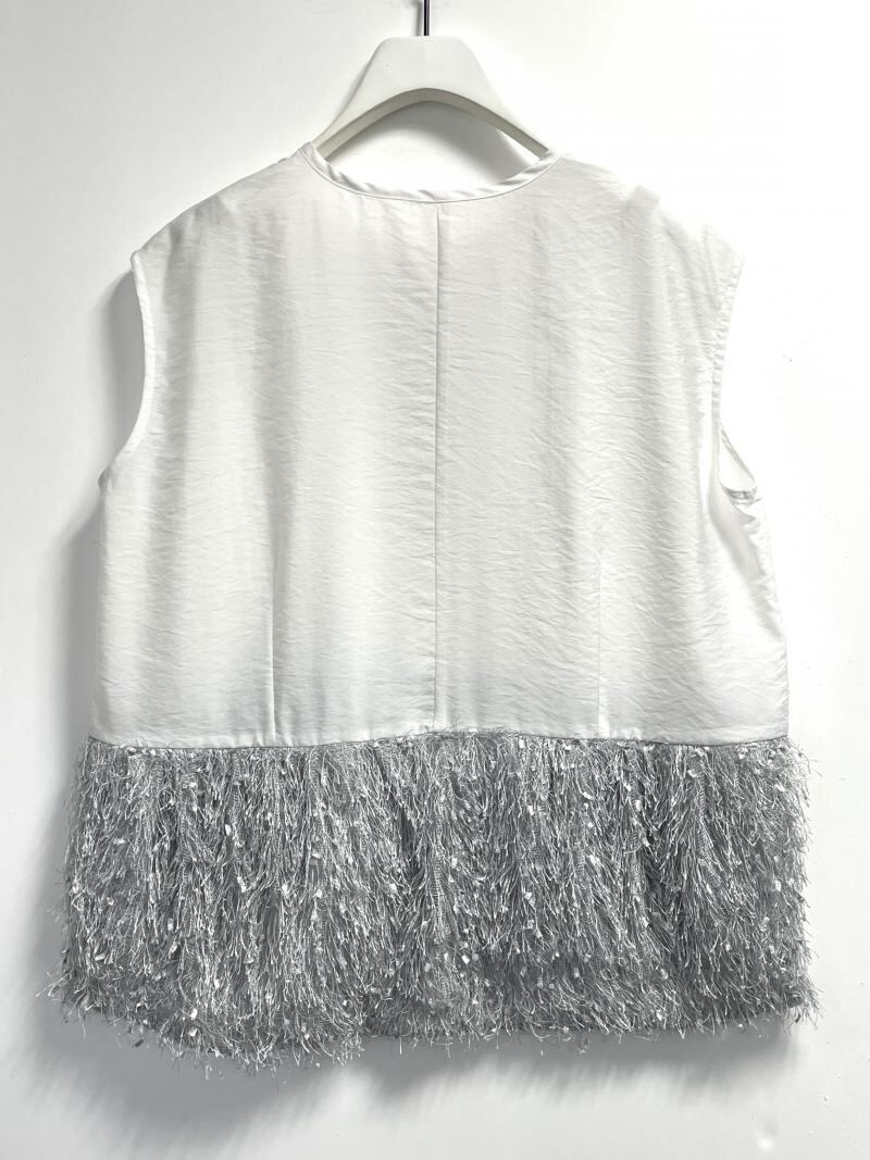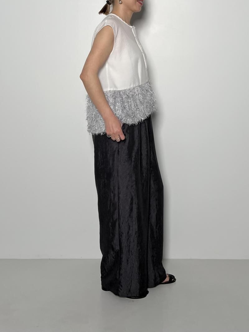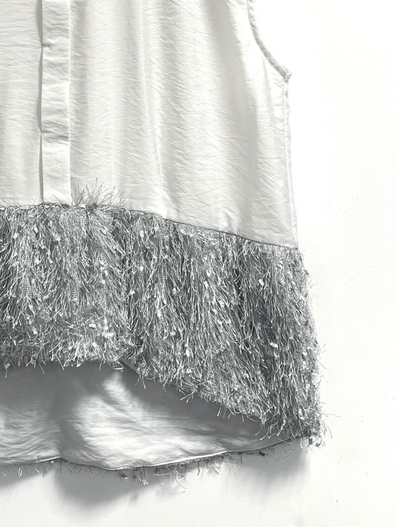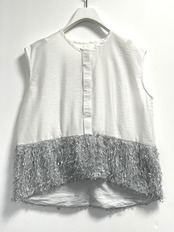 表面感が印象的なフリンジ素材とのドッキングでポイントのある1枚に仕上げました。