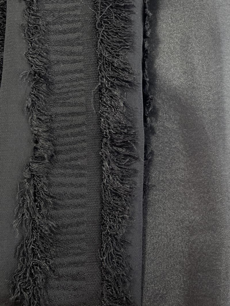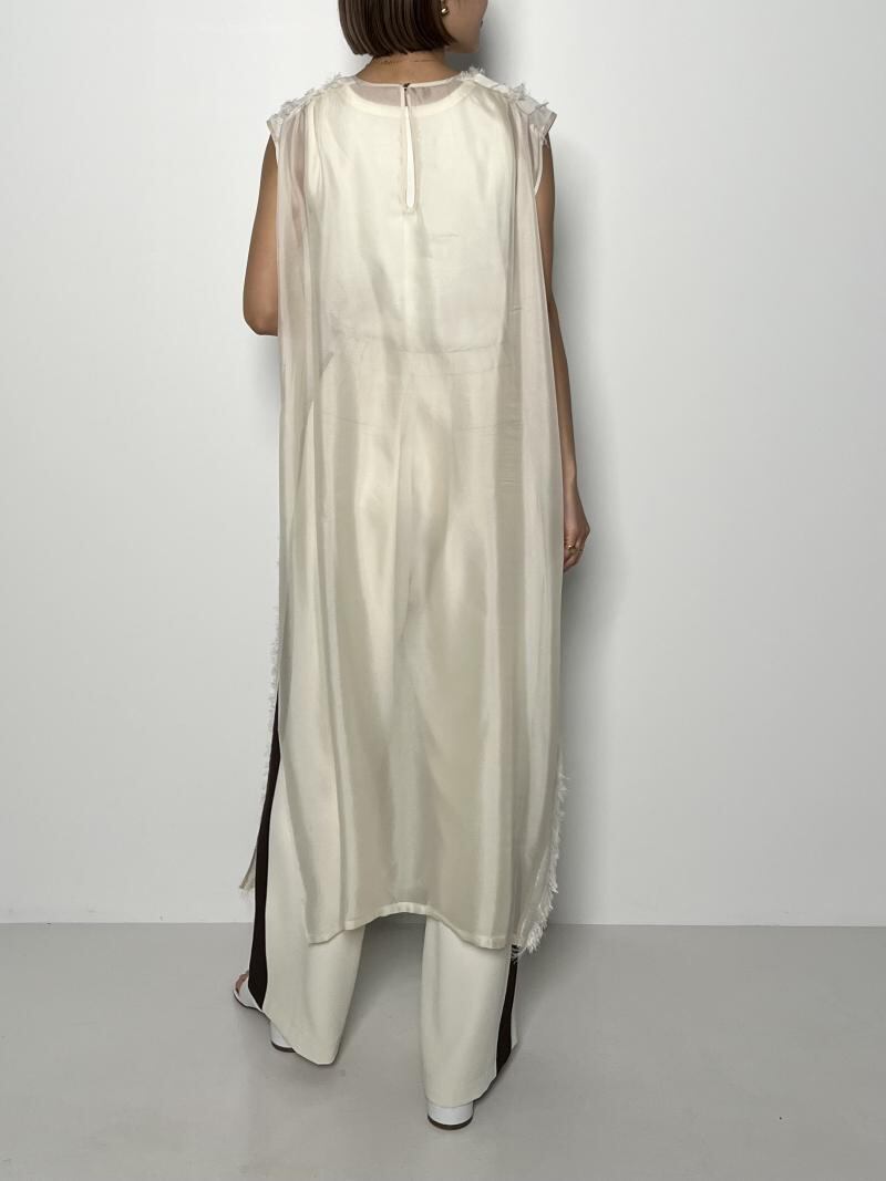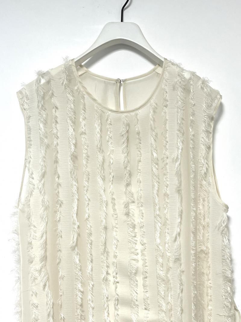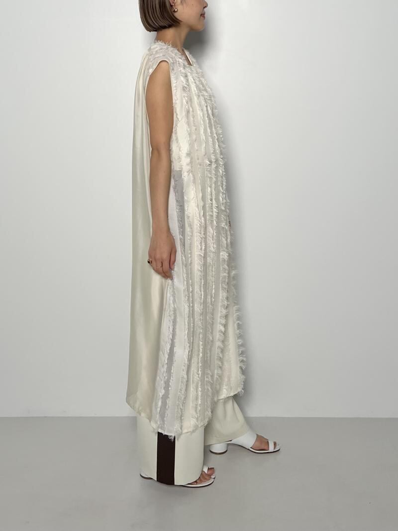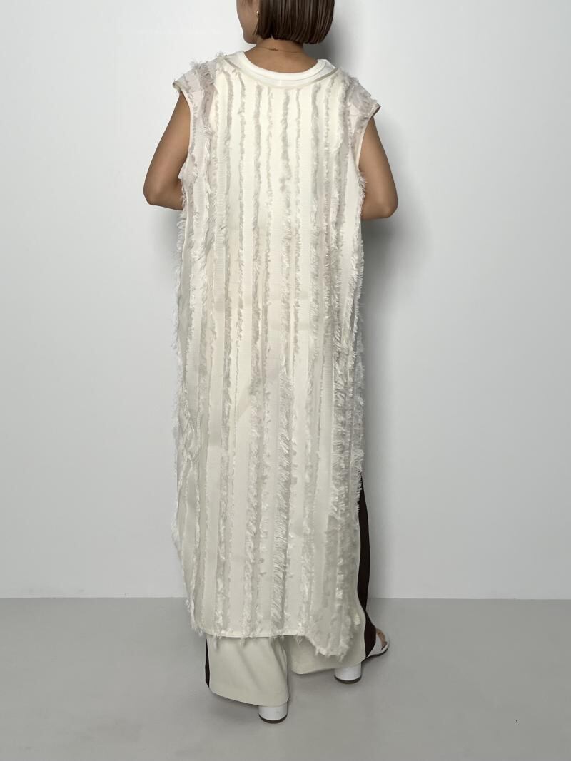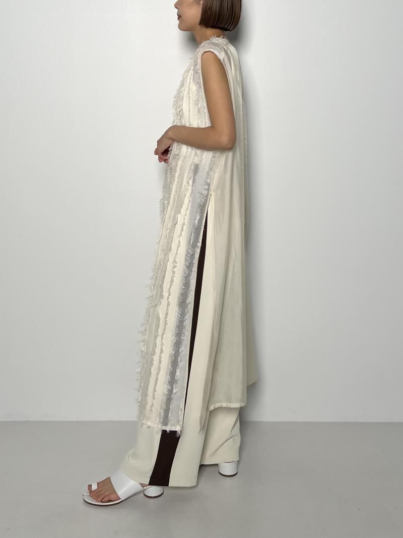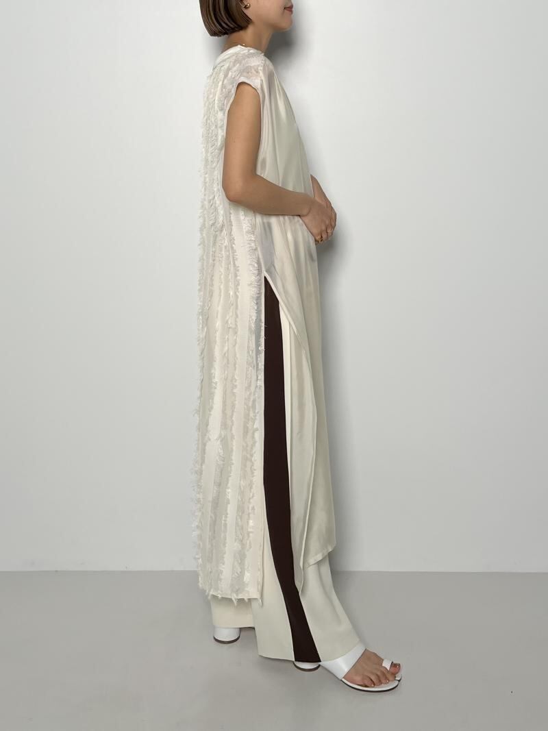 目新しいストライプの模様のカットジャガードを採用。アイラインシルエットやストライプによる縦のラインを強調することで、スタイルアップ効果をもたらします。長めのスリットを配して、ボトムとのレイヤードを楽しんでいただけるアイテムに仕上げました。前後どちらでも着用が可能でその日のスタイリングに合わせてご着用いただけます。