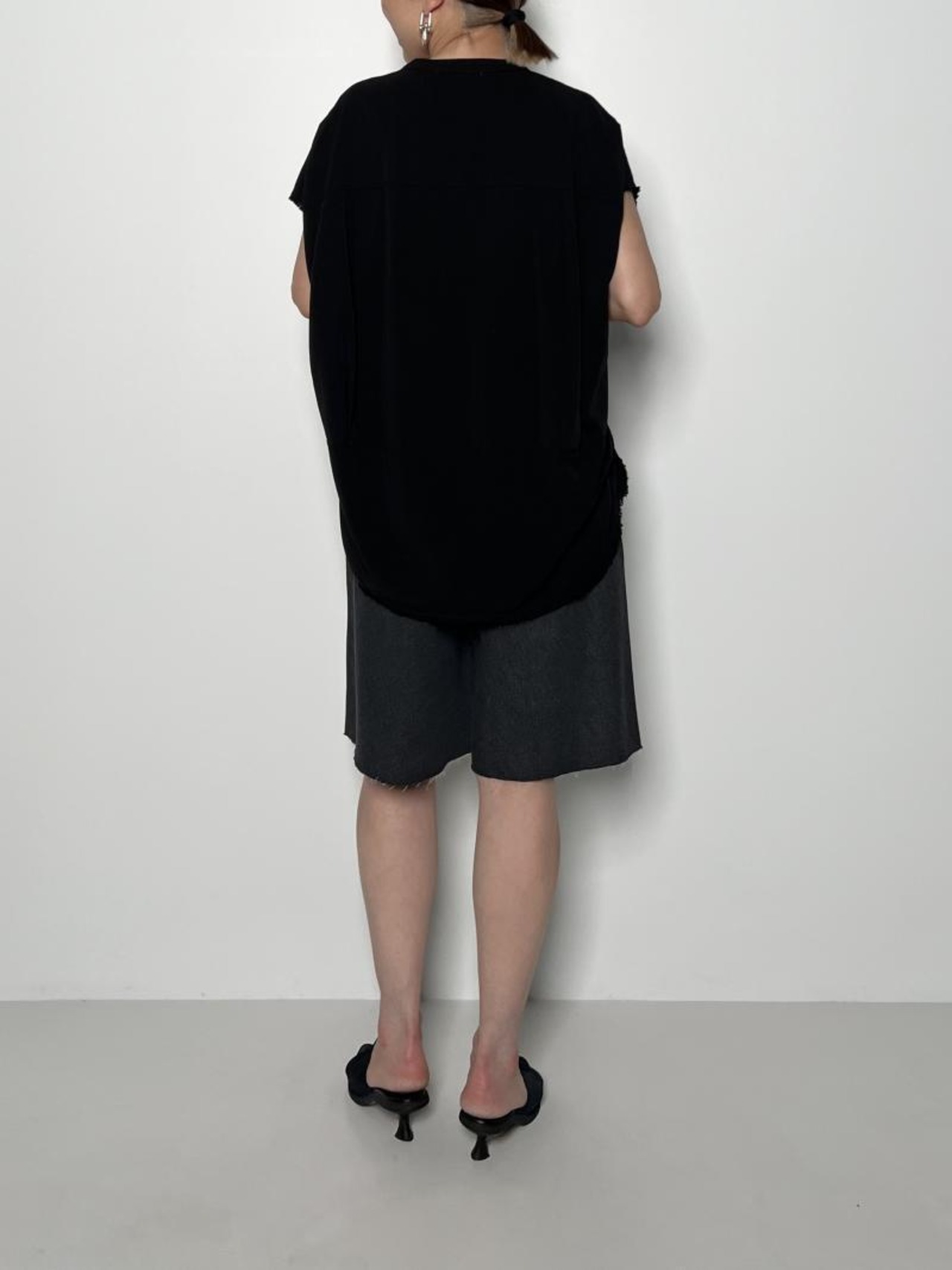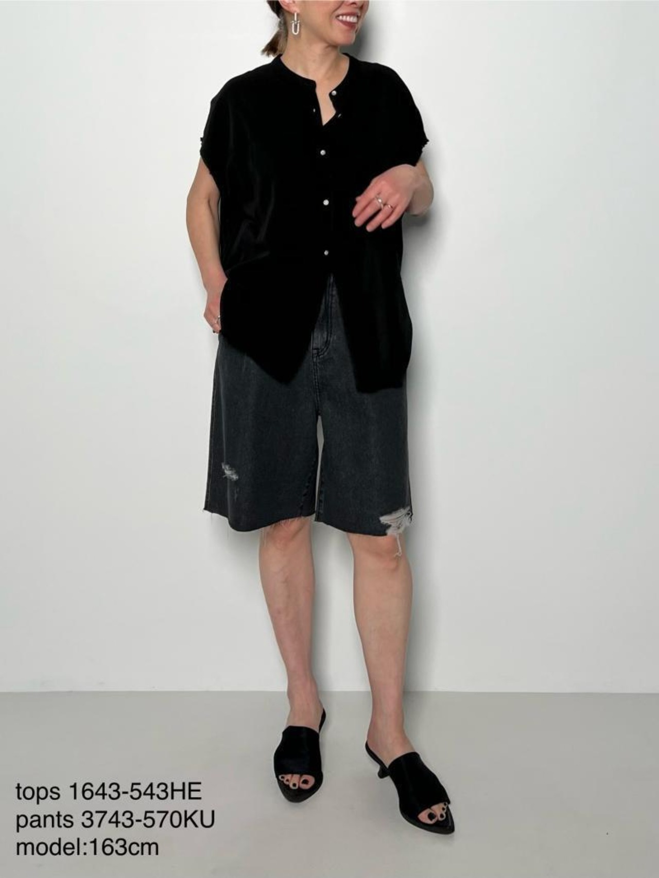 大人の方に着て頂ける様、膝が程よく隠れる位の丈設定にしています。どうしても少年感が出てしまいがちなハーフデニムは、女性らしい足元やアクセ使いにして頂くのがポイントです。また、秋冬のブーツ時期まで使えるので、先まで楽しんで頂けます。
