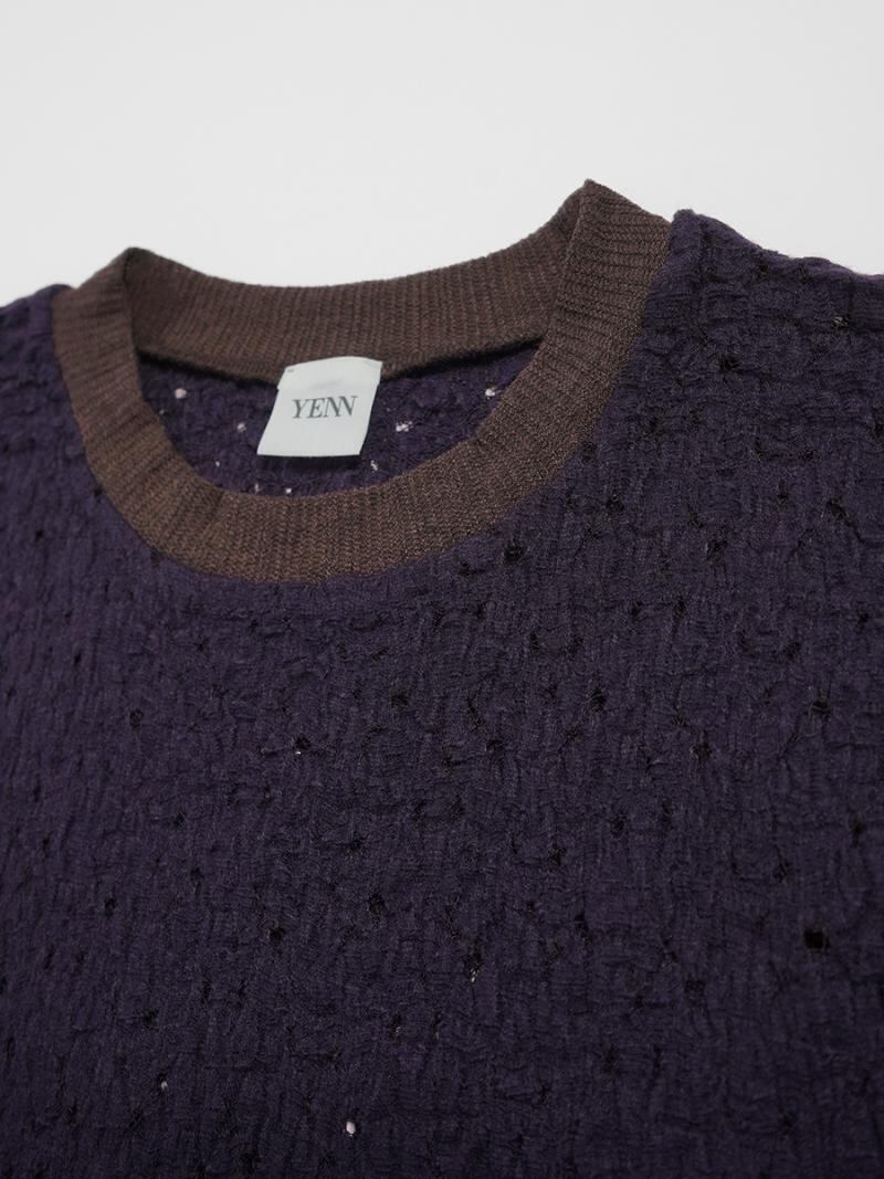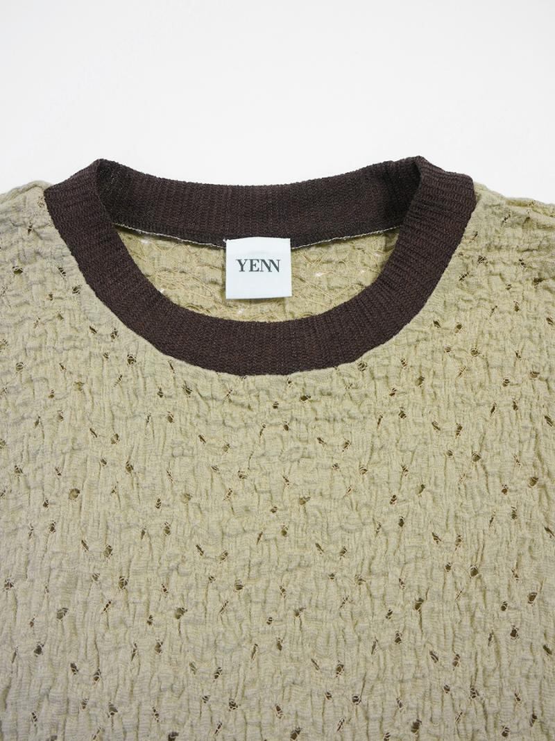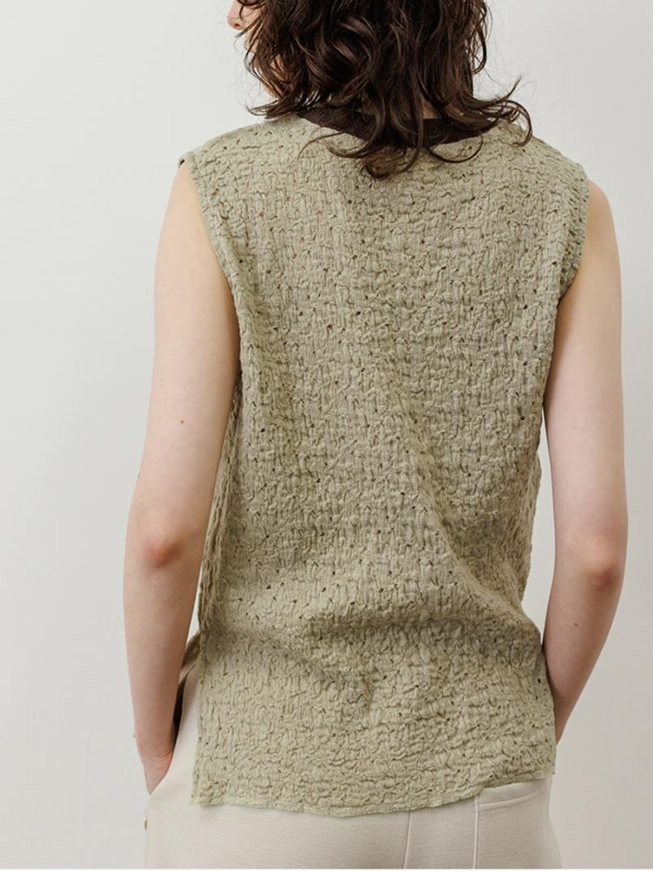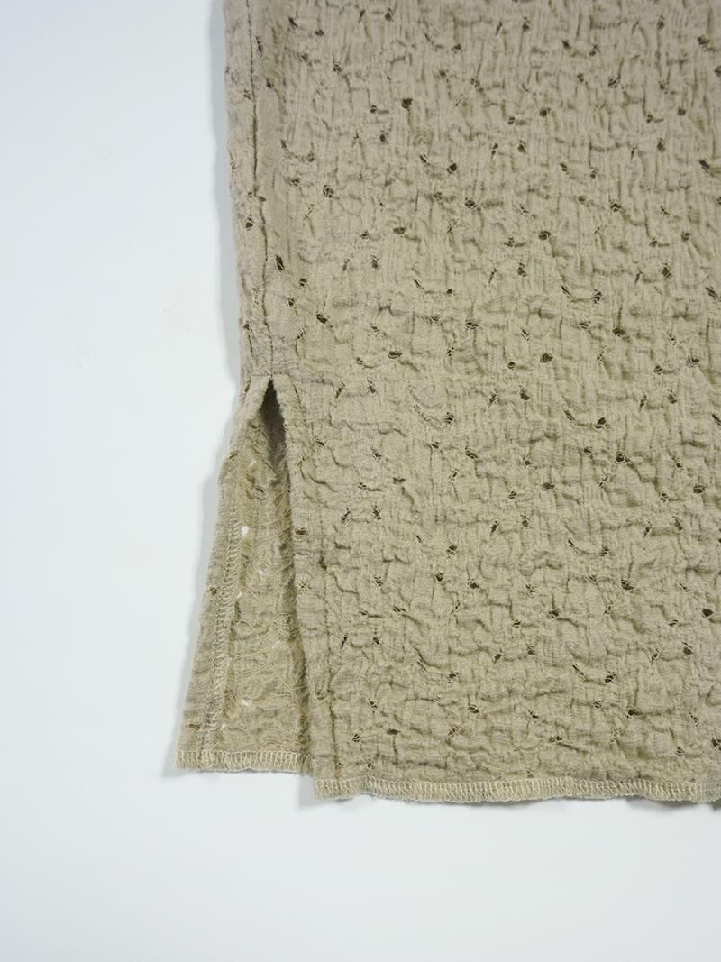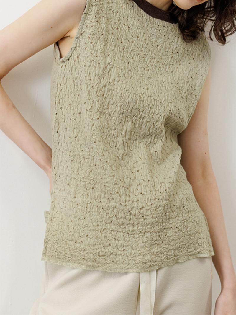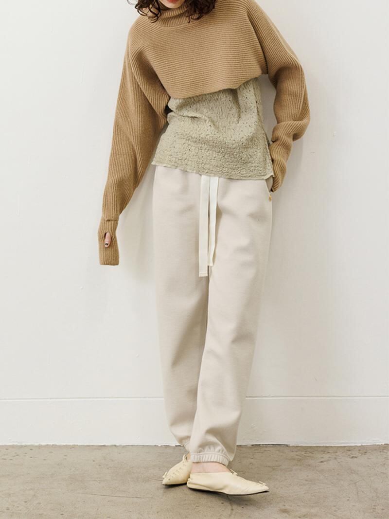 ポコポコとした表面がレースでも甘くなりすぎず、ネックにシアーテレコを組み合わせて軽さとカジュアルさをプラスしました。