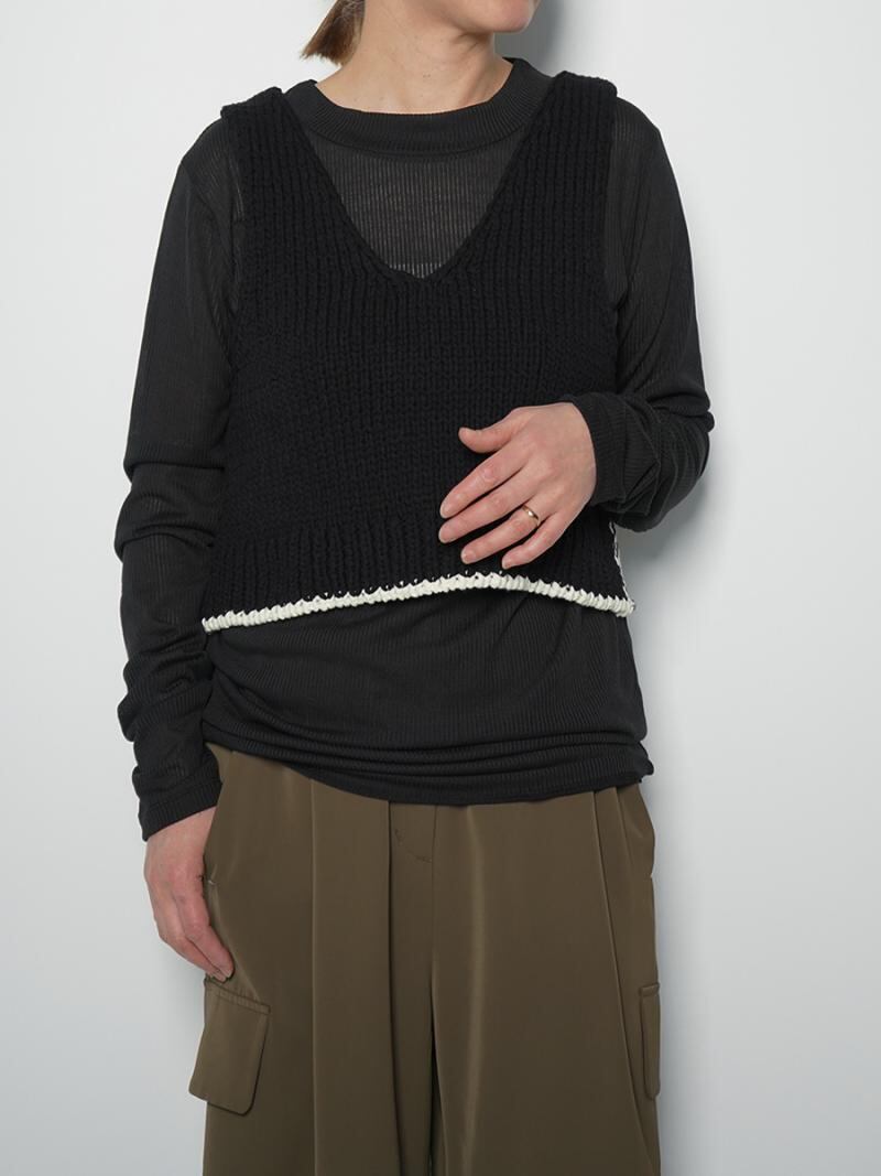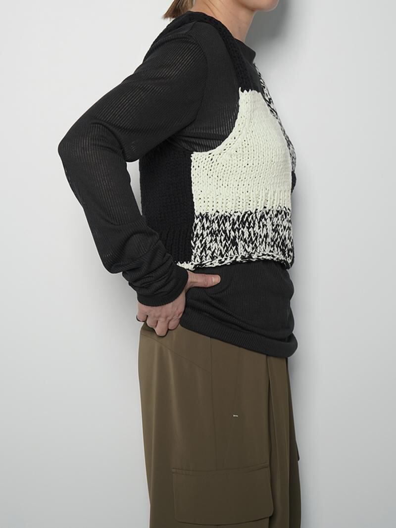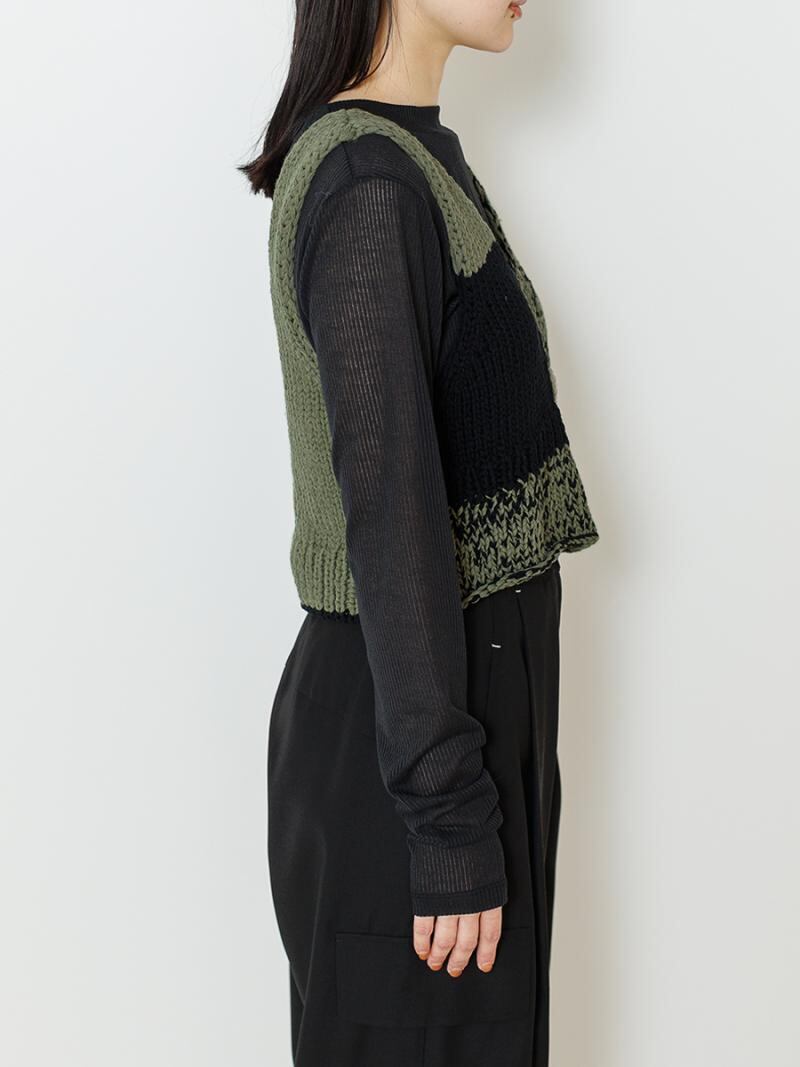 2色の糸と編み地をミックスさせた手編みのパッチワークビスチェです。