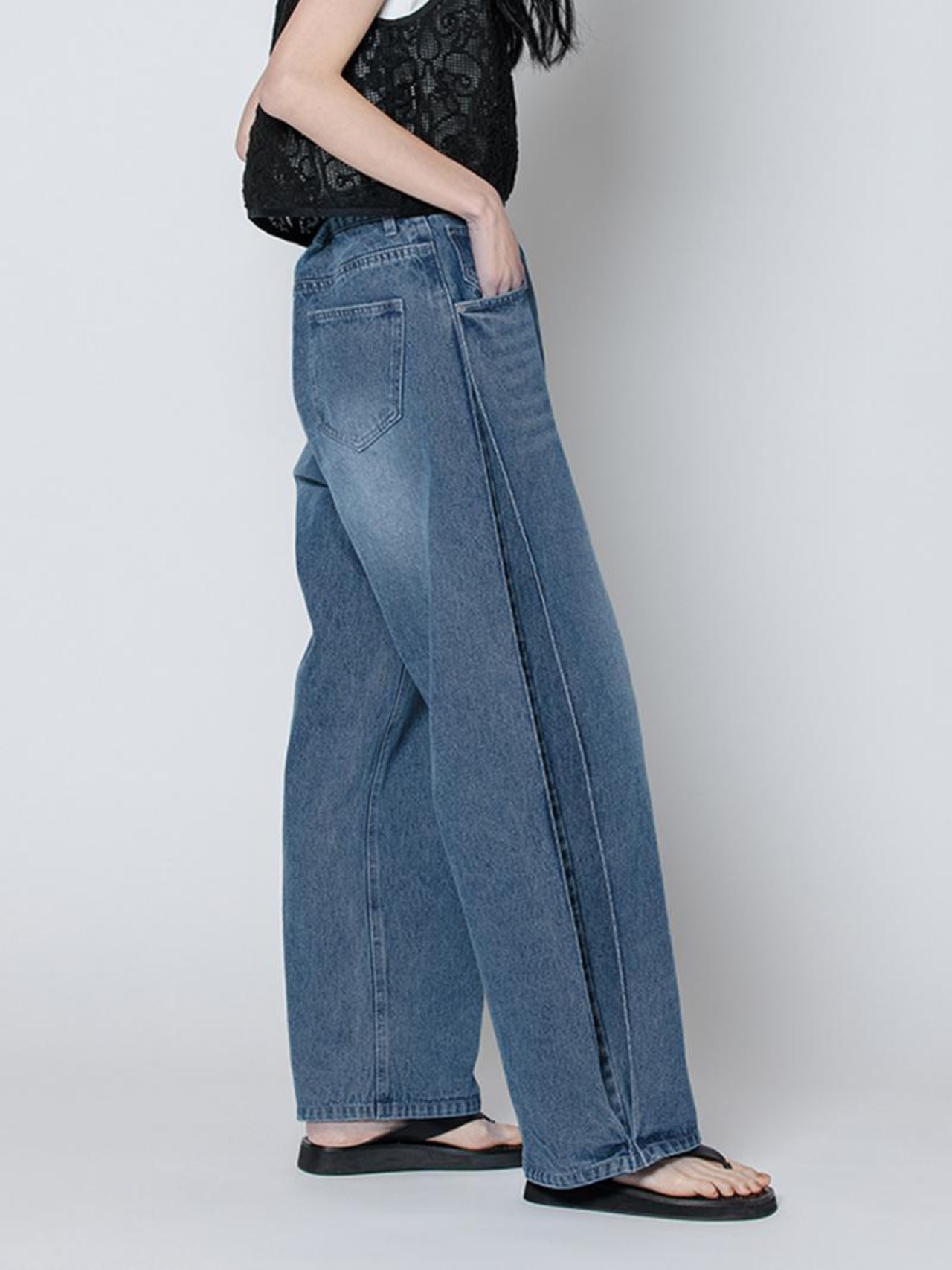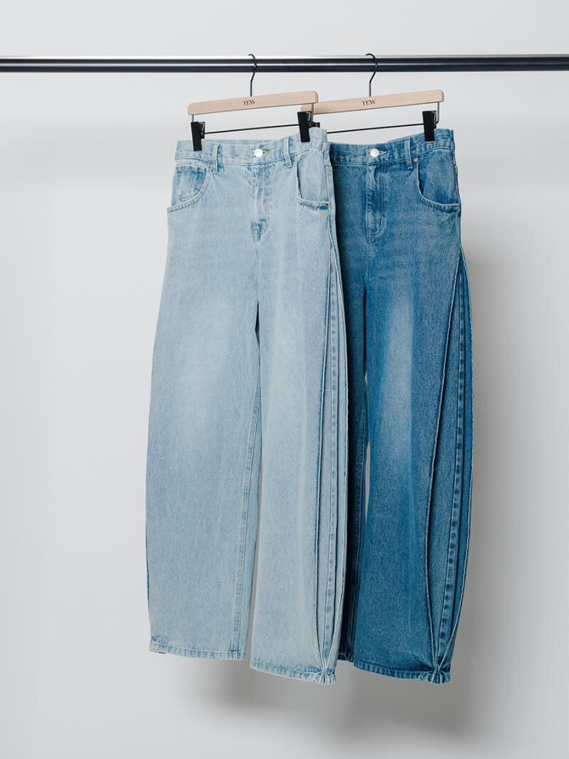 前から見るとすっきりとしたストレートシルエットで、足の動きによって開くプリーツがシルエットの変化を生み出すのがポイントです。裾にかけて萎むデザインになっていて、裾でたるませて履くとカーブデニムのようなシルエットになります。 足回りにボリュームがある分ウエスト周りはすっきりと仕上げていて、野暮ったくならないようバランスを計算して設計しています。 スタリングの主役になるデザインデニムパンツです。