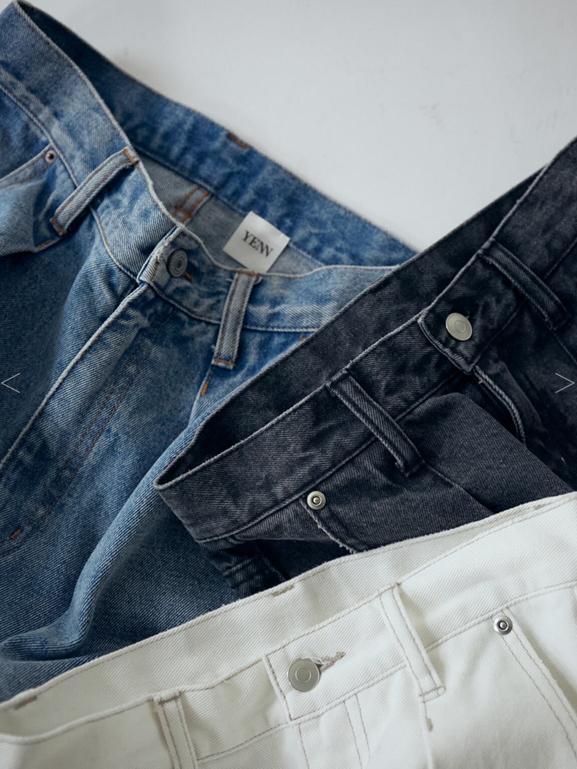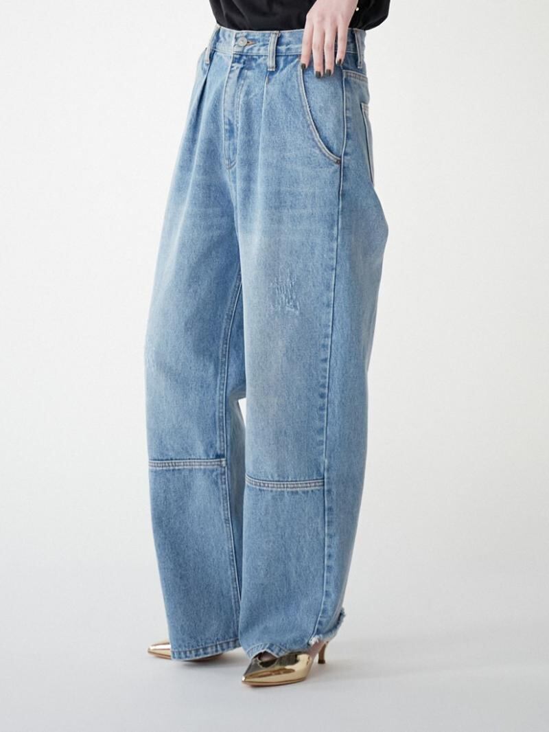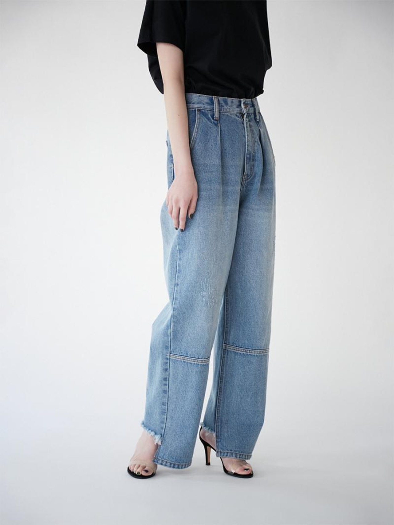 膝下にいれた切り替えデザインや、ところどことに施したさりげないダメージ加工など、こだわりのつまった1枚です。