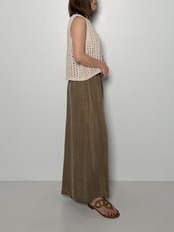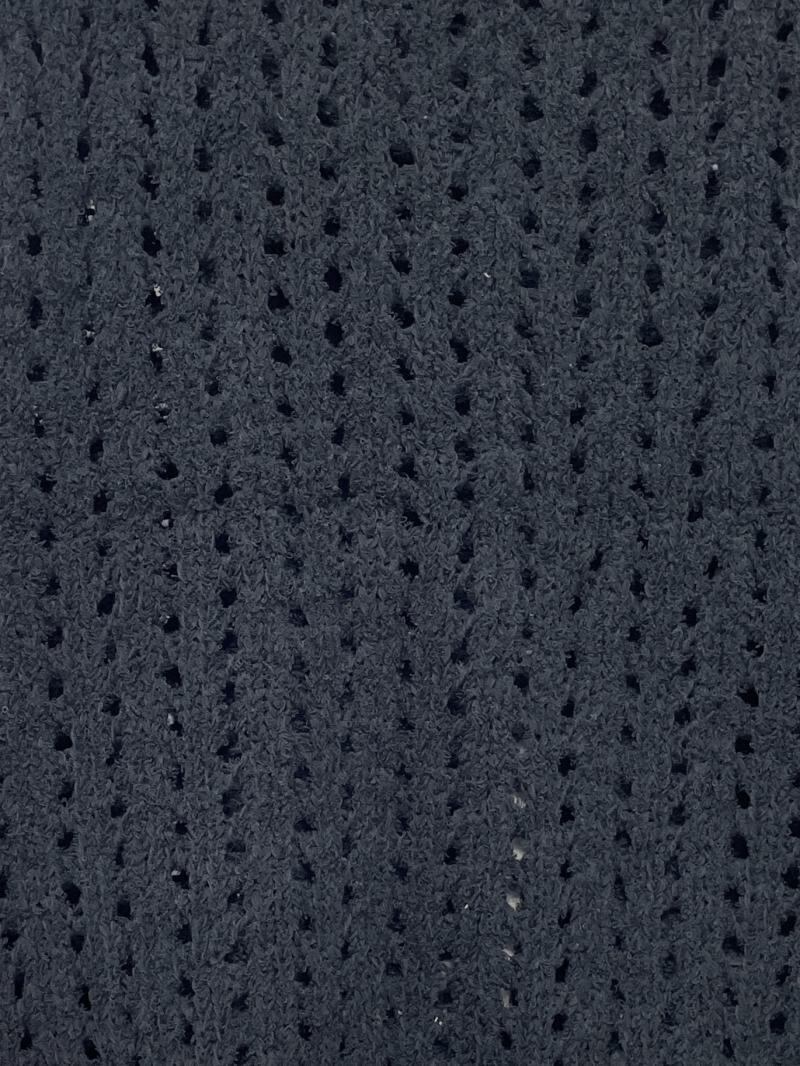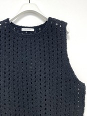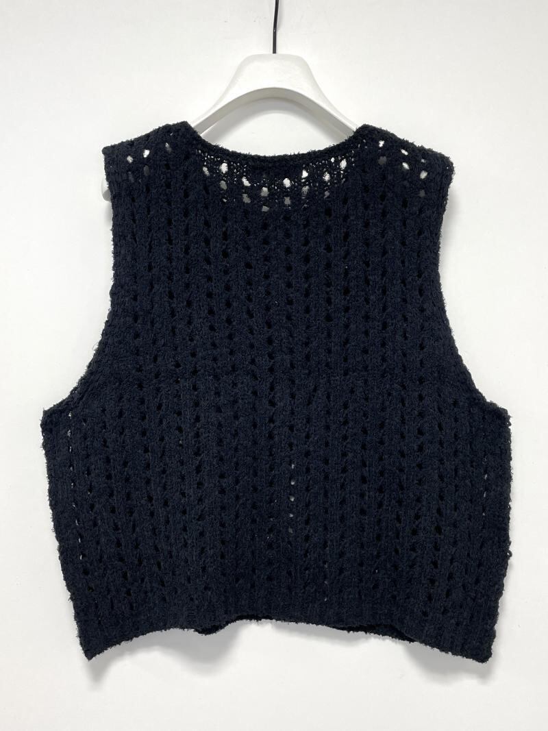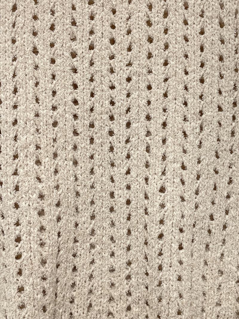 モケモケとした表情のある糸を使用し、穴のあいた柄編みで仕上げています。少し温かみのある素材感ですが、ショート丈と、柄編みにすることで暑すぎない、いつものTシャツにプラスする事だけで、少し秋を感じられる1枚です。
