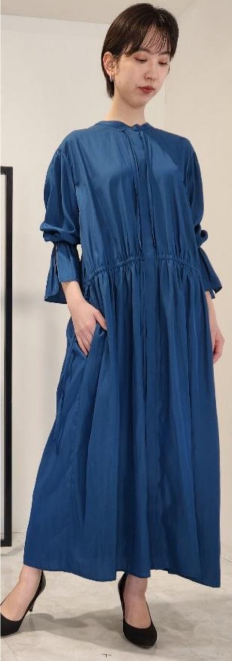 前後着用可能で、フロント釦を全開にして羽織としても着用できる3wayドレス。袖口はゴム仕