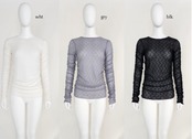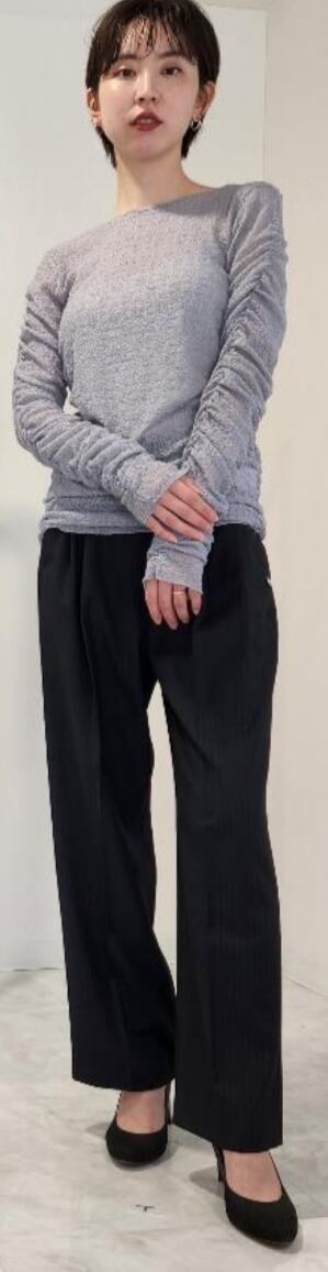 上品な透け感と落ち着いたワントーンの花柄がポイントのレーストップス。贅沢にたっぷり生地を使ったギャザー仕様でシンプルながらも存在感のあるデザインです。カットソーならではのイージーケアでご家庭での手洗いが可能。