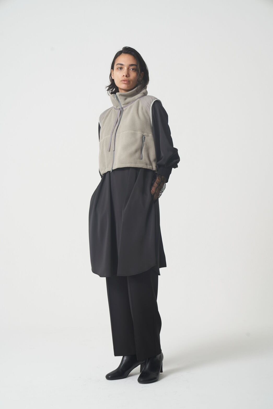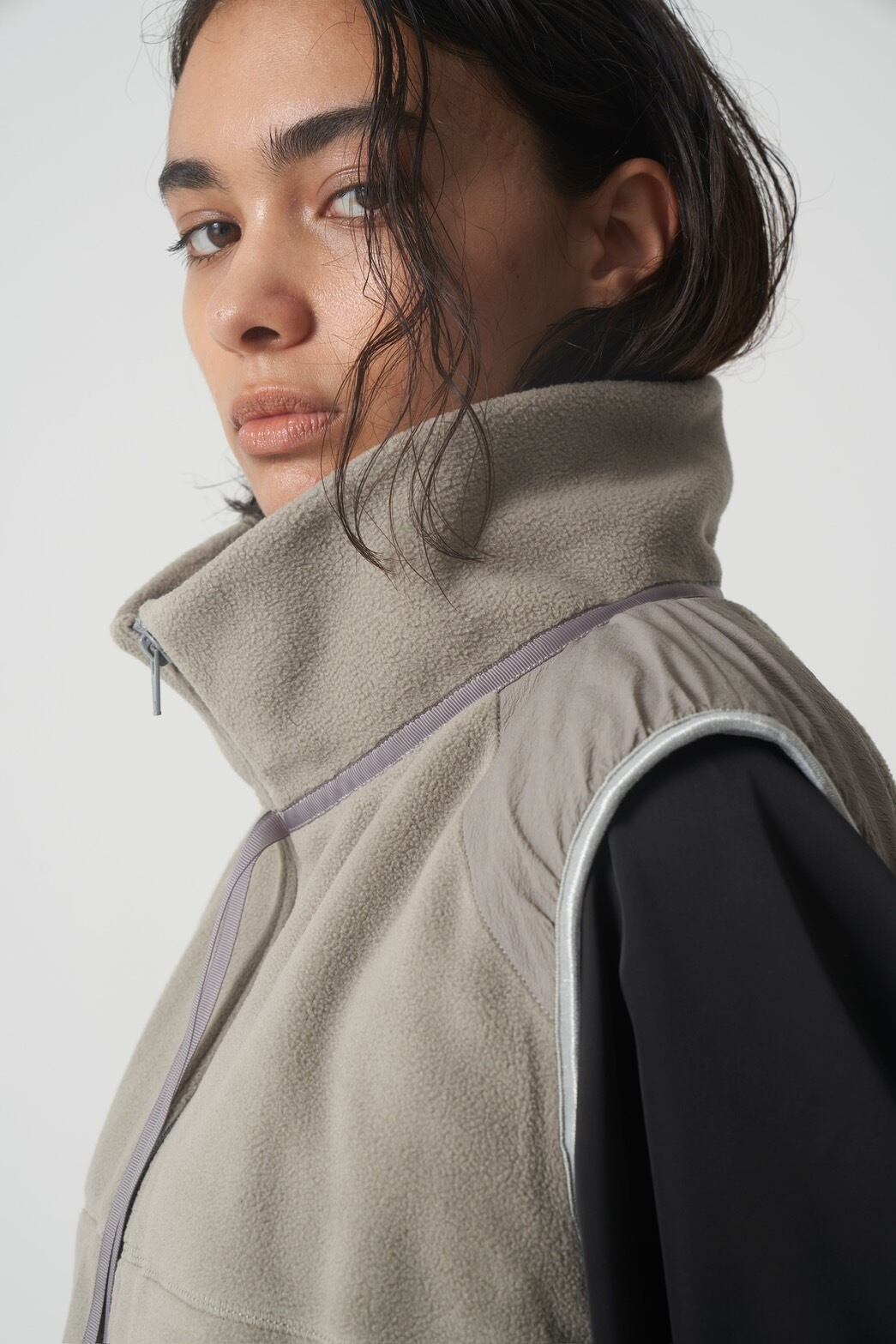 クロップド丈が特徴的なフリースベスト。ウエスト辺りでカットしたショート丈で、ハイウエ