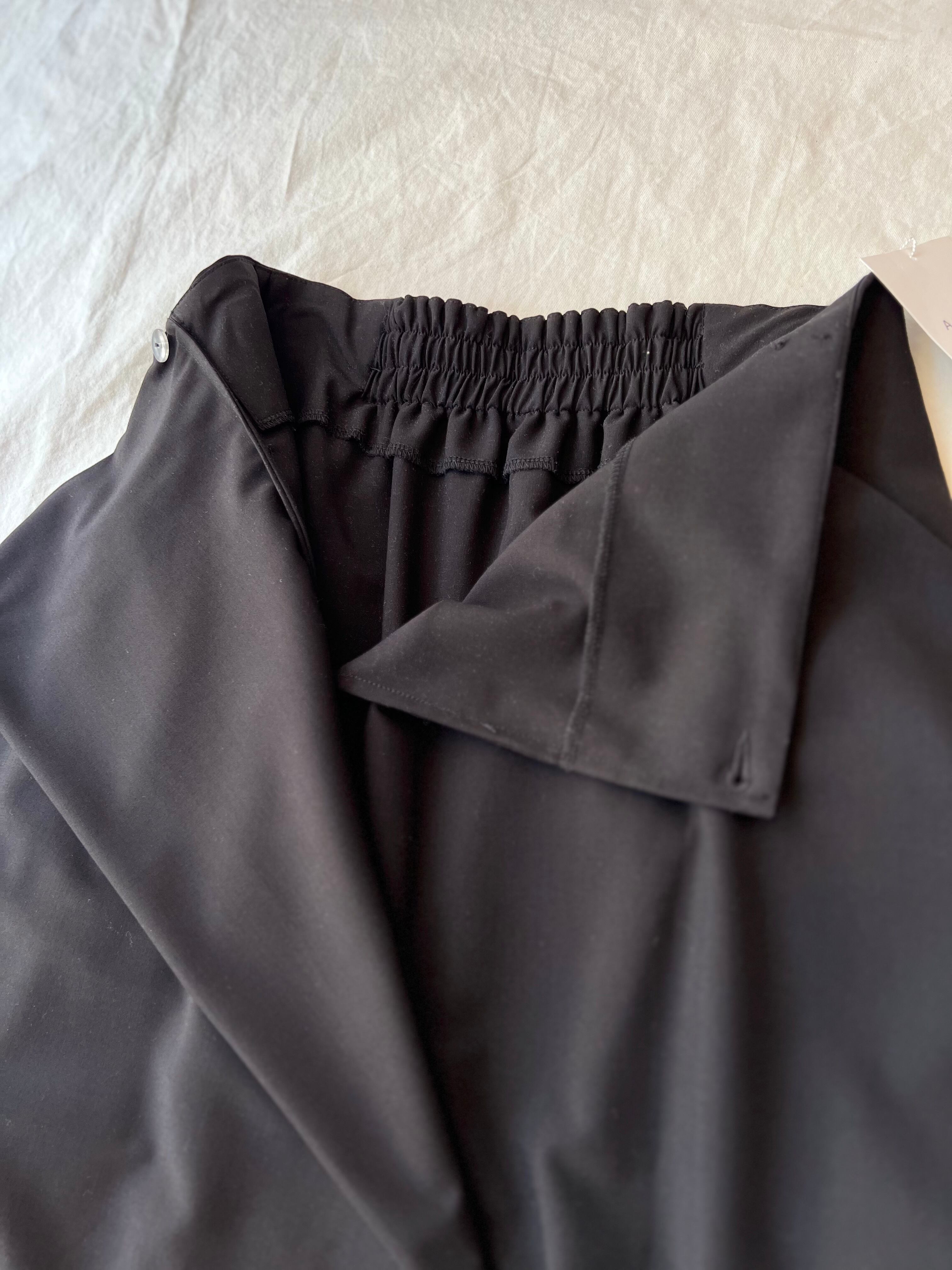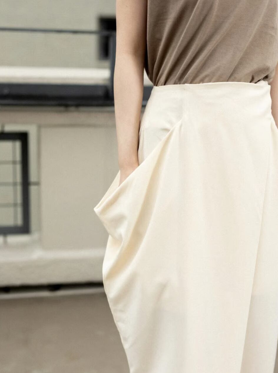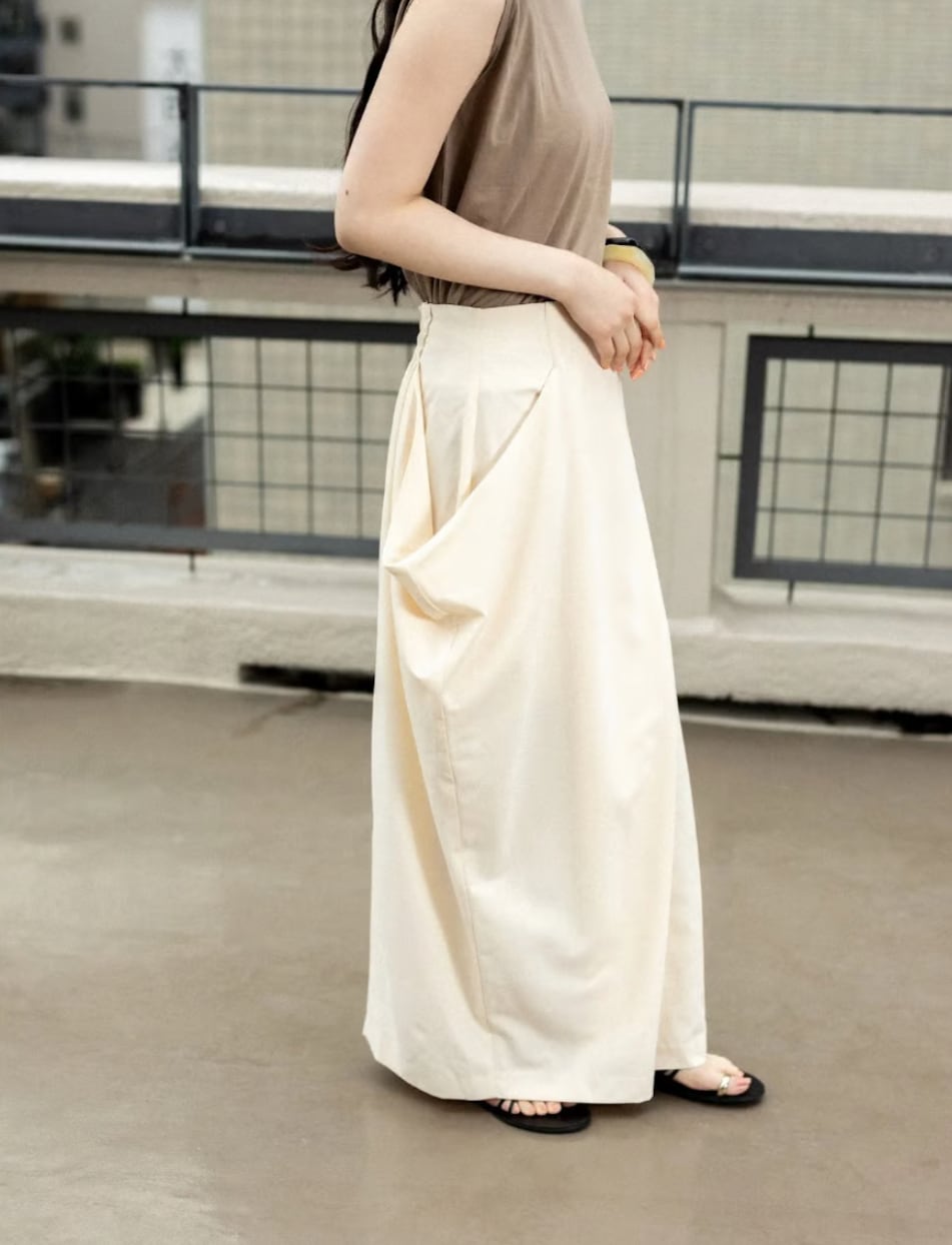 ポケットデザインを形状するため、同素材で太ももまで裏地もついたしっかりしたドレープスカートです。