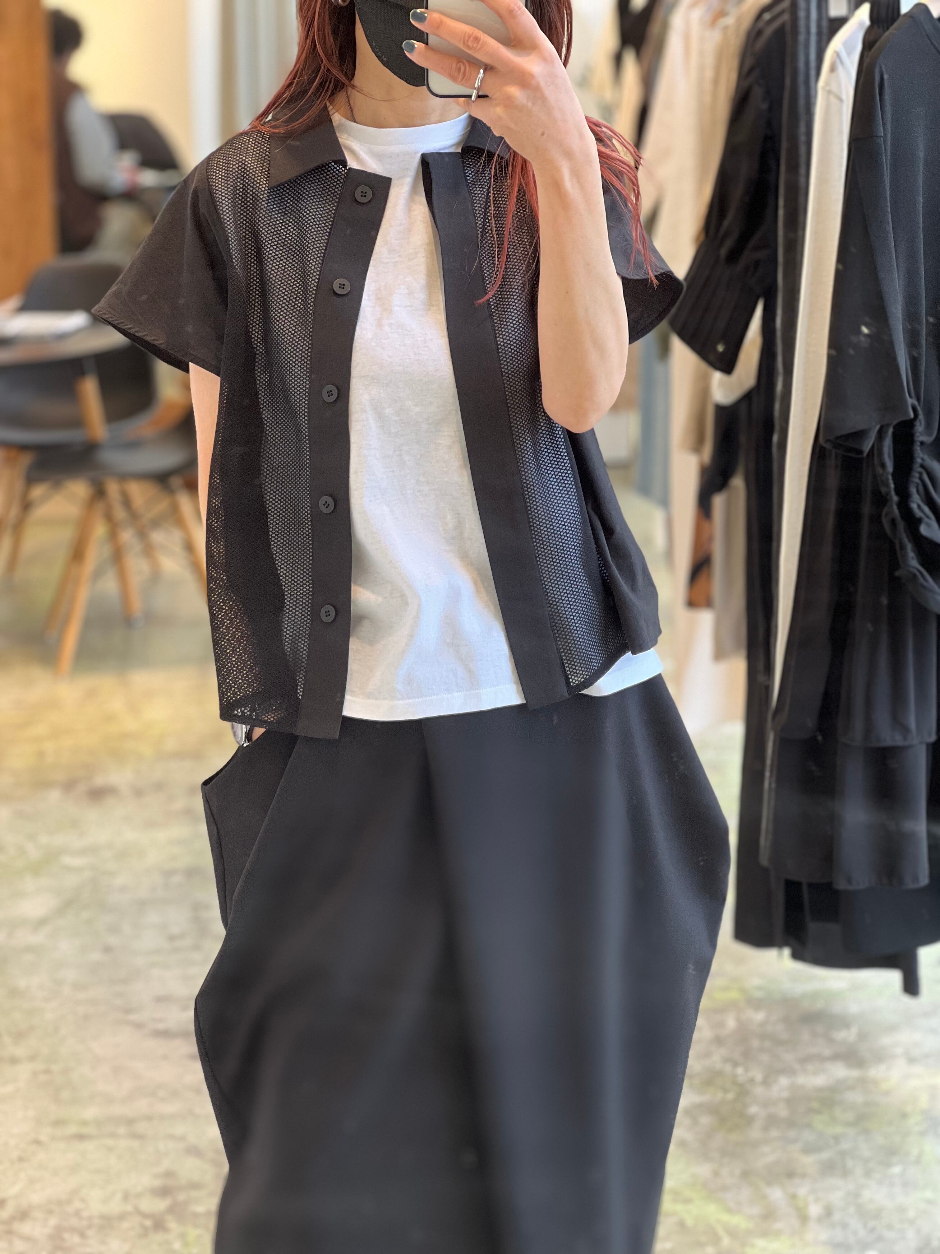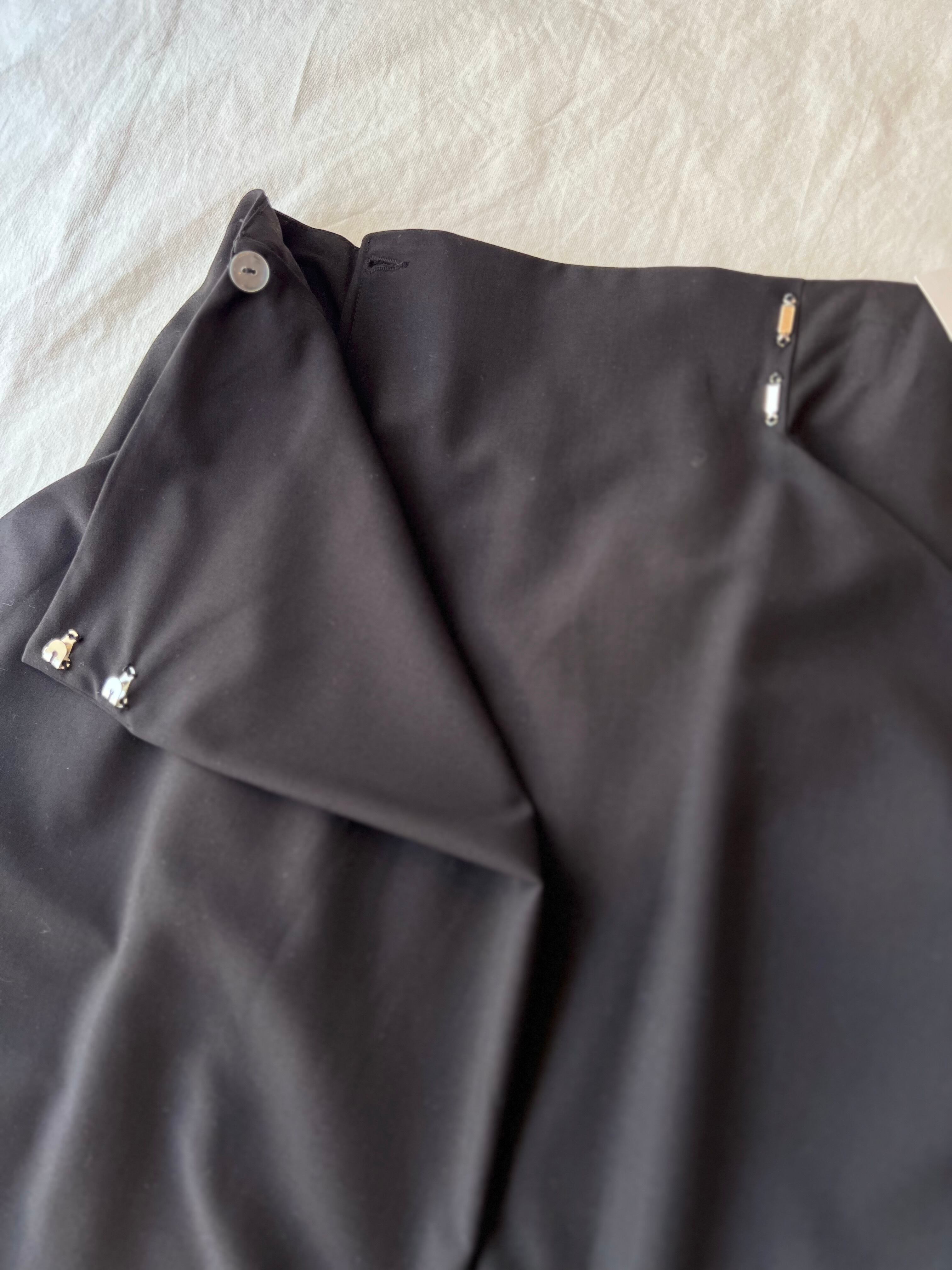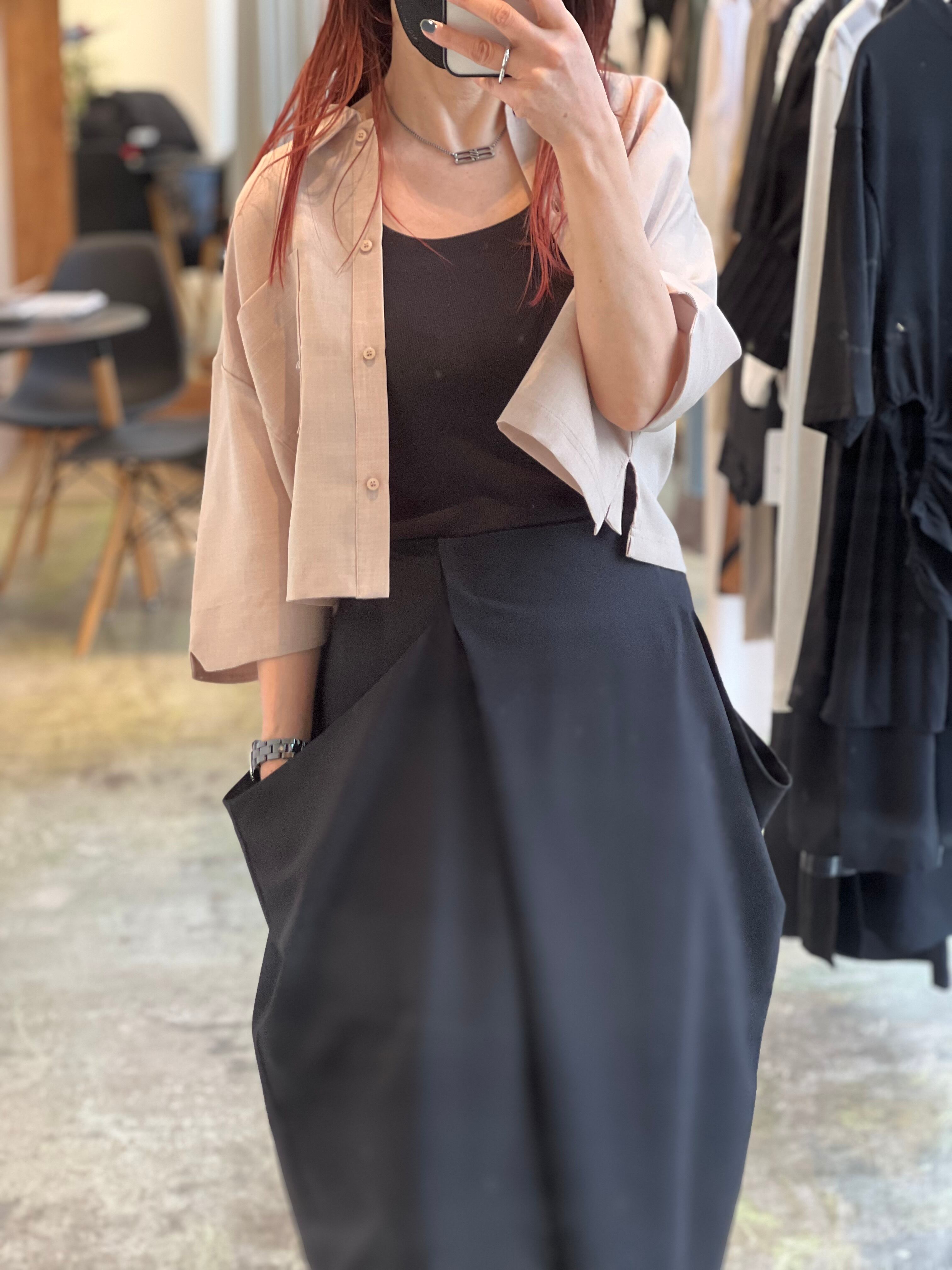 ポケットデザインを形状するため、同素材で太ももまで裏地もついたしっかりしたドレープスカートです。