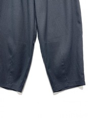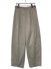 丸いシルエットが鮮烈な印象のワイドパンツ。フロントに施したタックや脇線でボリュームを出しながら、裾周りはダーツをとることですっきりとさせました。メリハリの利いた女性らしいシルエットを設計しています。ウエスト部分はゴム仕様にすることでリラックスな着心地に。フロントの共布テープでサイズの調節も可能なところもポイントです。
