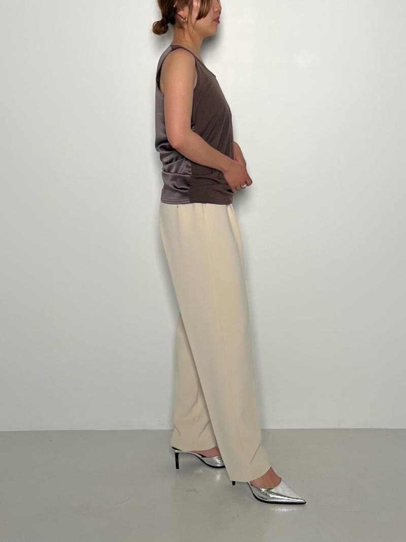 サテンとカットソーを前後ろで異素材を組み合わせることで着回し力を高めた1着に。