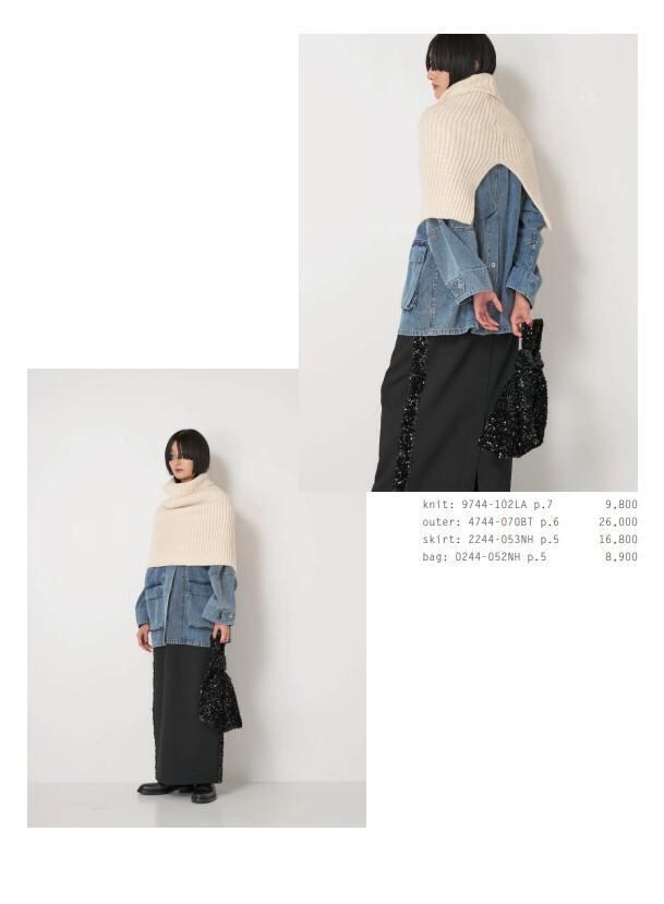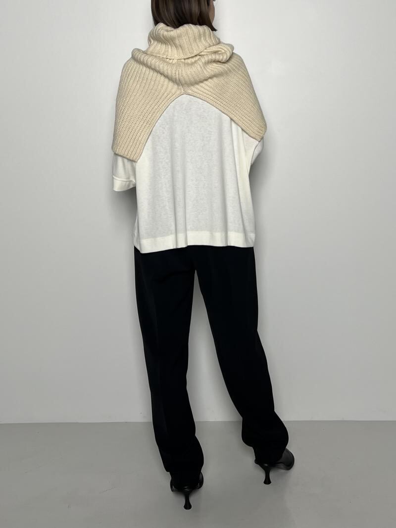 衿ぐりは長めのリブにしているので、折り返してタートルの様に。BCにはスリット明きを施しているのがポイントです。