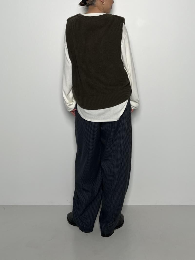 ニットの後ろ身頃は畦編みにして、少し表情感を持たせることで後ろ姿も単調にならないようにデザインしました。落ちついたカラーリングもポイントです。