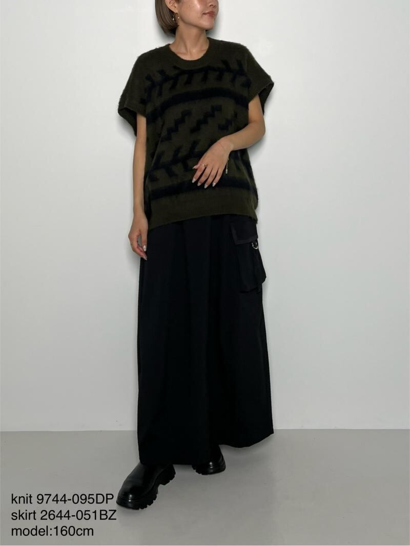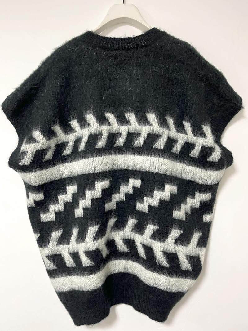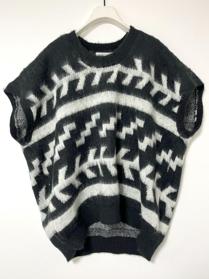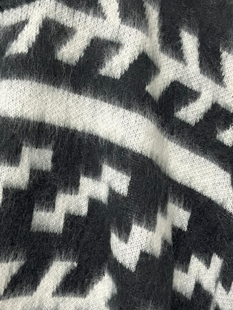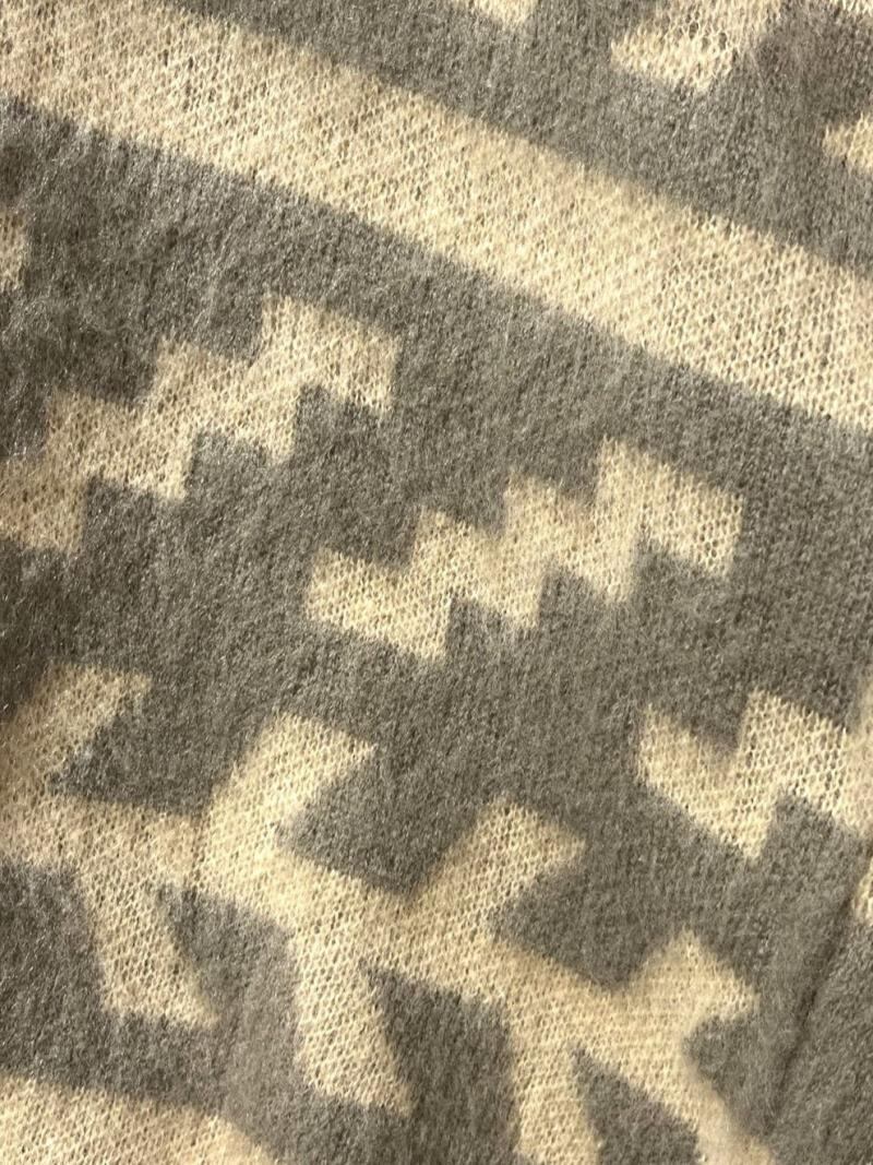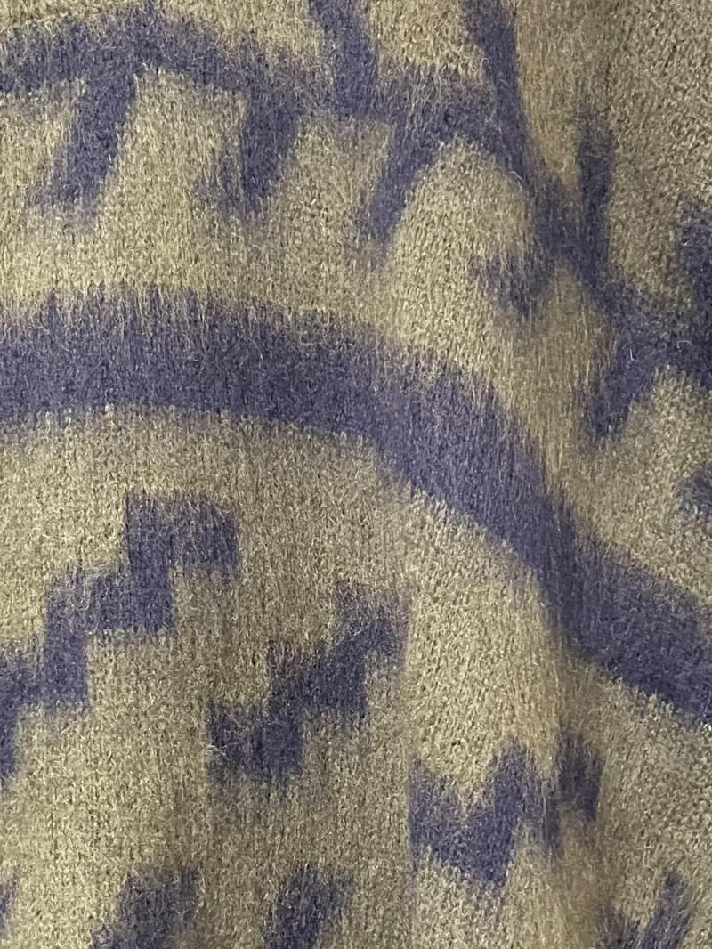 幾何柄に編み上げたジャガードをさらに毛がきする事で、柄が優しい雰囲気に。
