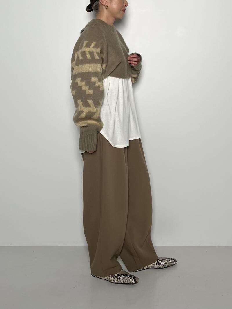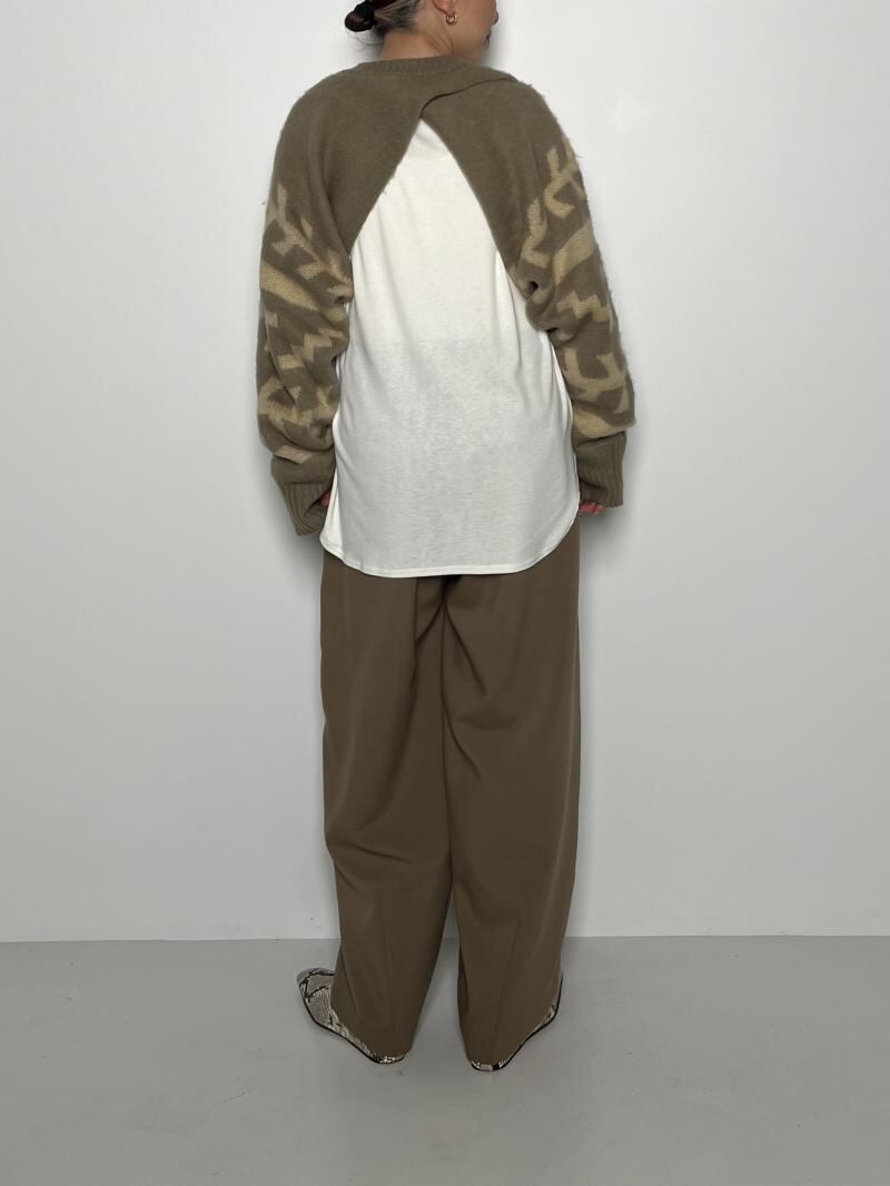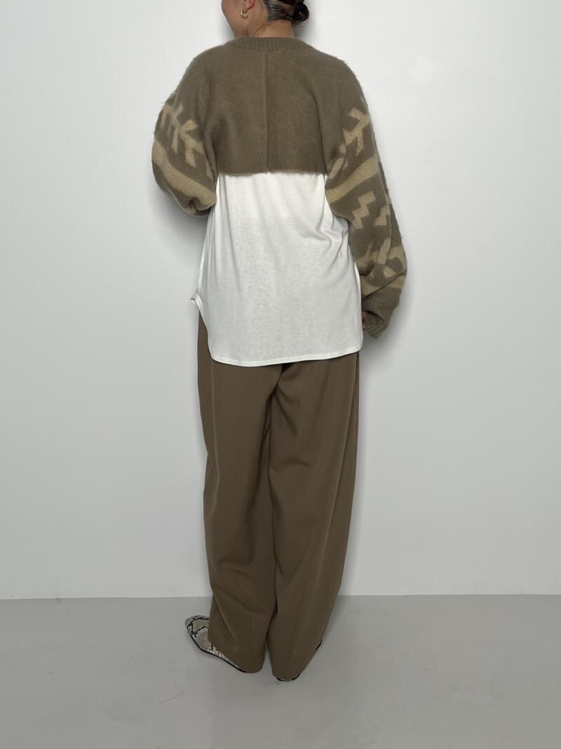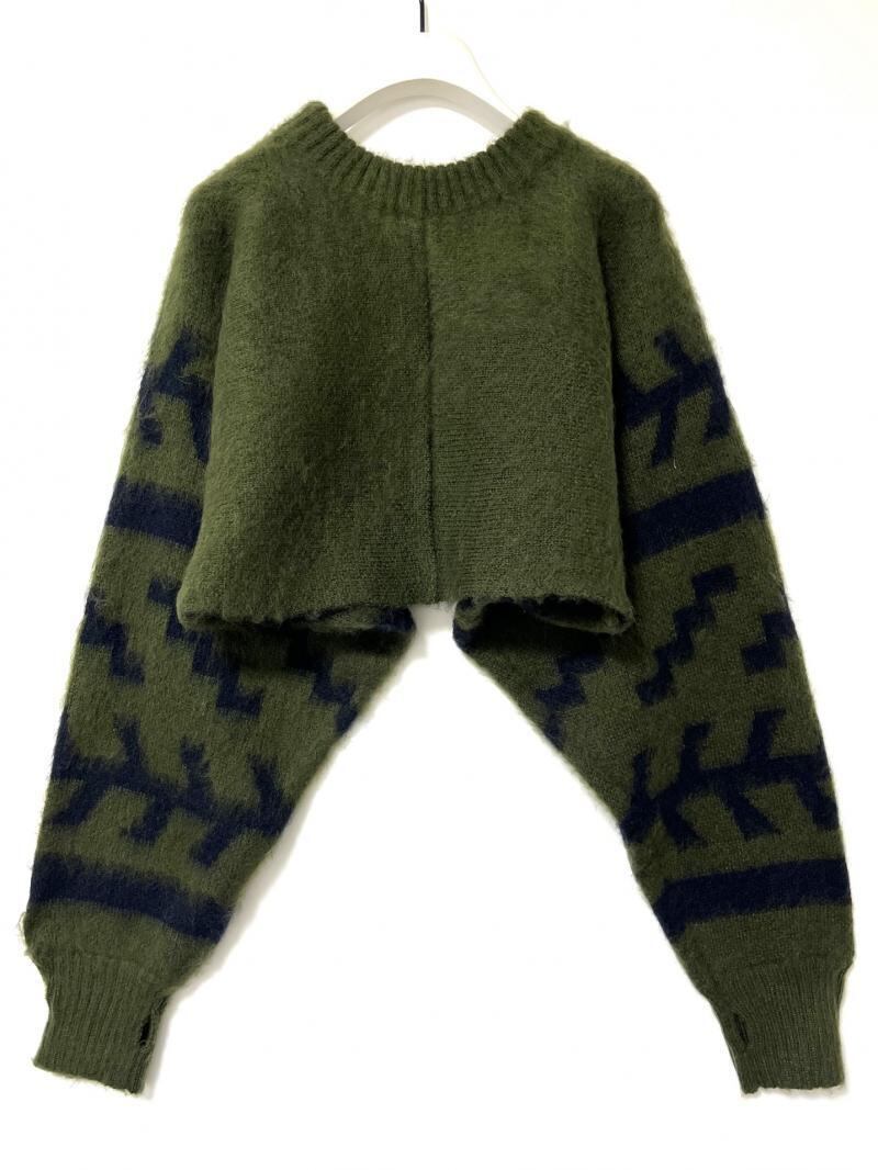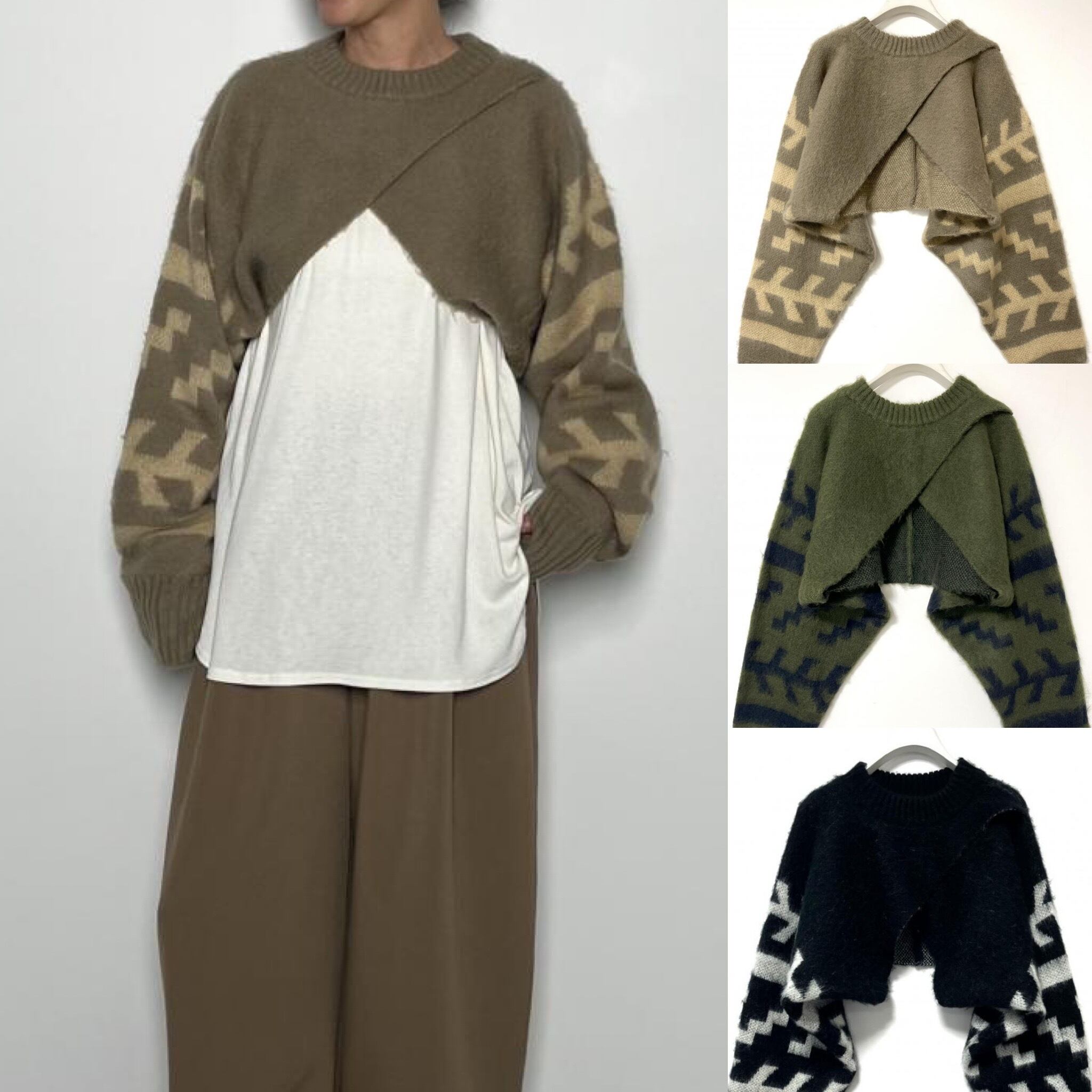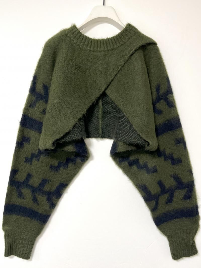 今季の毛がきジャガードニットは、リーフモチーフと幾何を掛け合わせた、古着の様にどこか懐かしい印象の柄に仕上げています。