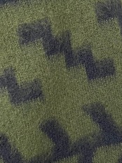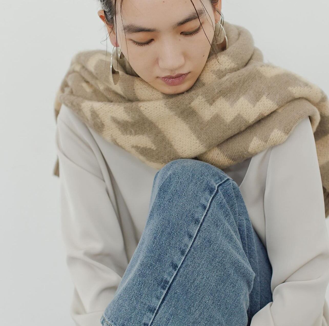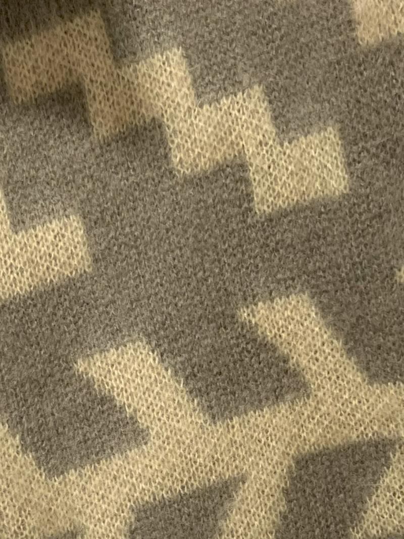 幾何柄に編み上げたジャガードをさらに毛がきする事で、柄が優しい雰囲気に。