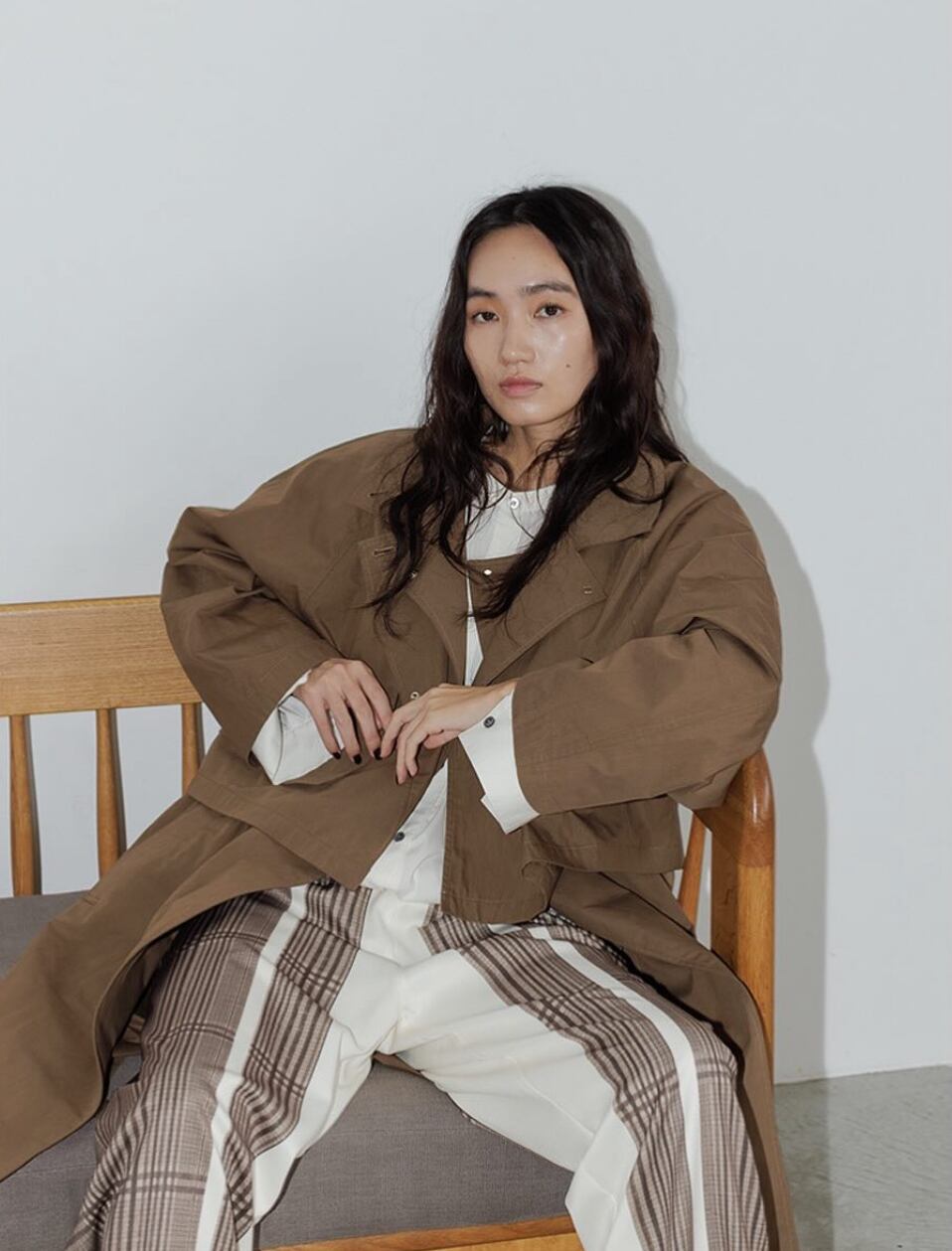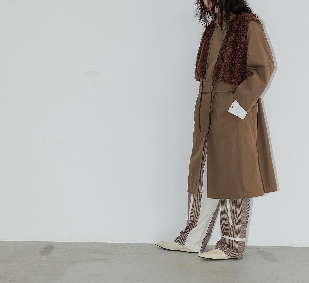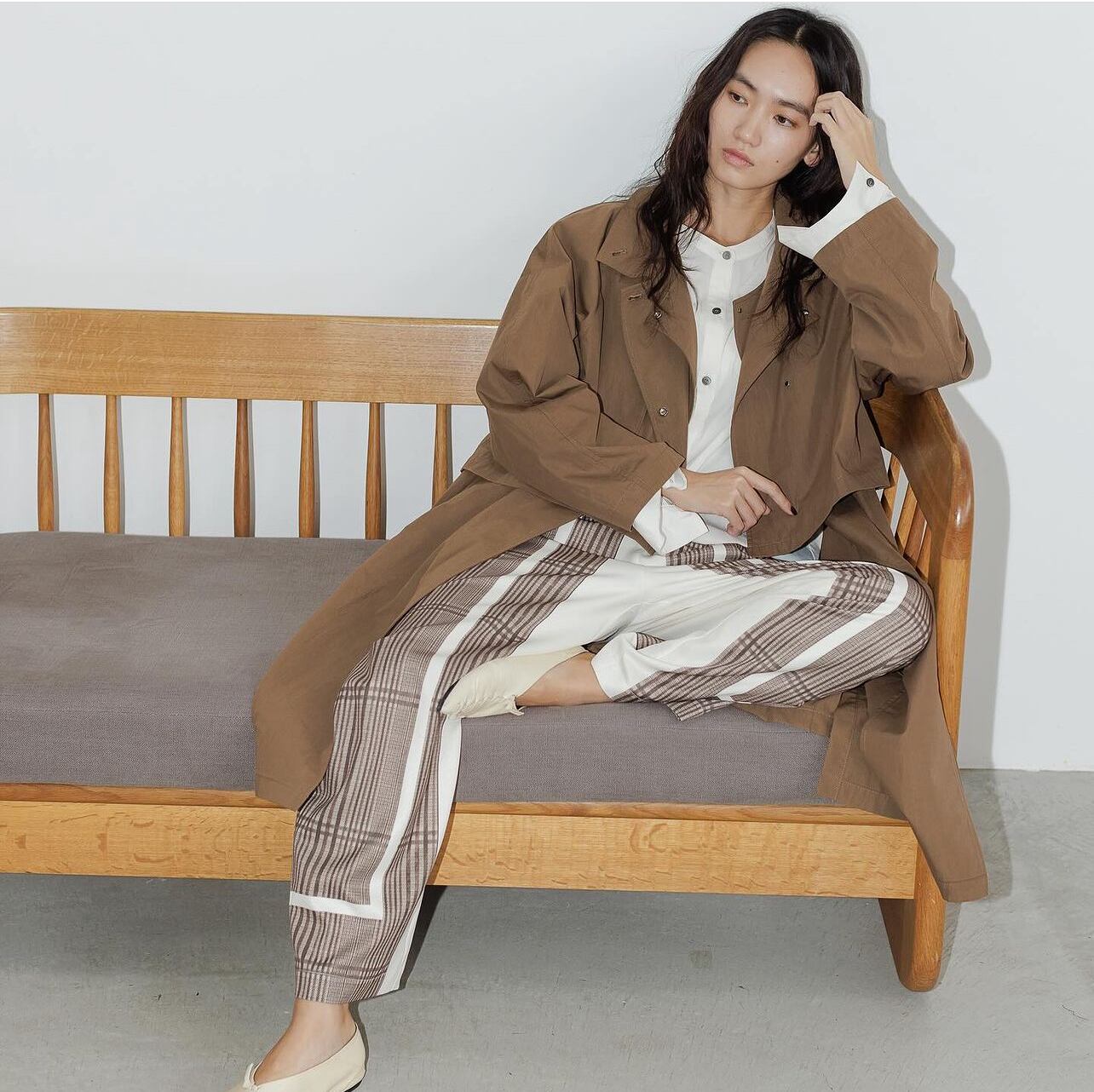 先染のチェックとは違い、軽やかで落ち感のあるパンツなので、