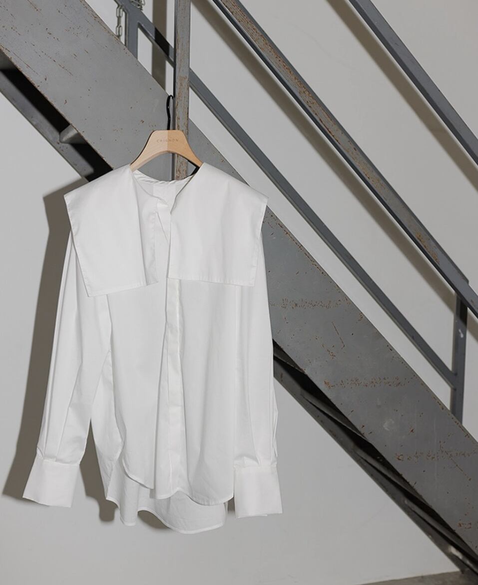ニットやスウェットから衿を出すことでスタイリングのアップグレードが叶います。