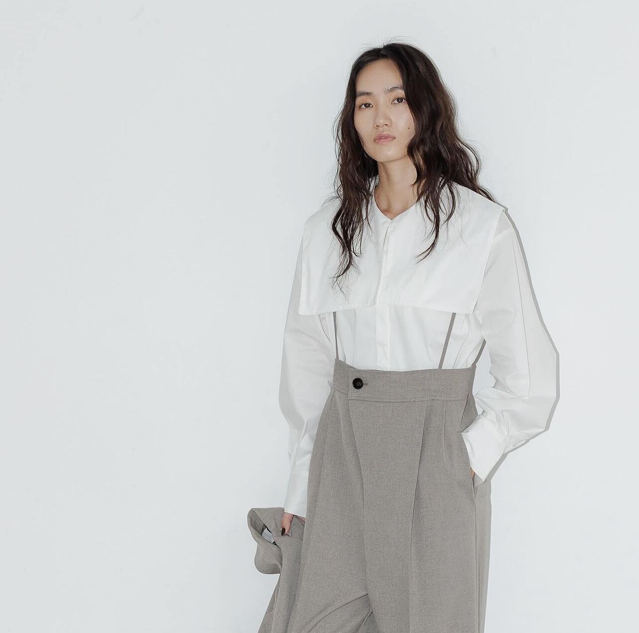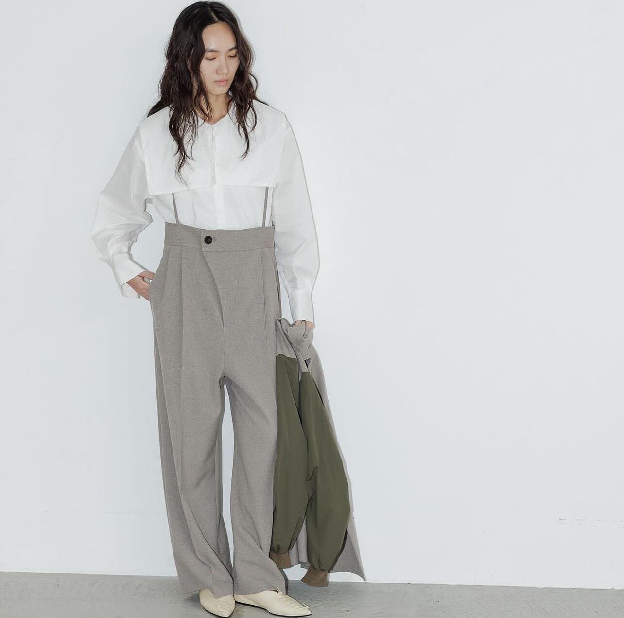 大きな衿はフェミニンになりがちですが、スクエア型にすることでモードな印象をプラス。