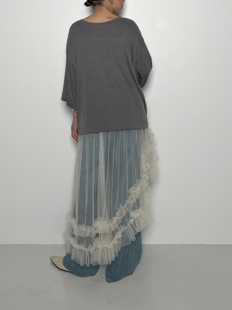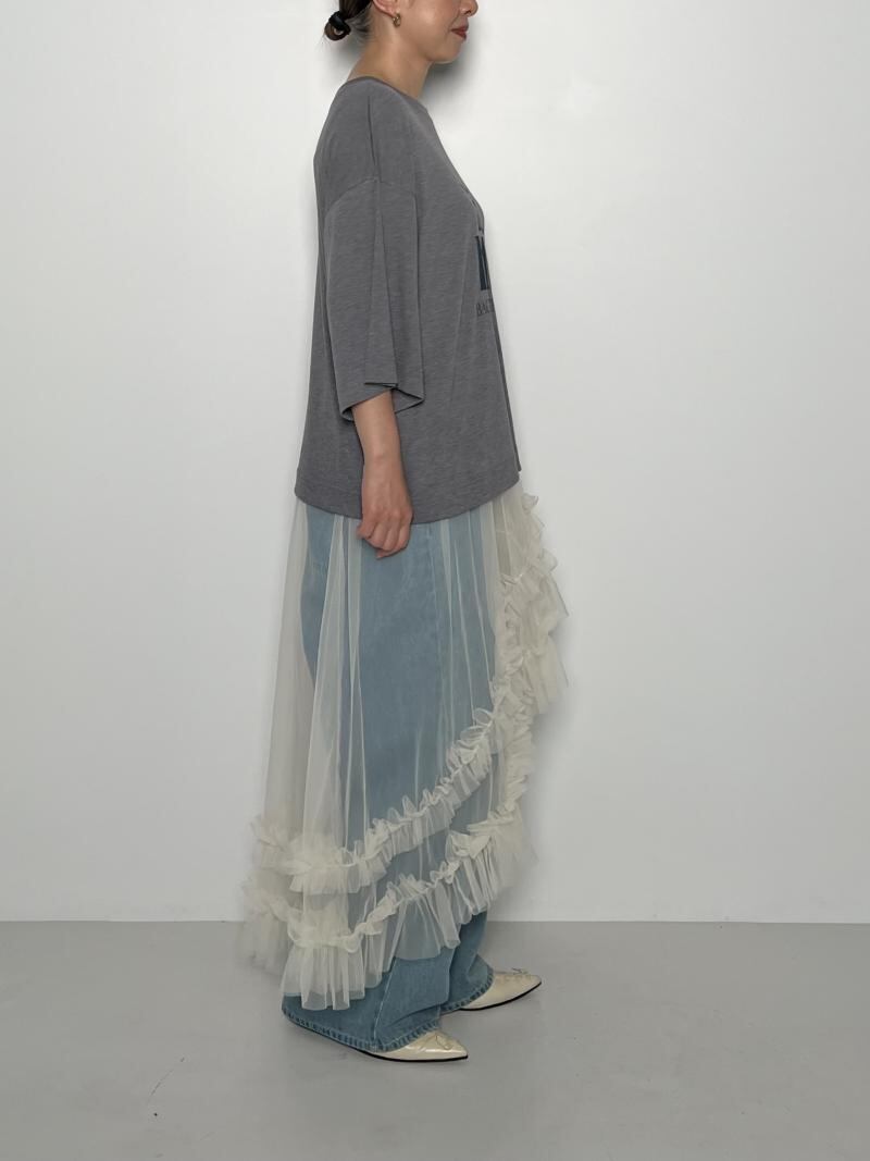 大胆に前後差をつけたシアーチュールスカートは、プラスワンアイテムとして今シーズンのマストハブアイテムです。