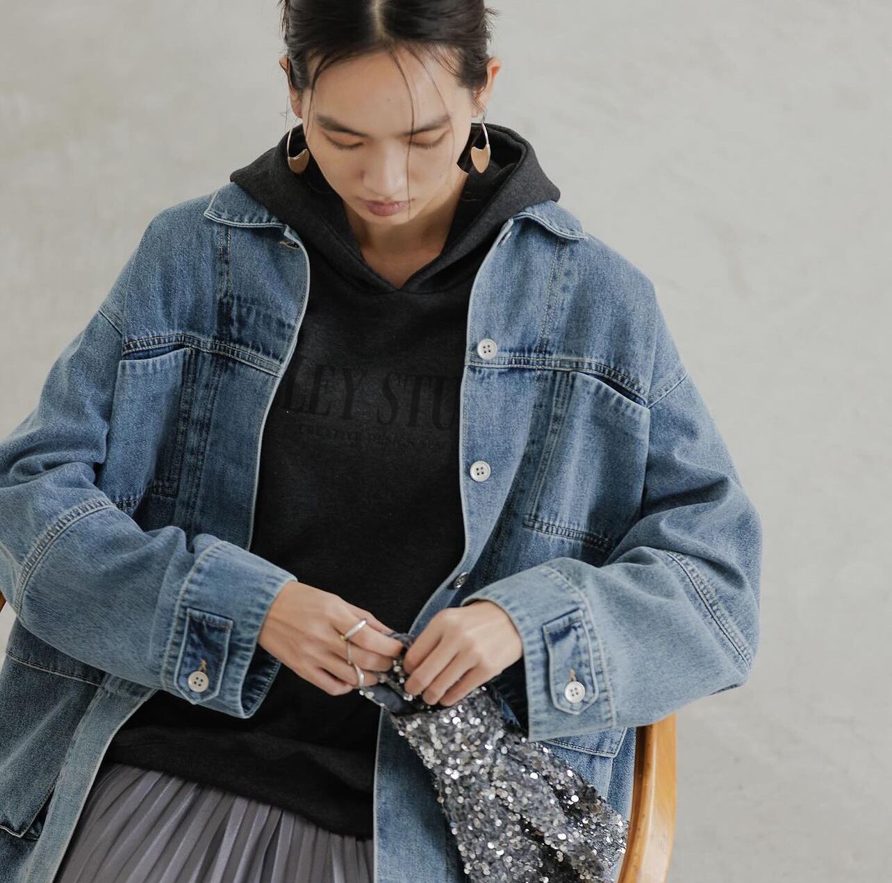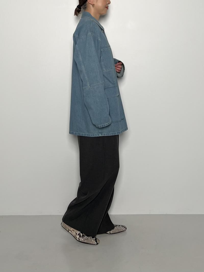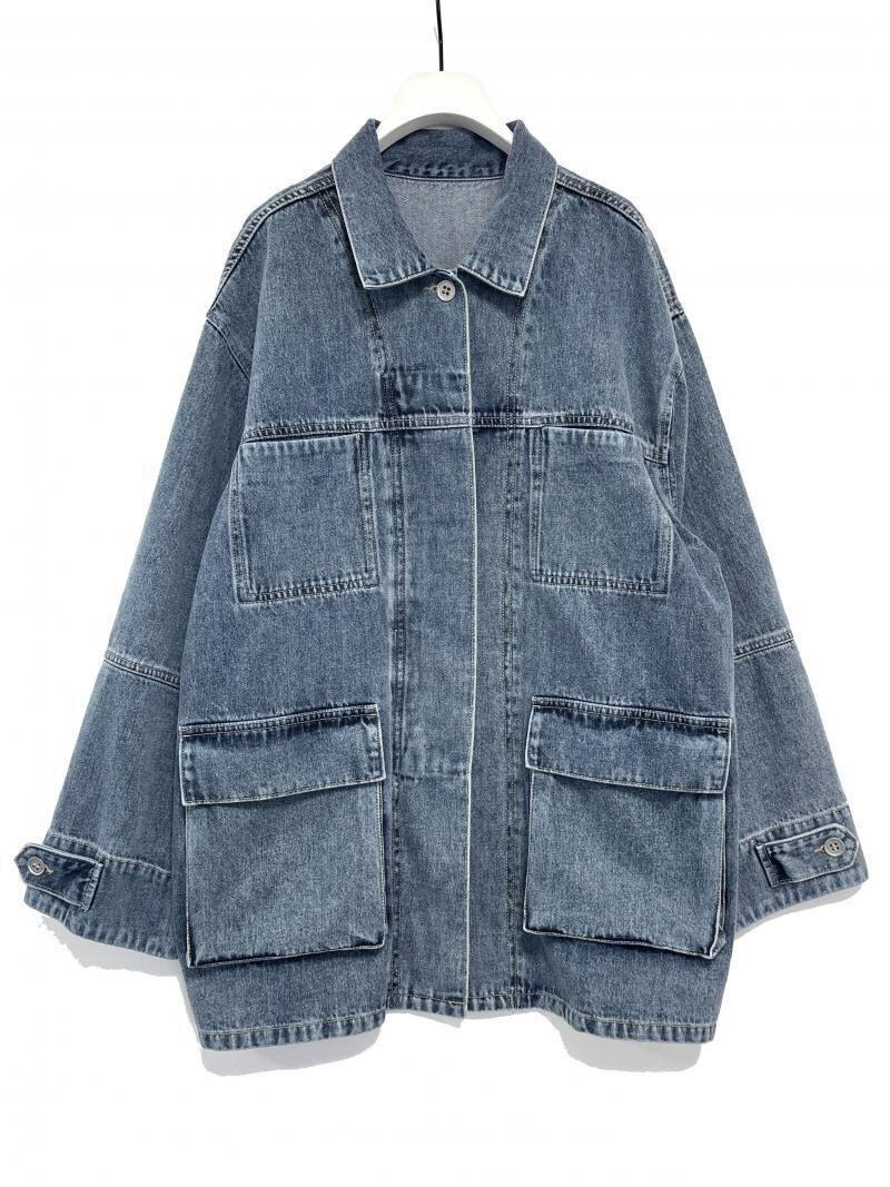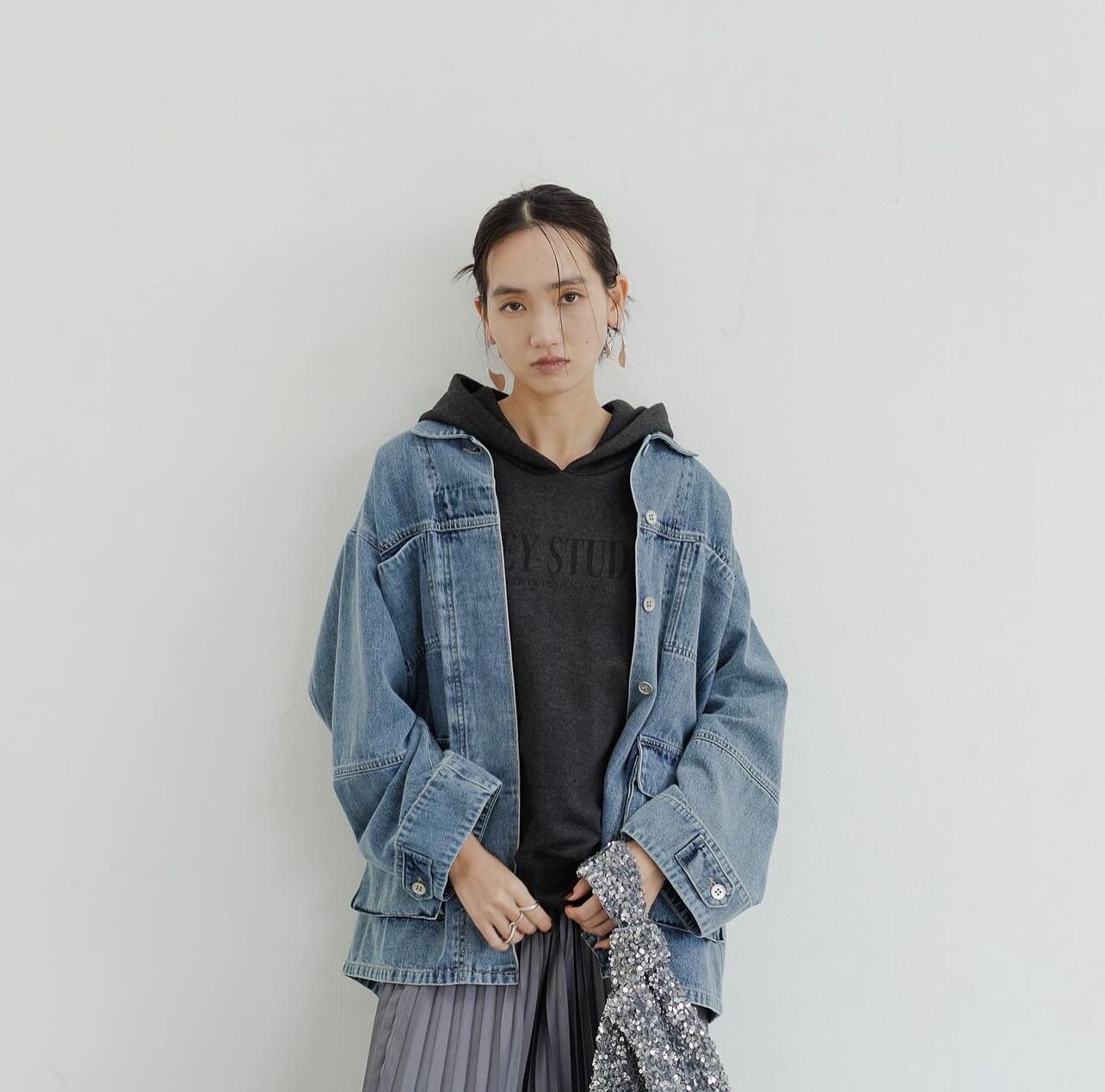 前身頃にはシームポケットと、立体ポケットを施し、ステッチを効かせたワークな印象の1枚です。硬くなりがちなワークジャケットを、ルーズなサイズ感にし、柔らかい生地を使う事で抜け感あるジャケットに仕上げています。
