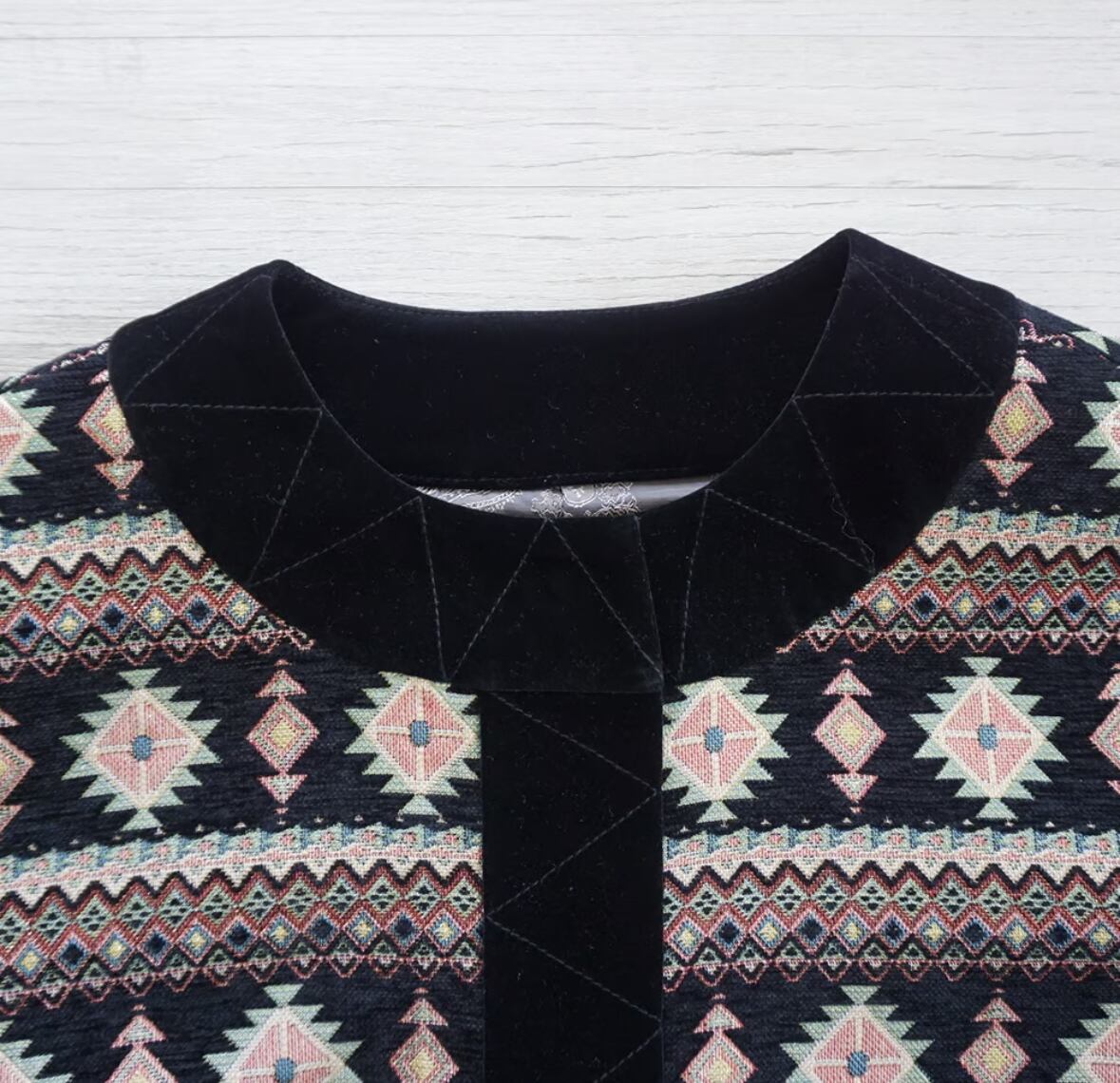 ゴブランの織りが繊細で美しい。カラーの糸に金糸が入っていて眺めるだけでも本当に綺麗な素材だと思います。ぽってりとしたベルベット調の部分もあり、暖かさのある素材です。縁取りはベルベットで、ベラベラしない仕立てにしています。表には柄を合わせたパッチポケット。パッチポケットは目立つと少し幼い印象になりますが、ピッタリと柄合わせをしているので、ポケットは目立たず、とても入れやすく使いやすいようにしました。