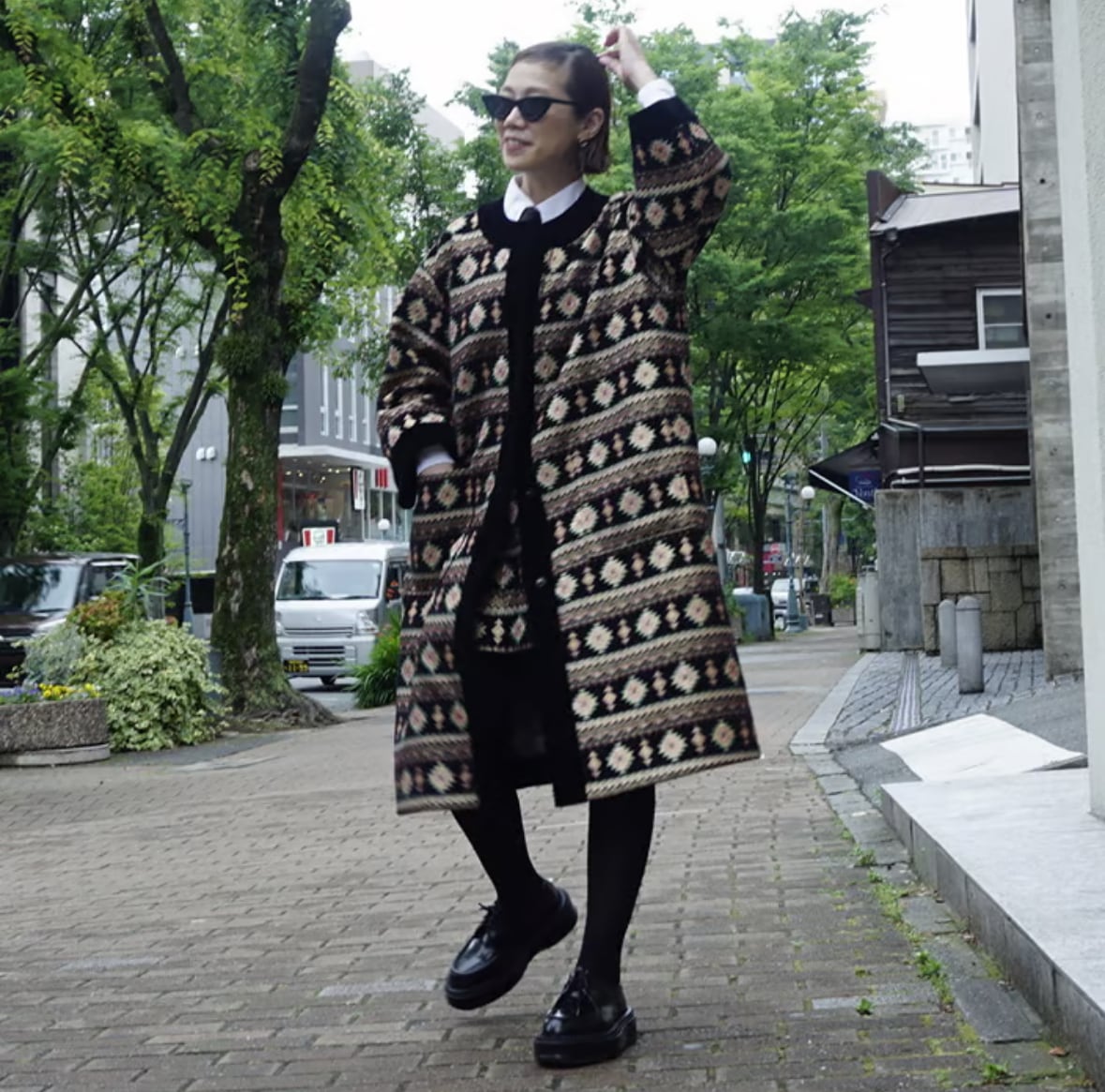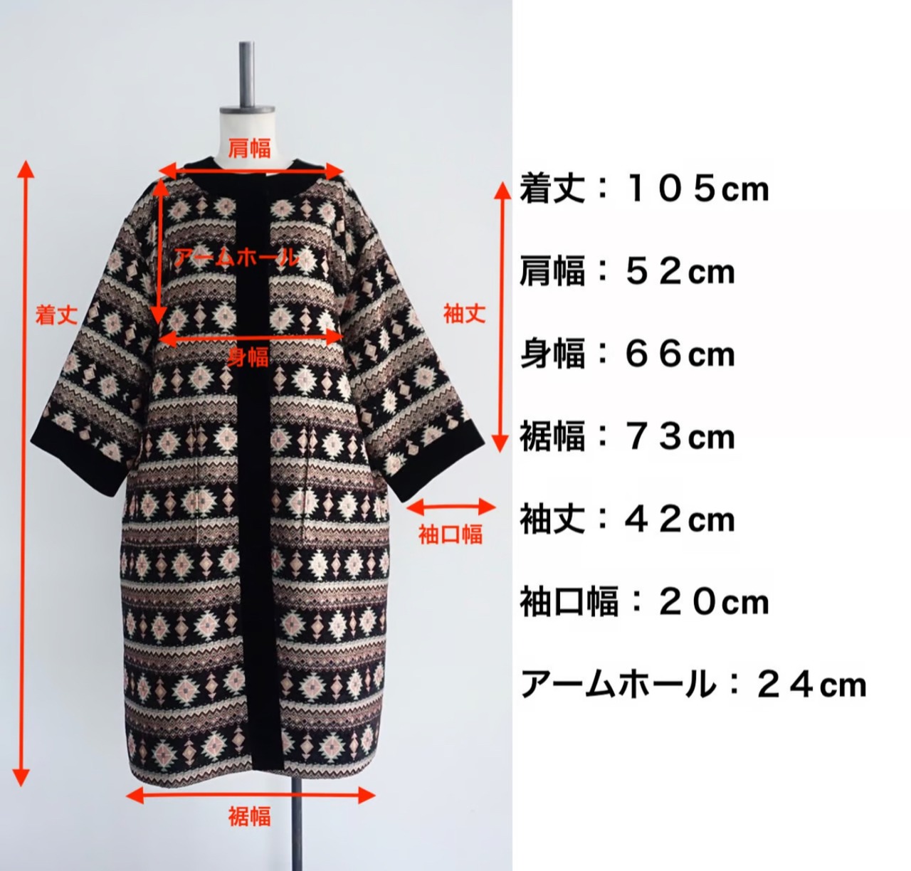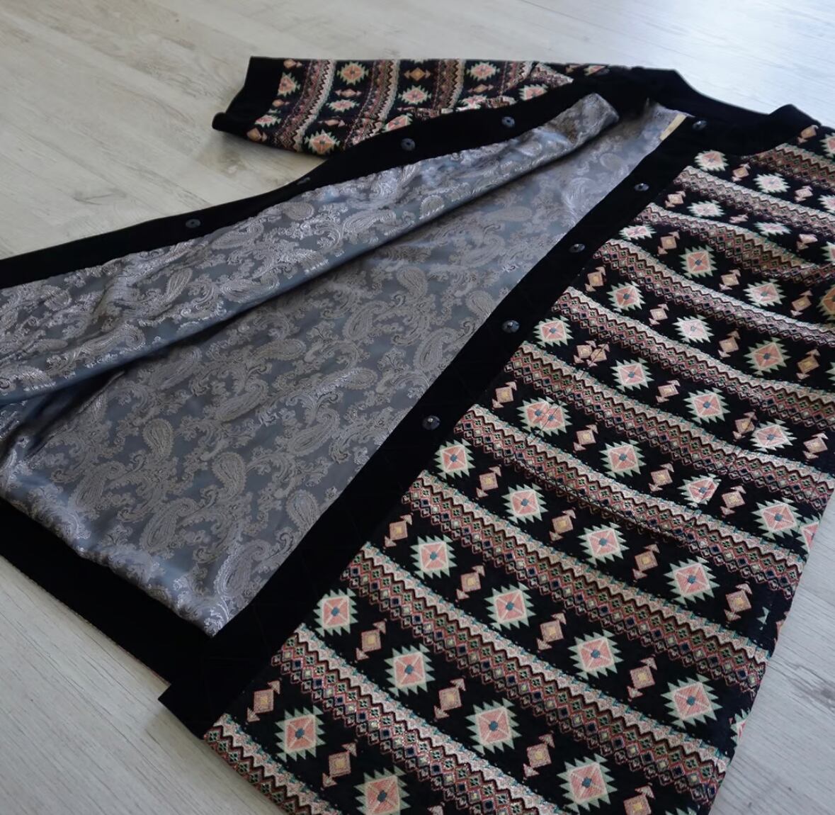 身頃が大きめでゆったりしています。秋口、春、冬に羽織りやすいコート。ミセスっぽくならないように、袖は短めにしてポケットを付けました。裏地にもこだわり、織りで表現されたペイズリー柄を裏地にして少し贅沢感のある裏地。