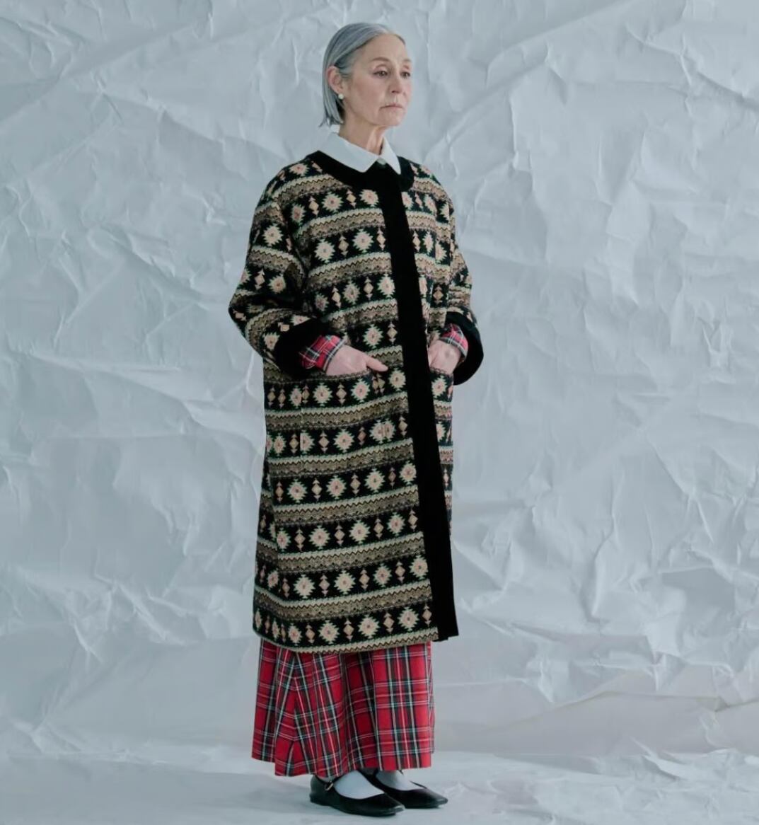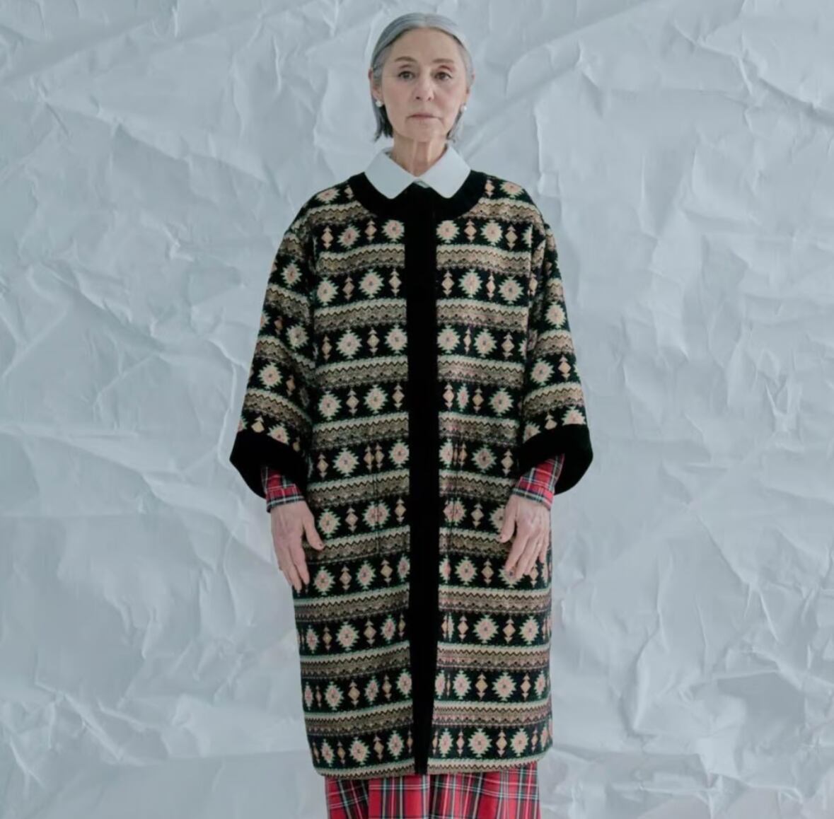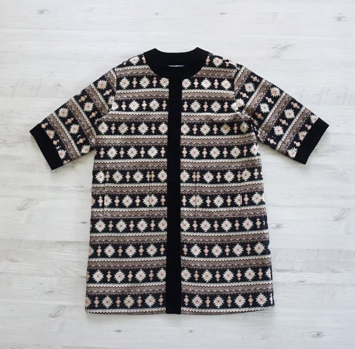身頃が大きめでゆったりしています。秋口、春、冬に羽織りやすいコート。ミセスっぽくならないように、袖は短めにしてポケットを付けました。裏地にもこだわり、織りで表現されたペイズリー柄を裏地にして少し贅沢感のある裏地。