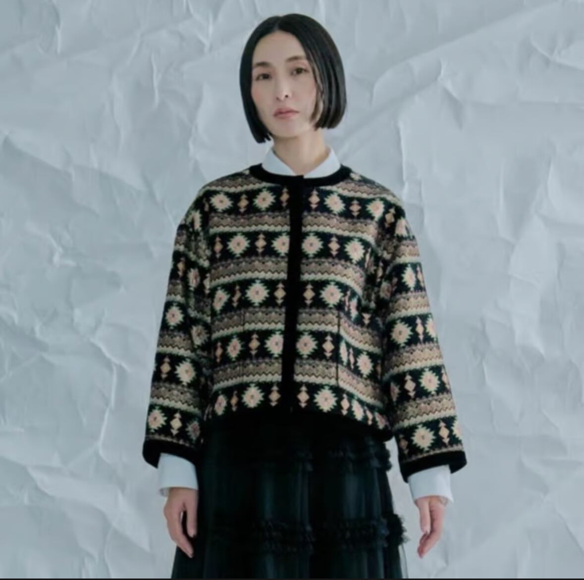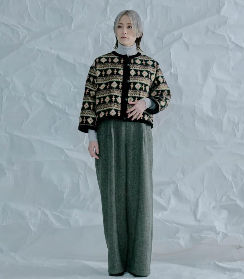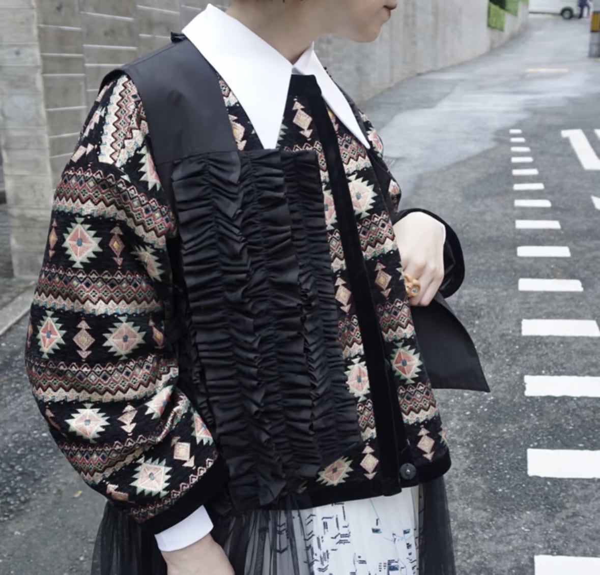 といっても実際はあまり短いわけではなく、身頃がかなり大きめになっているので短めに見えます。リッチなゴブラン素材のため、今回は袖はタイトにせず太め、短めにしています。デザイン的には、少しカジュアルなシルエットです。