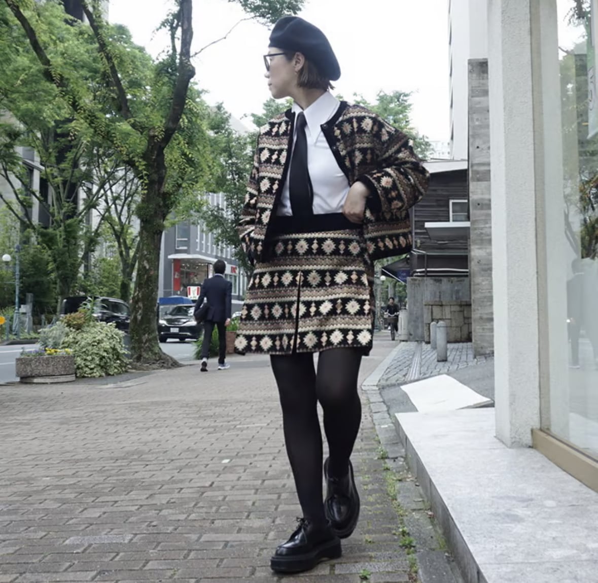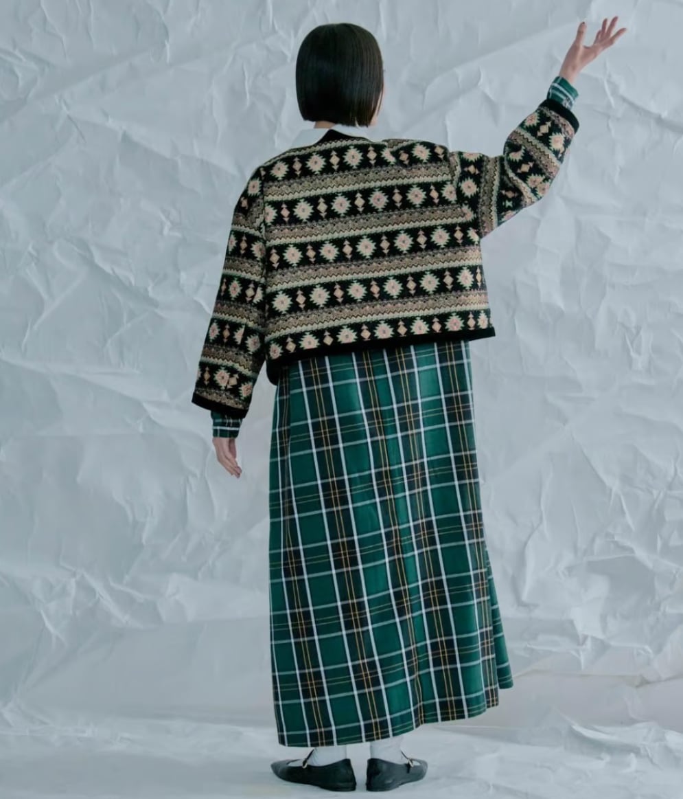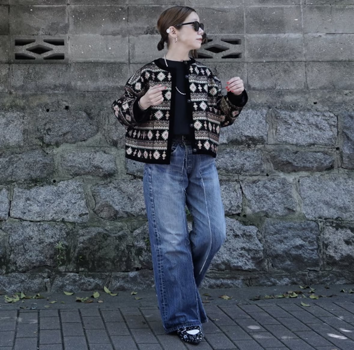 といっても実際はあまり短いわけではなく、身頃がかなり大きめになっているので短めに見えます。リッチなゴブラン素材のため、今回は袖はタイトにせず太め、短めにしています。デザイン的には、少しカジュアルなシルエットです。