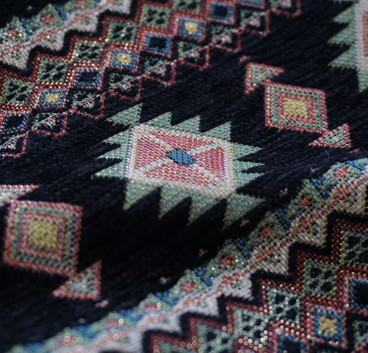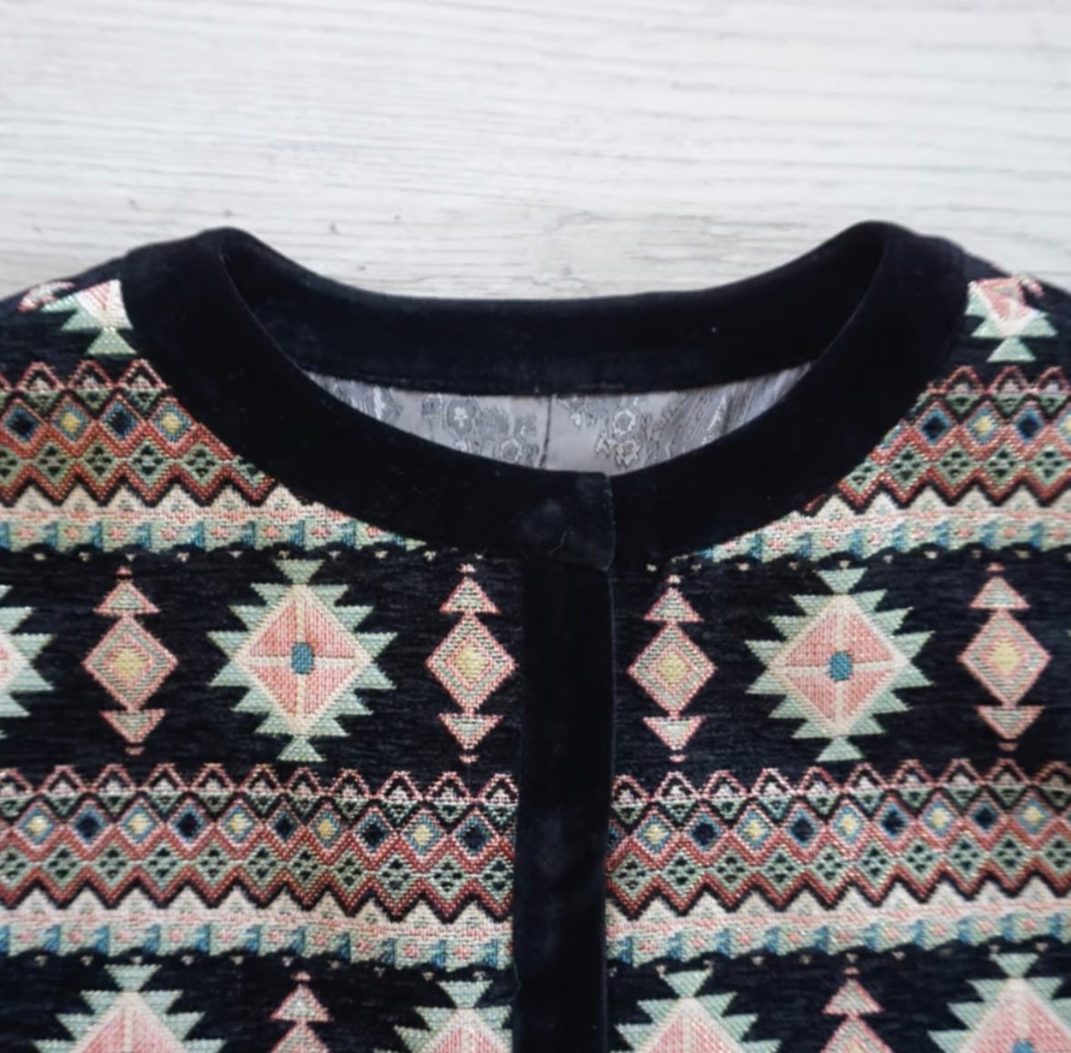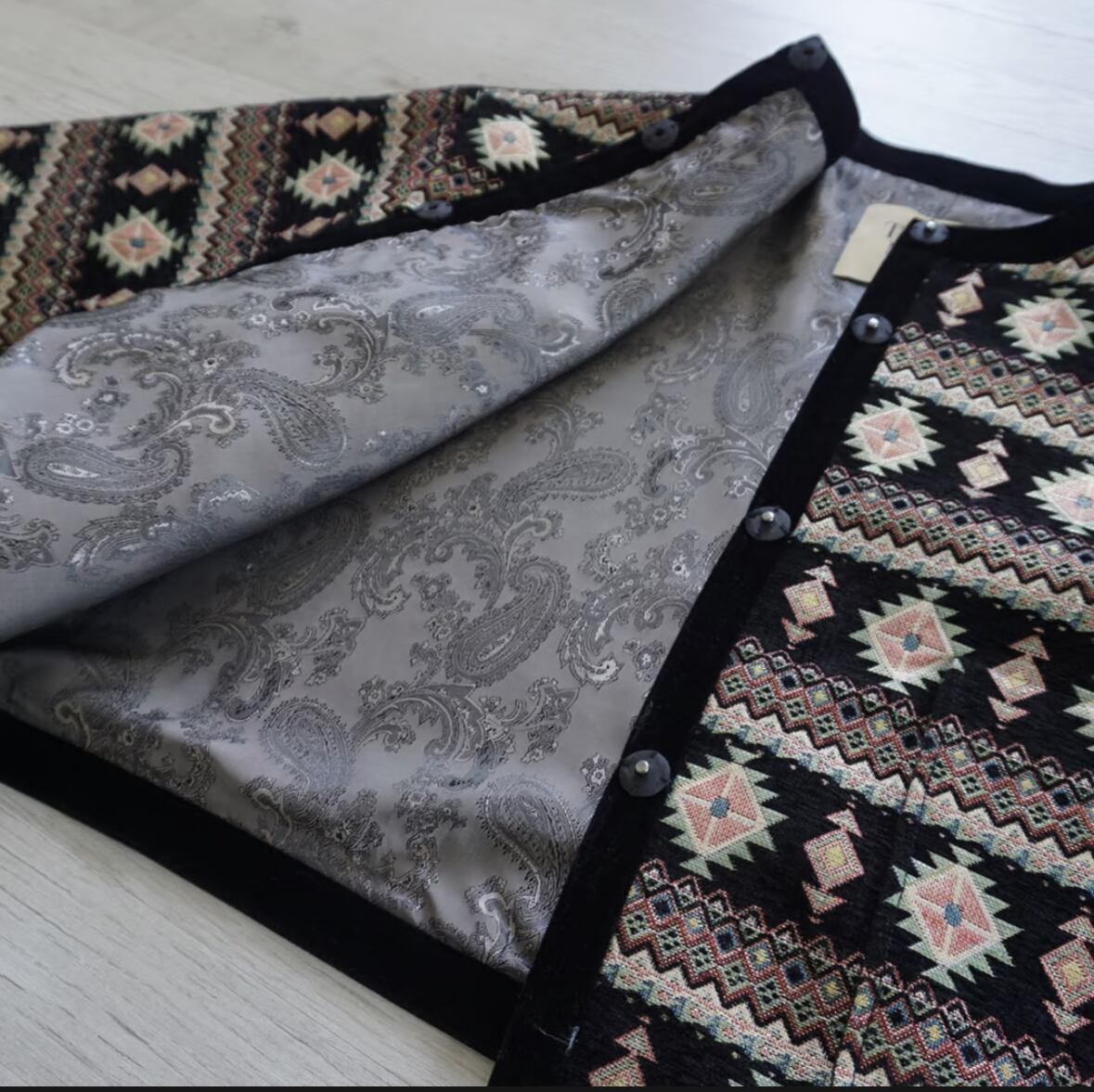 沢山の生地をみてきましたが、特に今回は生地自体にとても魅了されデザインをしました。他にも沢山のデザインを候補としていましたが、ゴブランの柄面積をたっぷりと使う贅沢なデザインになったと思います。パイピングはベルベット。コートと同じく裏地はペイズリー柄のジャガードです。同じく柄合わせしたパッチポケットがとても使いやすいです。