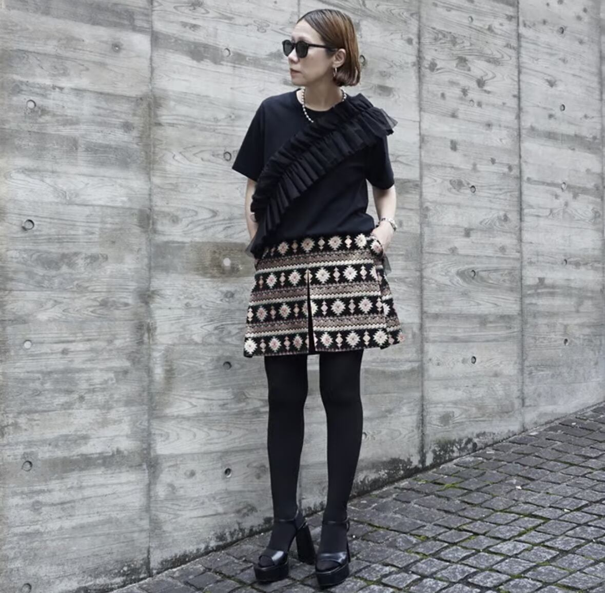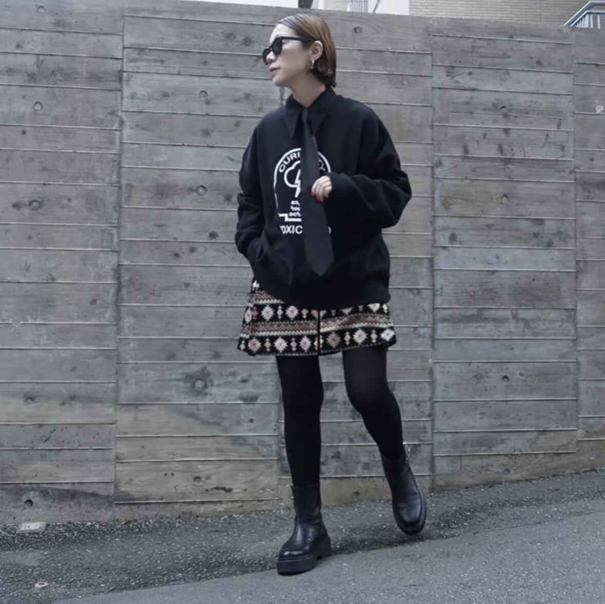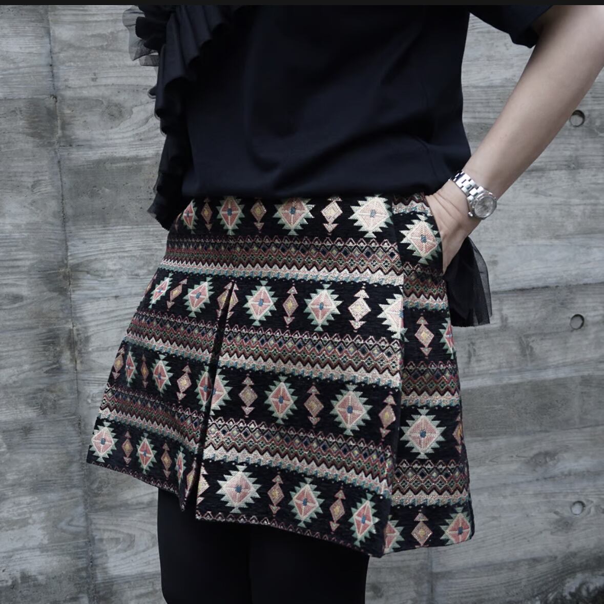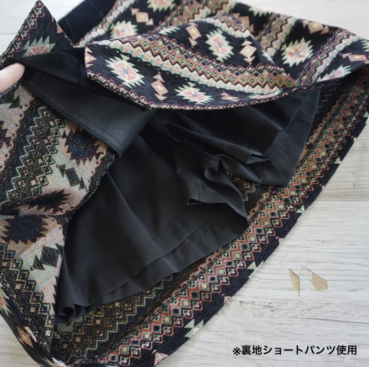 広がりがあります。広がりがあるので、足がほっそりと見える視覚効果があります。外側はスカート仕様で、裏地がパンツになっているので、安心して着用してもらえると思います。ミニボトムがお好きな方はぜひチャレンジしてもらいたいです。